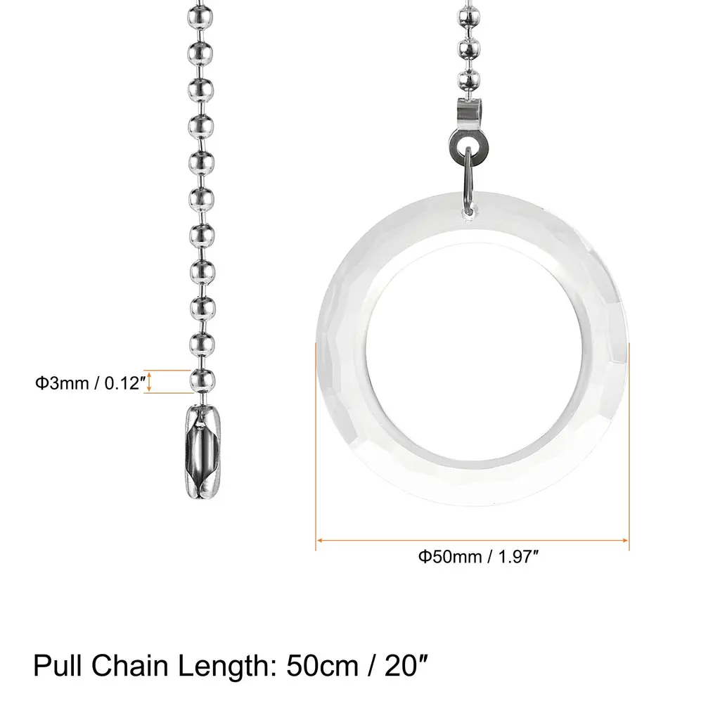 Pull Chain Length: 50cm / 20inch; Circle Diameter: 50mm / 1.97inch.Made of crystal and nickel plated ball chain, beautiful and durable.Replacement for broken or outdated pull chain.You can easily attach it to the existing chain from your lighting or fan.Used for Lighting, Fans, Ceiling Fans, Ventilation and etc.Features:Made of crystal and nickel plated ball chain, beautiful and durable.Replacement for broken or outdated pull chain.Used for Lighting, Fans, Ceiling Fans, Ventilation and etc.You can easily attach it to the existing chain from your lighting or fan.Specifications:Material: Crystal, Nickel-plated IronColor: Silver Tone, ClearPull Chain Length: 50cm / 20inchCircle Diameter: 50mm / 1.97inchBead Dia: 3mm / 0.12inchPackage Contents:1 x Pull Chain
