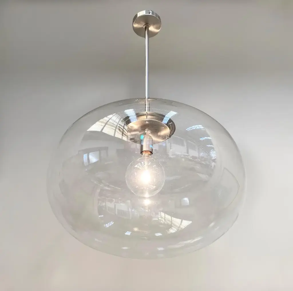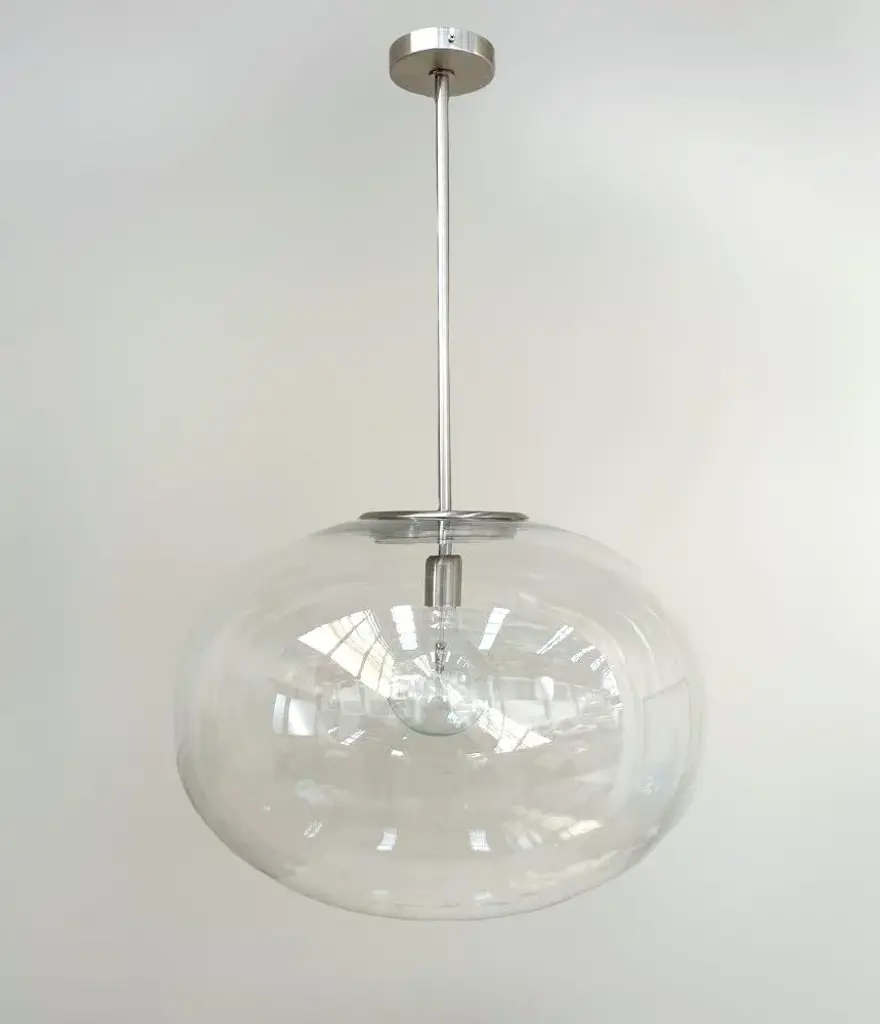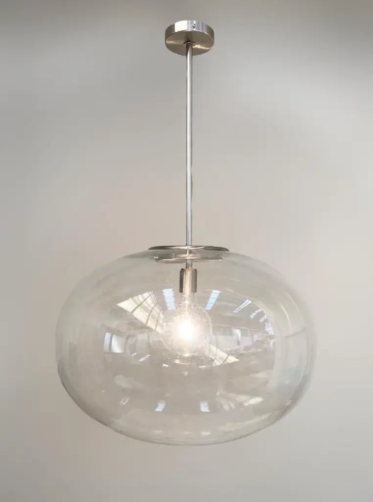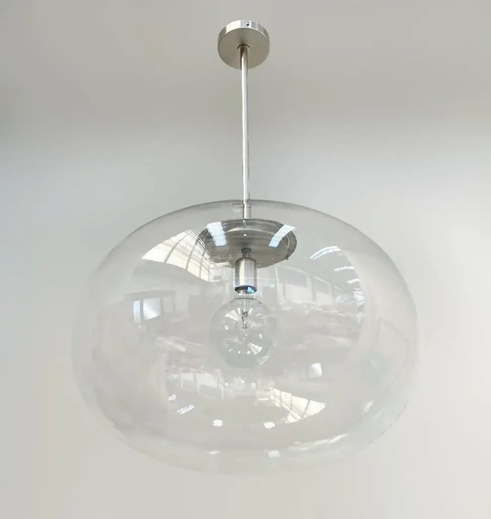 Italian pendant with a large clear Murano pebble glass shade mounted on brass frame in satin nickel finish / designed by Fabio Bergomi for Fabio Ltd / Made in Italy 1 light / E26 or E27 type / max 60W