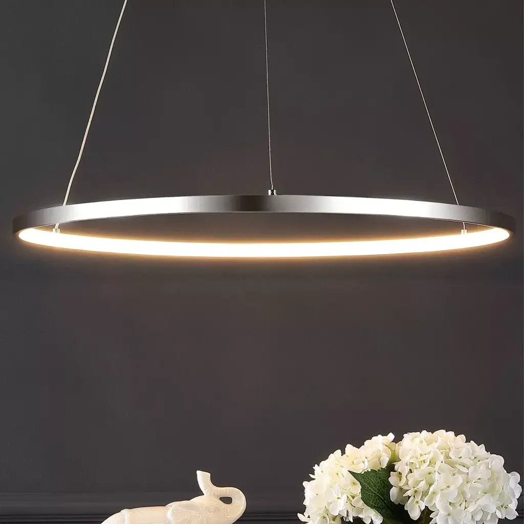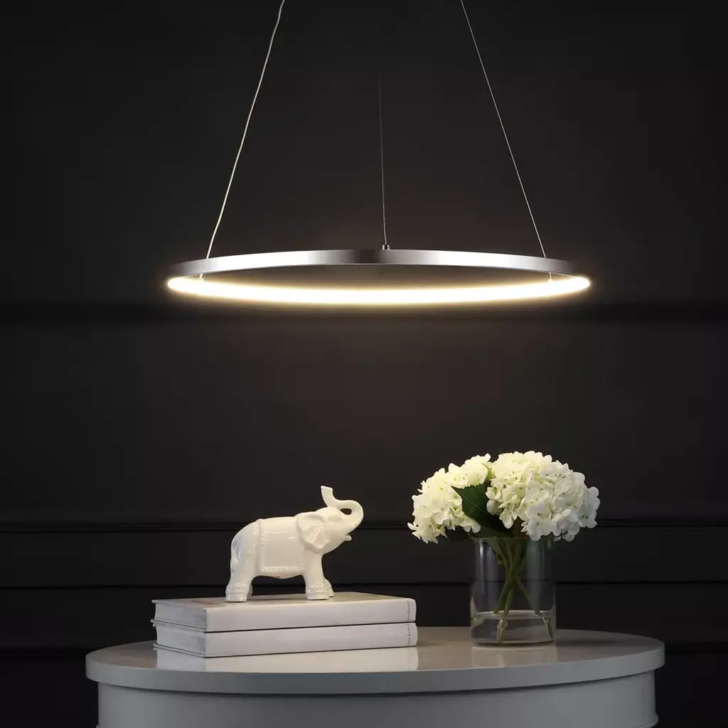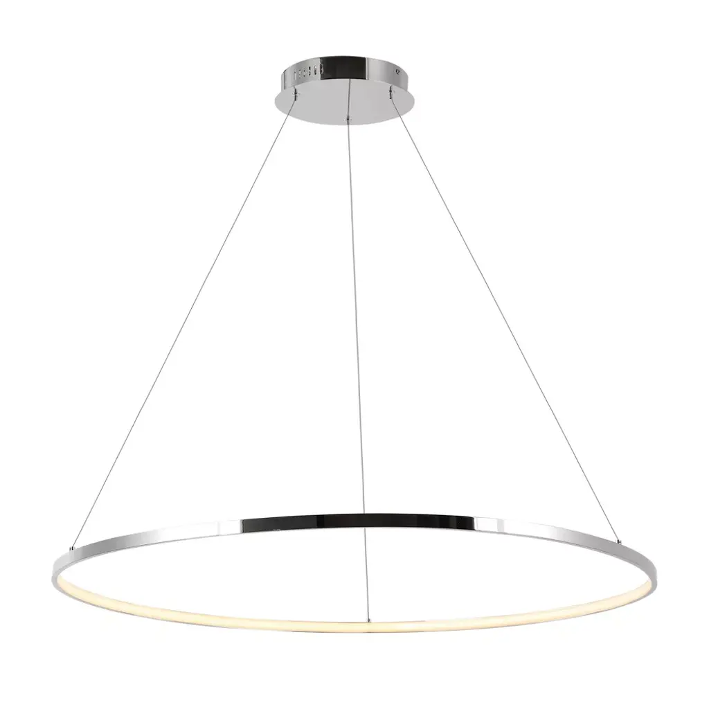 Classic geometry gets a modern chrome finish in this single hoop pendant/chandelier. Height-adjustable single-tier ceiling LED lighting that's not too robust but not too inconspicuous either; works best for ceilings up to twelve-feet high. Fusing coastal and futuristic elements, this mid-air circular float of a pendant is among the best modern lighting updates for your home. ETL Listed. Integrated 34W LED bulbBefore cleaning any lamp shade or fixture, disconnect the power source. Wipe with a soft, dry cloth. Avoid the use of chemicals and household cleaners as they may damage the finish.