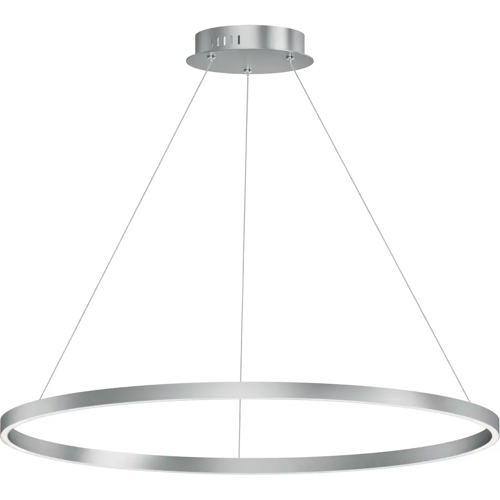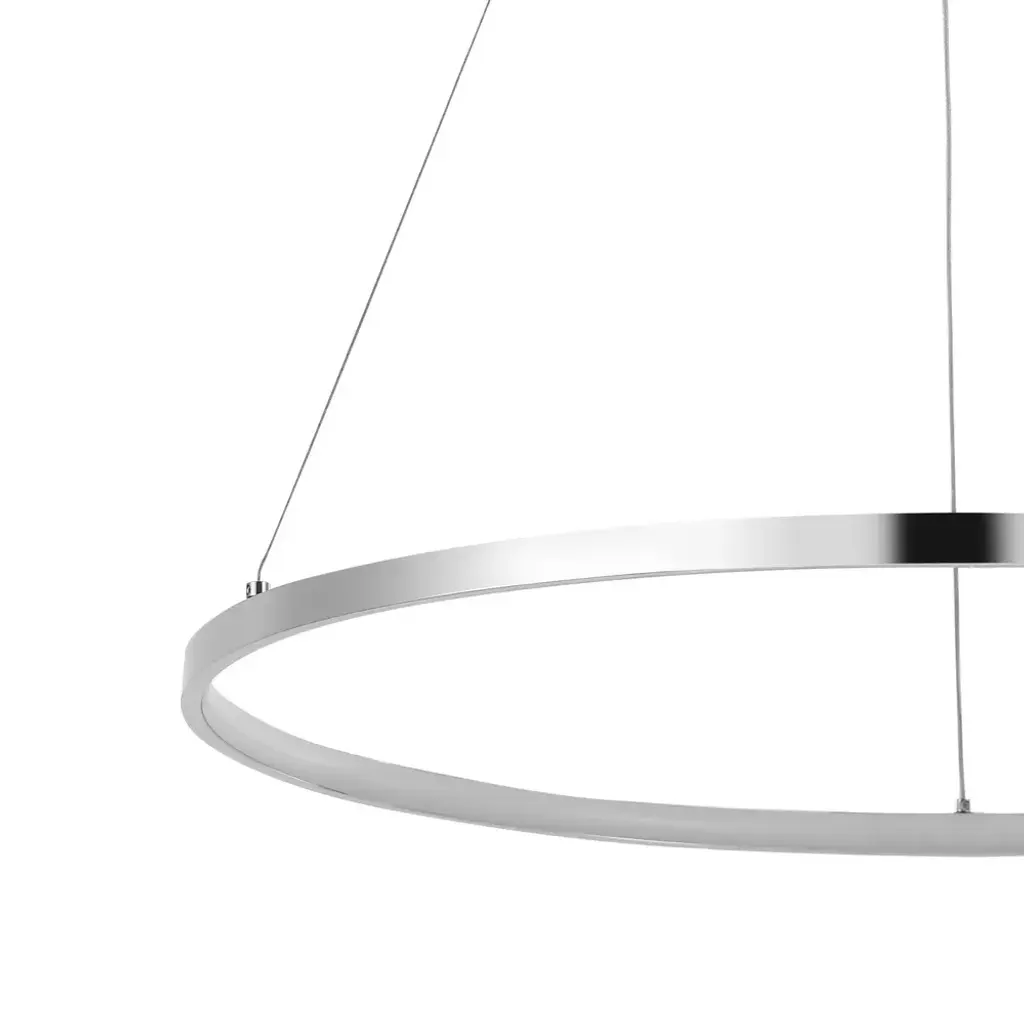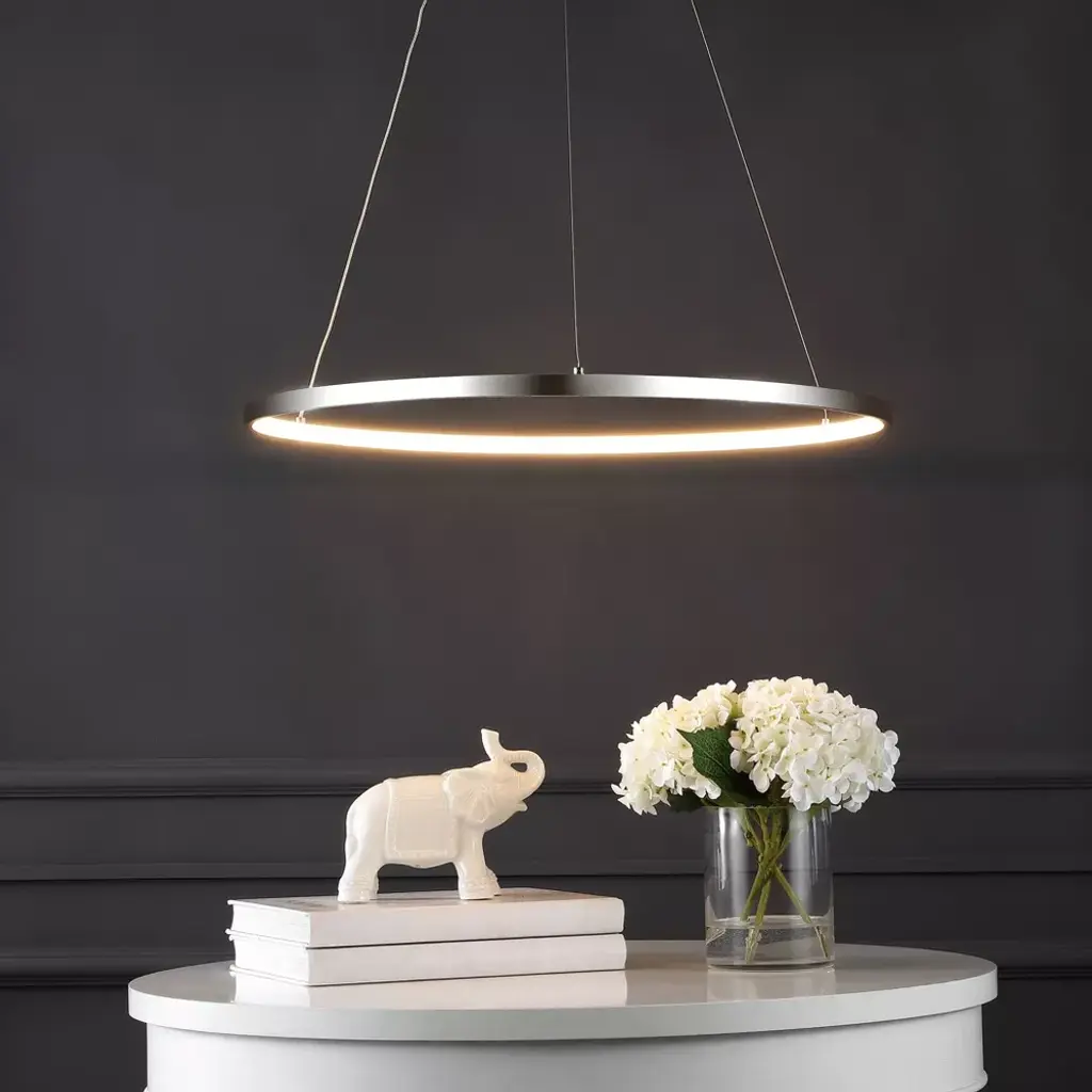 Classic geometry gets a modern chrome finish in this single hoop pendant/chandelier. Height-adjustable single-tier ceiling LED lighting that's not too robust but not too inconspicuous either; works best for ceilings up to twelve-feet high. Fusing coastal and futuristic elements, this mid-air circular float of a pendant is among the best modern lighting updates for your home. ETL Listed. Integrated 34W LED bulbBefore cleaning any lamp shade or fixture, disconnect the power source. Wipe with a soft, dry cloth. Avoid the use of chemicals and household cleaners as they may damage the finish.