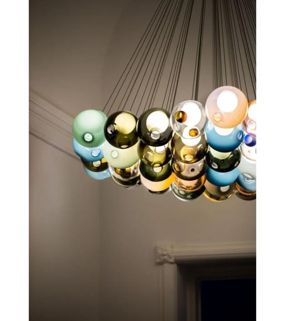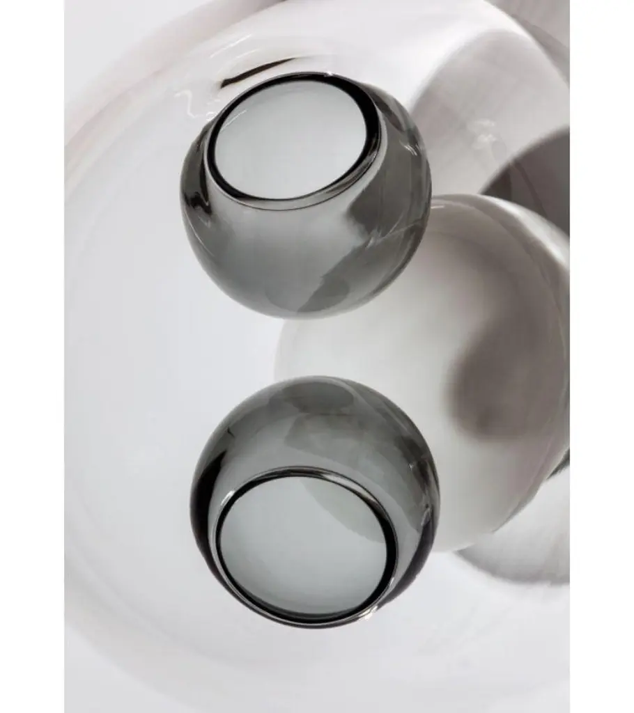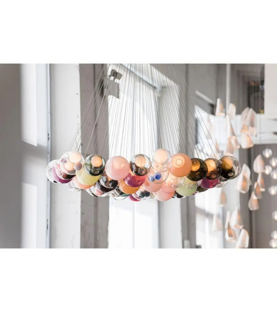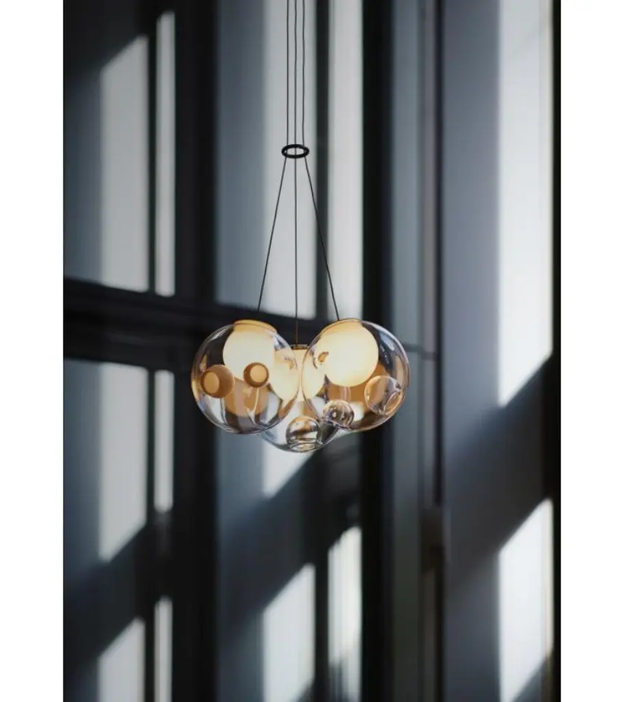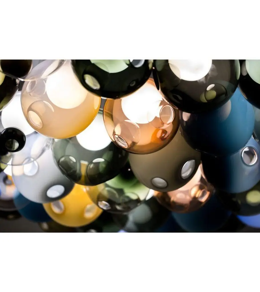 28.3 Cluster pendant lamp by BocciDimensions: diameter 33 x height 300 cm Materials: blown glass, braided metal coaxial cable, electrical components, brushed nickel canopy.Lamping: : 1.5w LED or 20w xenon. Non-dimmable. Coax: adjustable. 3000mm (10’) standard / up to 30500mm (100’) maximumAlso available in different sizes. All our lamps can be wired according to each country. If sold to the USA it will be wired for the USA for instance.28.3 is a cluster of three 28 pendants hung from a round canopy. Thependants hang in the shape of a hexagonal bouquet, bundled together by anadjustable ring, which changes the curvature of the piece and its proportionalreading. 28 is an exploration of specificity in manufacturing. Instead of designing formitself, here the intent was to design a system of making that yields form.Individual 28 pendants result from a complex glass blowing technique whereby air pressure is intermittently introduced into and then removed from a glass matrix which is intermittently heated and then rapidly cooled. The result is a distorted spherical shape with a composed collection of imploded innershapes, one of which acts as a shade for the light source.Standard 28s are made with clear glass exterior spheres and milk whiteinterior lamp holder cavities. 28s are possible with infinite versatility in colorcompositions, sizes, and shapes.Bocci is a design and manufacturing company based in Vancouver and Berlin. Founded in 2005 under the creative directorship of Omer Arbel, Bocci is committed to fostering a lateral and open-ended relationship between creative direction and craft. The company launched with one lighting design, ‘14’, which became an instant classic and remains a design staple and bestseller. Bocci’s growing portfolio of sculptural lighting is developed, engineered, and fabricated in-house, through an infrastructure calibrated to provide full control over technique, quality, and scale.In 2015, Bocci transformed a historic Berlin building into a showroom and archive. ‘Bocci 79’ inhabited a 2,200 m² / 23,600 sq ft former courthouse, constructed in 1896, and showcased over a decade of works by Omer Arbel, ranging from pieces in progress, prototypes, and ideas, to the complete range of catalog pieces developed for Bocci.Bocci 79 closed in June 2020 and we are currently working on our new, permanent Berlin showroom which will open soon.