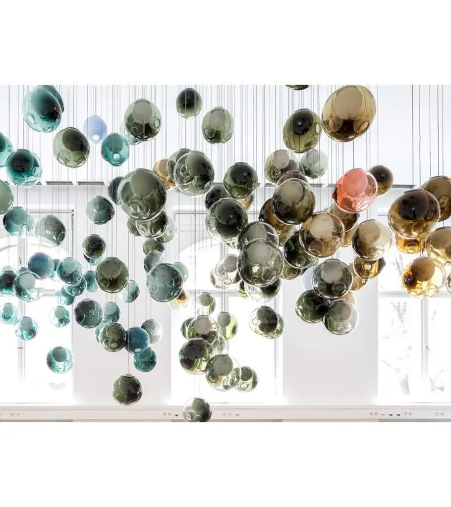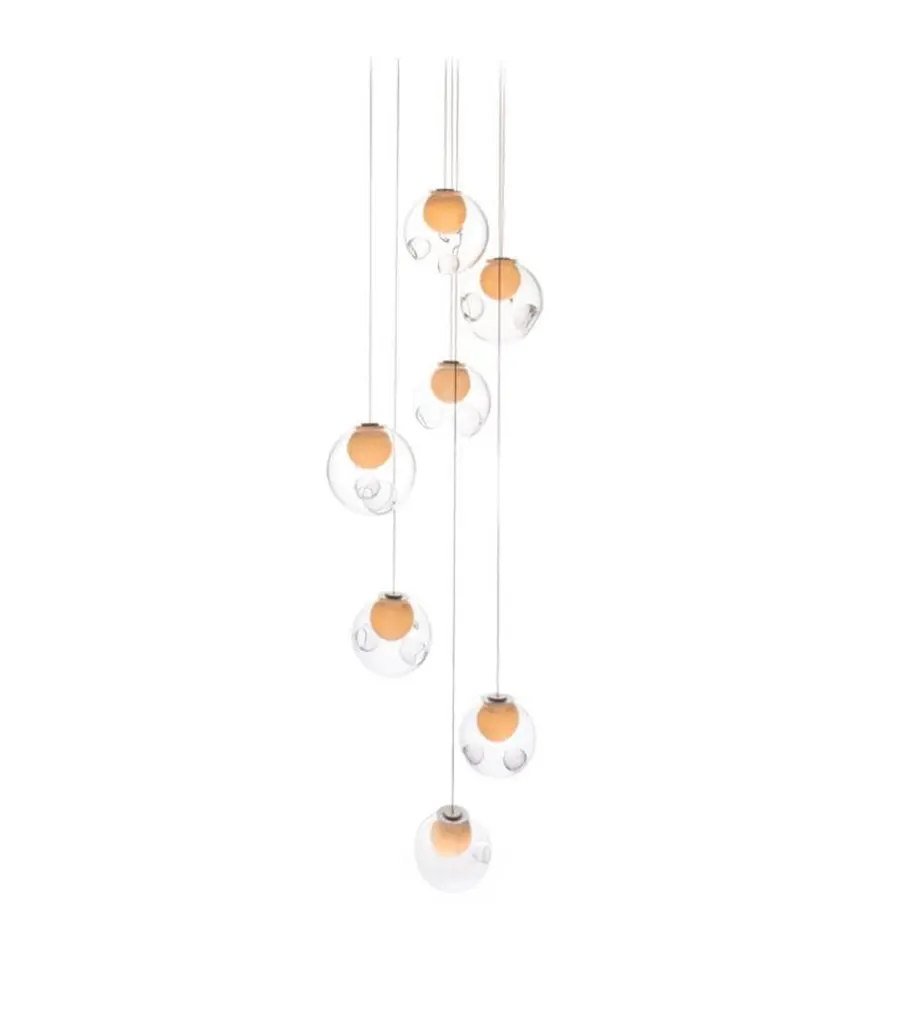 28.7 Pendant lamp by BocciDimensions: Diameter 30.5 x Height 300 cm Materials: blown glass, braided metal coaxial cable, electrical components, brushed nickel canopy.Lamping: : 1.5w LED or 20w xenon. Non-dimmable. Coax: adjustable. 3000mm (10’) standard / up to 30500mm (100’) maximumAlso available in different sizes. All our lamps can be wired according to each country. If sold to the USA it will be wired for the USA for instance.28.7 is a random configuration of seven 28 pendants hung from a roundcanopy. The pendants are designed to hang in a random confi guration attimes clustering and grouping together and others trailing off. The result is anambient installation or field of light. The pendant drop lengths on this fixture are adjustable up to the specified maximum. 28 is an exploration of specificity in manufacturing. Instead of designing formitself, here the intent was to design a system of making that yields form.Individual 28 pendants result from a complex glass blowing technique whereby air pressure is intermittently introduced into and then removed from a glass matrix which is intermittently heated and then rapidly cooled. The result is a distorted spherical shape with a composed collection of imploded innershapes, one of which acts as a shade for the light source.Standard 28s are made with clear glass exterior spheres and milk whiteinterior lamp holder cavities. 28s are possible with infinite versatility in colorcompositions, sizes, and shapes.Bocci is a design and manufacturing company based in Vancouver and Berlin. Founded in 2005 under the creative directorship of Omer Arbel, Bocci is committed to fostering a lateral and open-ended relationship between creative direction and craft. The company launched with one lighting design, ‘14’, which became an instant classic and remains a design staple and bestseller. Bocci’s growing portfolio of sculptural lighting is developed, engineered, and fabricated in-house, through an infrastructure calibrated to provide full control over technique, quality, and scale.In 2015, Bocci transformed a historic Berlin building into a showroom and archive. ‘Bocci 79’ inhabited a 2,200 m² / 23,600 sq ft former courthouse, constructed in 1896, and showcased over a decade of works by Omer Arbel, ranging from pieces in progress, prototypes, and ideas, to the complete range of catalog pieces developed for Bocci.Bocci 79 closed in June 2020 and we are currently working on our new, permanent Berlin showroom which will open soon.