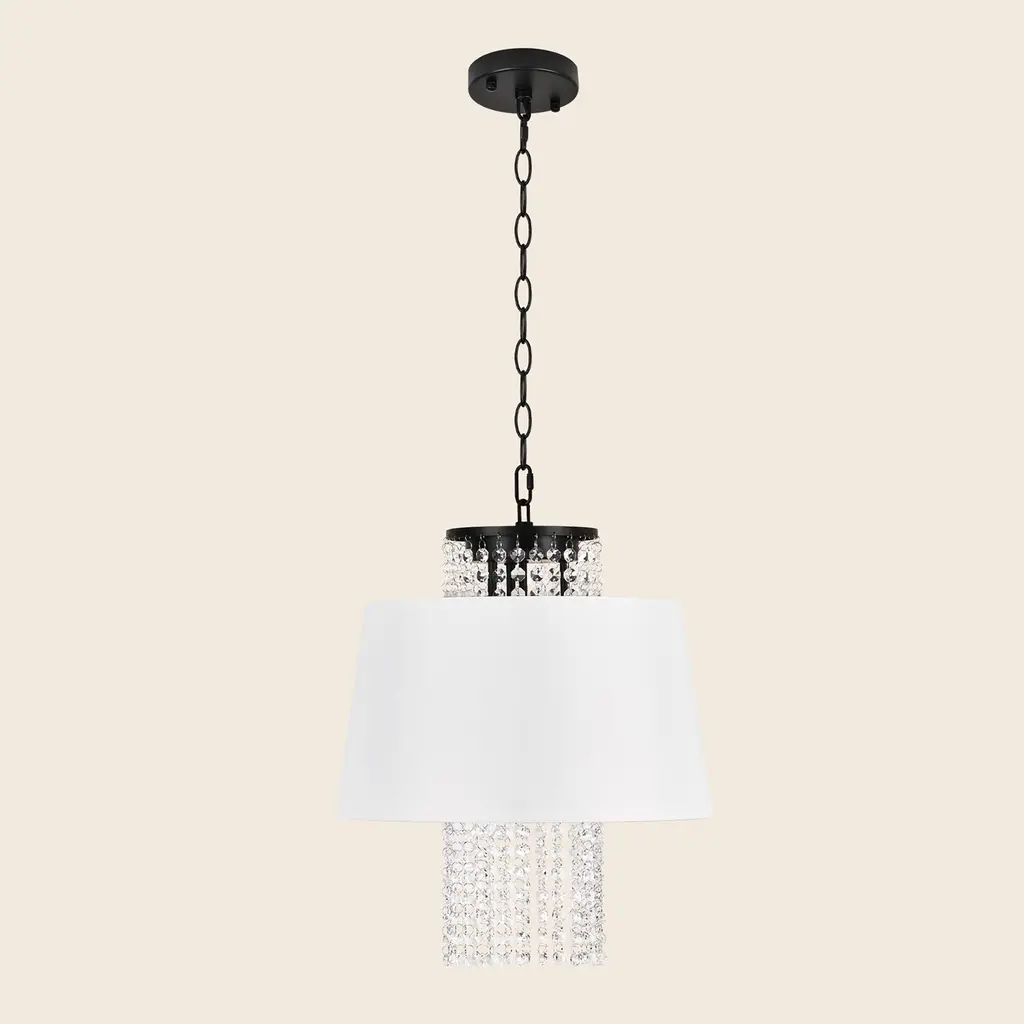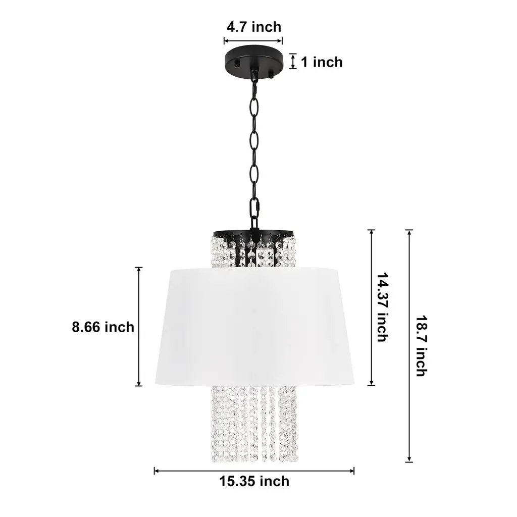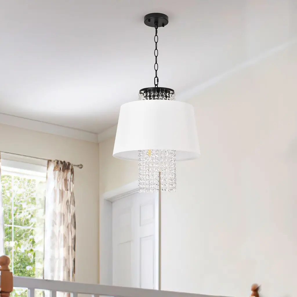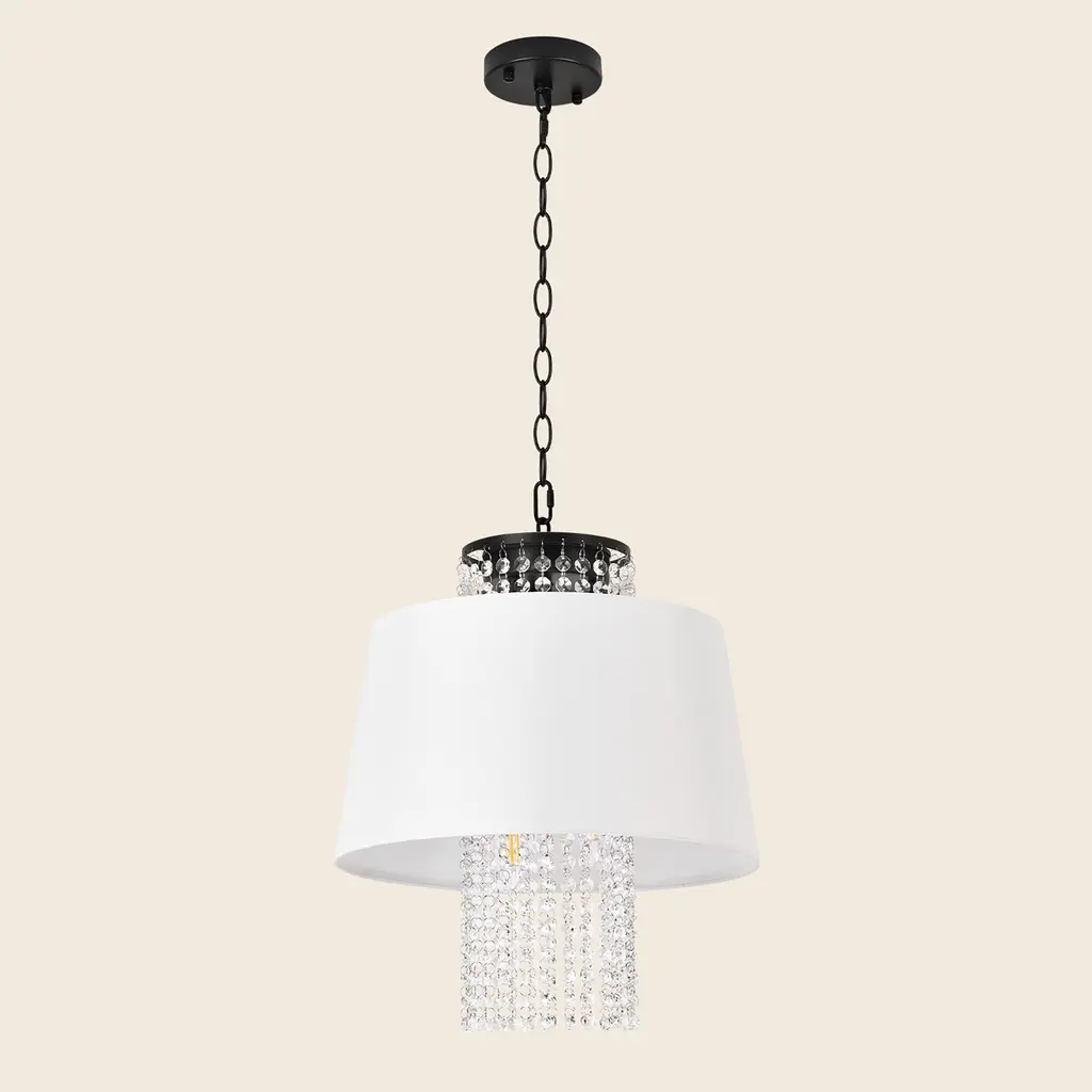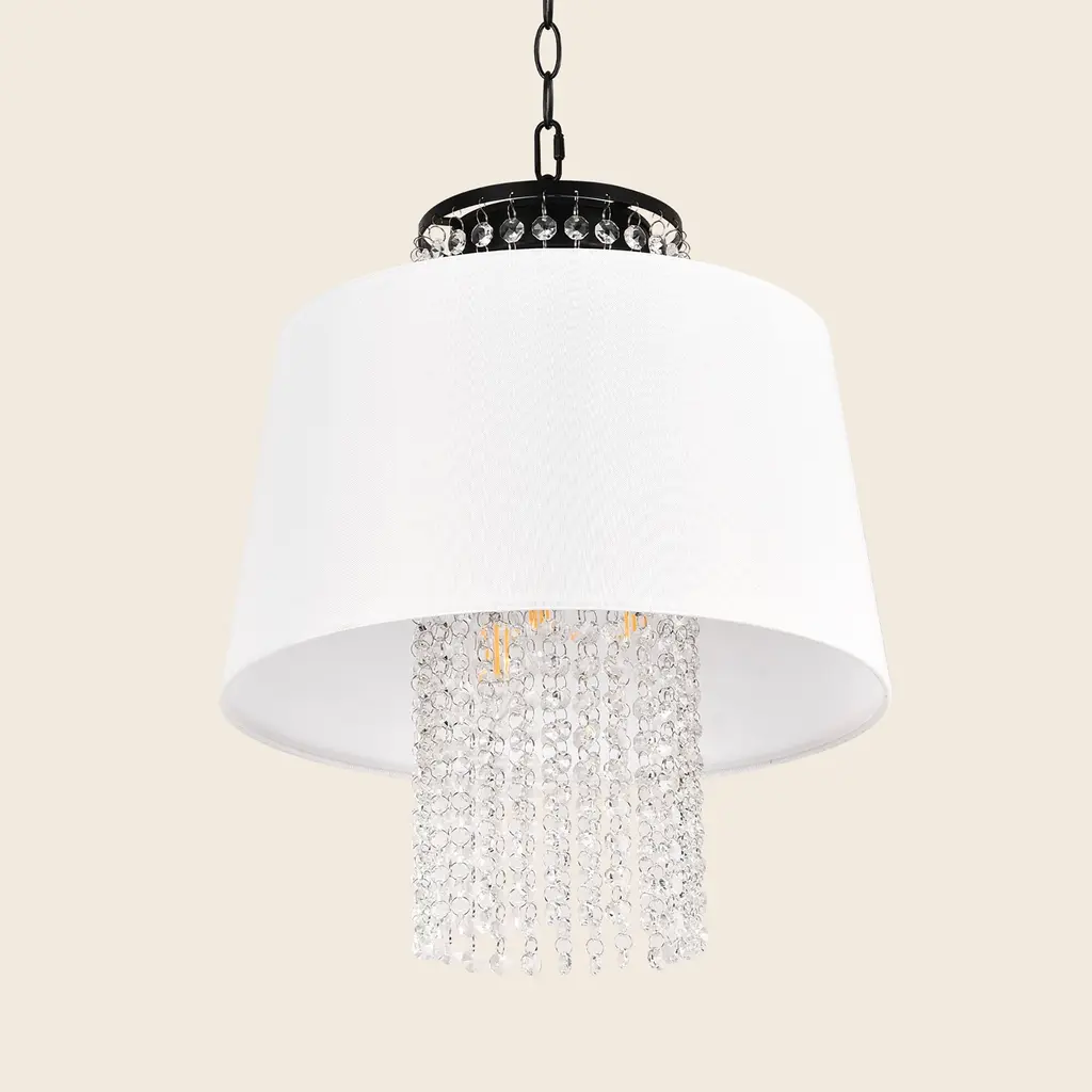 Detail:This pendant light brings a luxurious touch to your home with its elegant blend of a fabric drum shade and dazzling crystal accents. Perfect for entryways, dining rooms, or any space that needs a hint of glamour, this fixture features three E12 bulb sockets (bulbs not included) to provide ample lighting. The cascading strands of clear crystals catch and reflect the light, creating a shimmering, sophisticated ambiance. A matte black chain adds a modern contrast to the refined white shade, making it a versatile statement piece in both contemporary and transitional interiors. With its eye-catching design and compatibility with dimmer switches, you can effortlessly adjust the lighting to suit your mood and occasion. Feature: