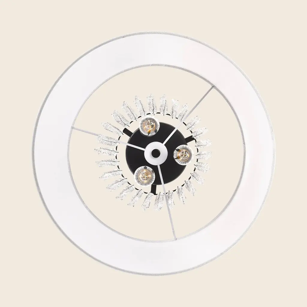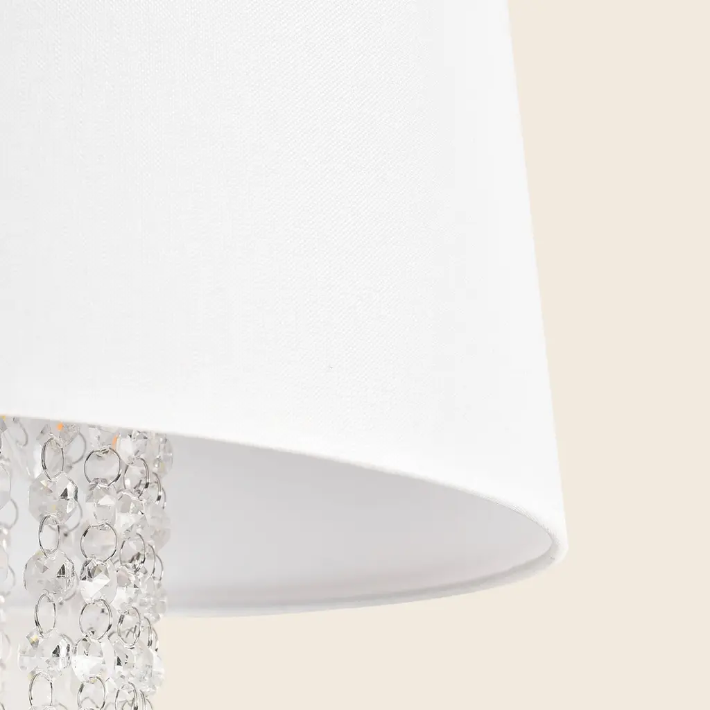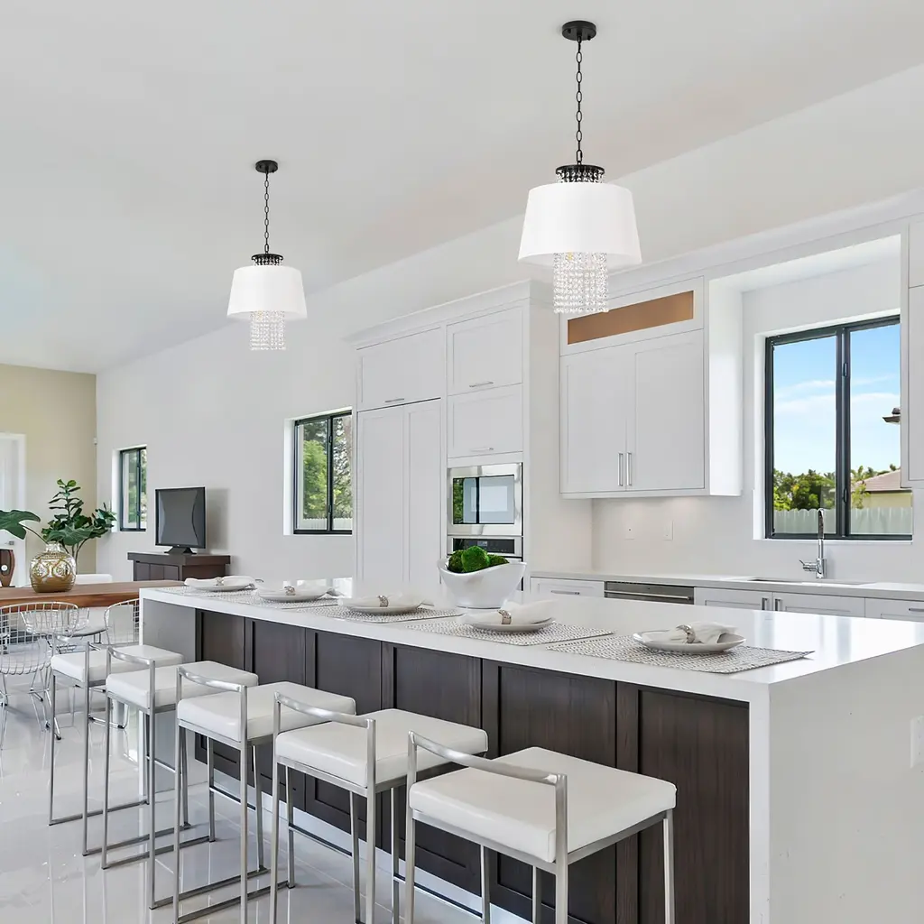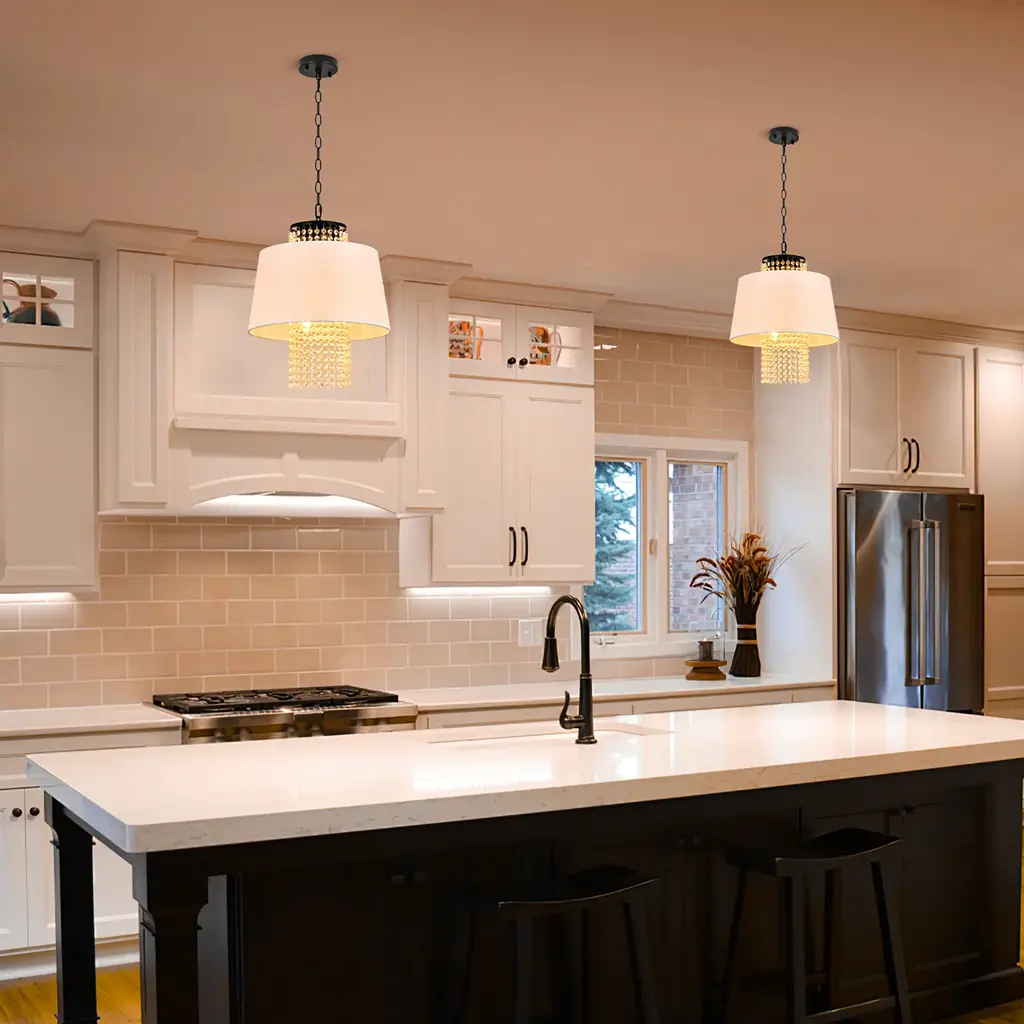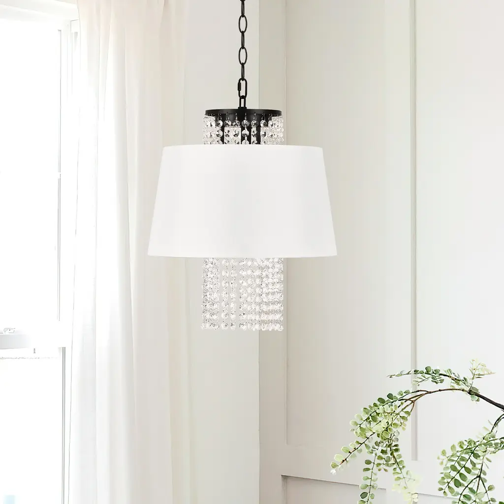 Detail:This pendant light brings a luxurious touch to your home with its elegant blend of a fabric drum shade and dazzling crystal accents. Perfect for entryways, dining rooms, or any space that needs a hint of glamour, this fixture features three E12 bulb sockets (bulbs not included) to provide ample lighting. The cascading strands of clear crystals catch and reflect the light, creating a shimmering, sophisticated ambiance. A matte black chain adds a modern contrast to the refined white shade, making it a versatile statement piece in both contemporary and transitional interiors. With its eye-catching design and compatibility with dimmer switches, you can effortlessly adjust the lighting to suit your mood and occasion. Feature: