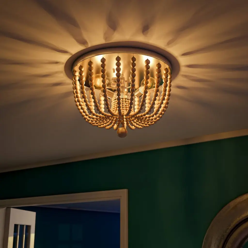 Dramatic looks in a space saving design – this beaded flush mounted light is perfect for those looking to bring bold bohemian style to their hallways, bedrooms, entryways and more. The low 11-inch profile doesn’t necessarily sacrifice style for extra space – this flush mount features distressed white wood beads elegantly draped around three central lights, finished with a large bed drop hanging down the middle. Expertly well-suited for smaller apartments, condos and townhomes or anywhere with low ceilings, this versatile design perfectly complements bohemian, eclectic and transitional design.