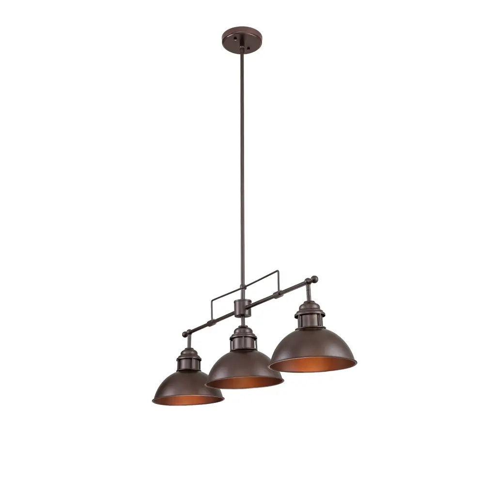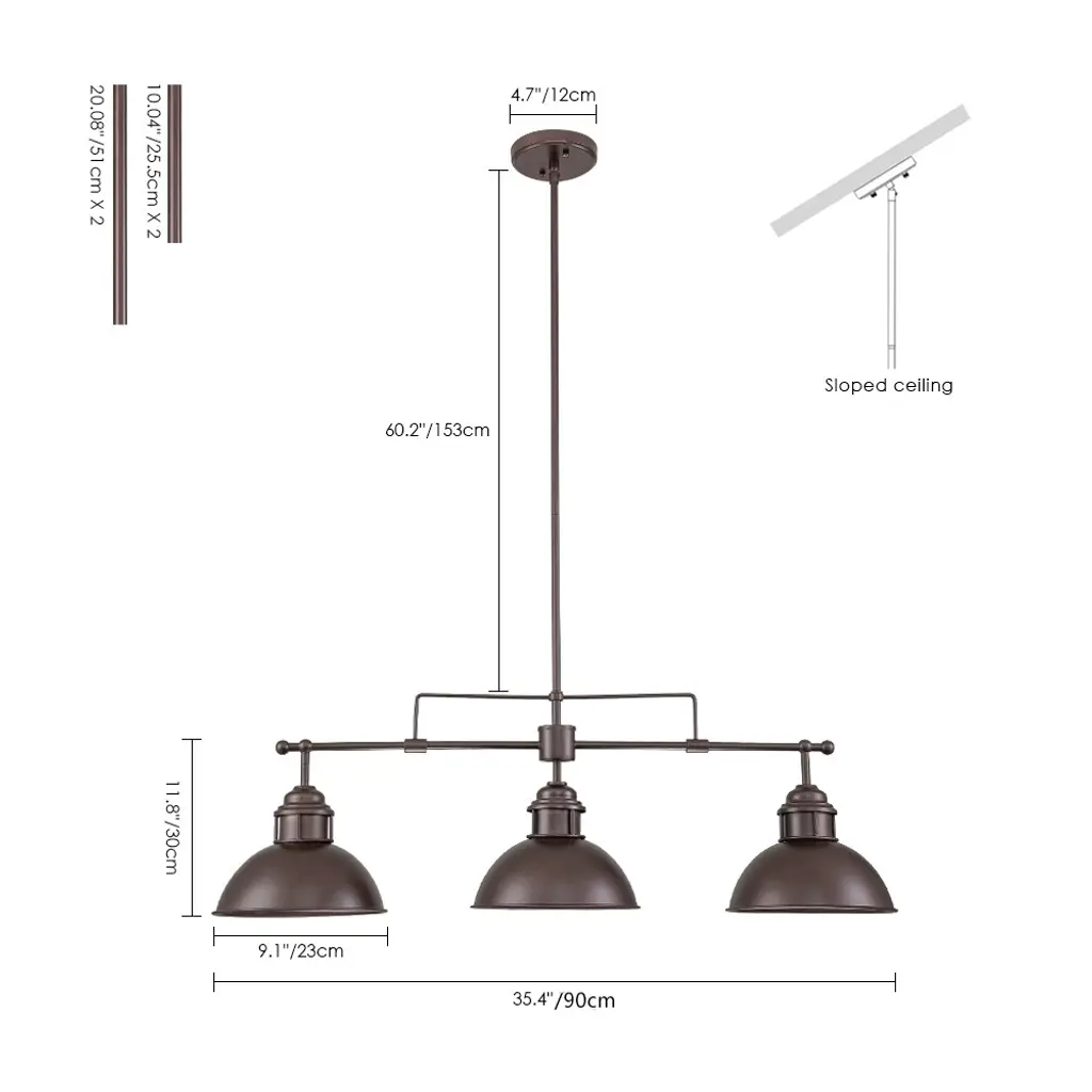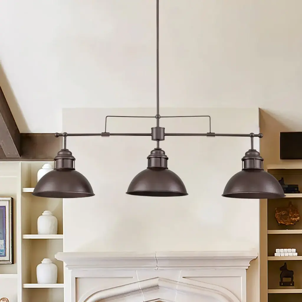 Inspired by factory lighting with wide metal dome shades, this modern industrial linear kitchen island pendant light is full of farmhouse and vintage styles at the same time. This island pendant ceiling light features a sloped-ceiling-compatible canopy, an adjustable hanging rod, and a trio of dome-shaped shades to direct light from compatible bulbs (not included) downward. Features: Product Details: