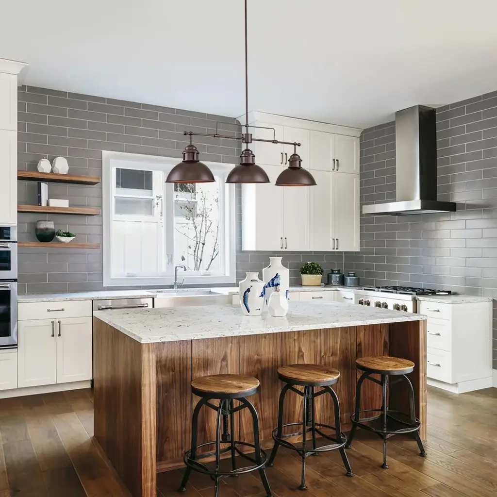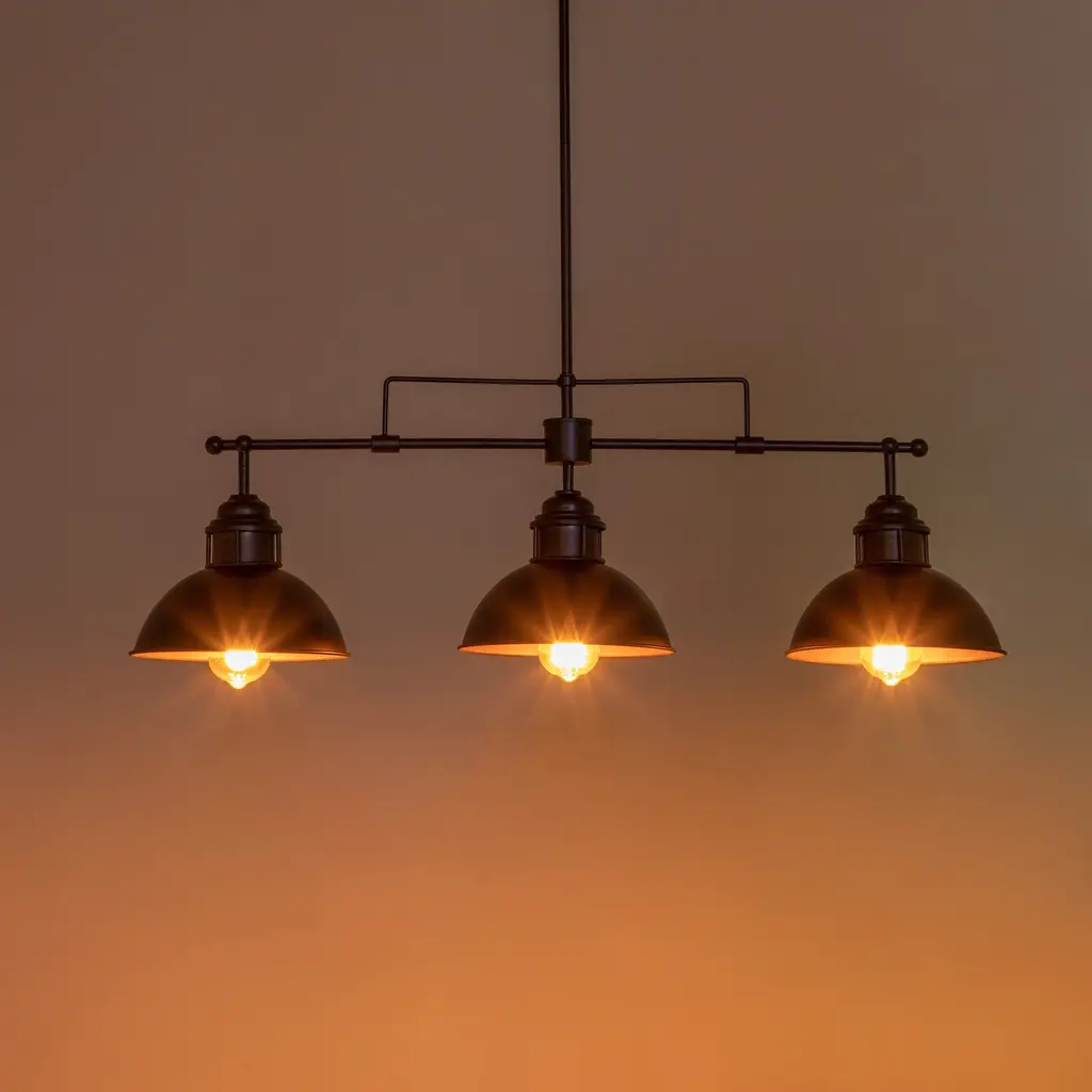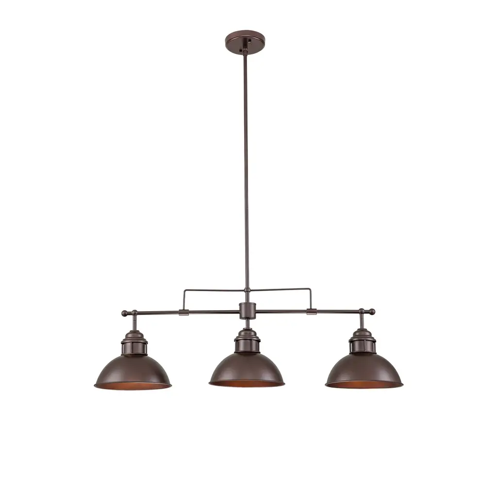 Inspired by factory lighting with wide metal dome shades, this modern industrial linear kitchen island pendant light is full of farmhouse and vintage styles at the same time. This island pendant ceiling light features a sloped-ceiling-compatible canopy, an adjustable hanging rod, and a trio of dome-shaped shades to direct light from compatible bulbs (not included) downward. Features: Product Details: