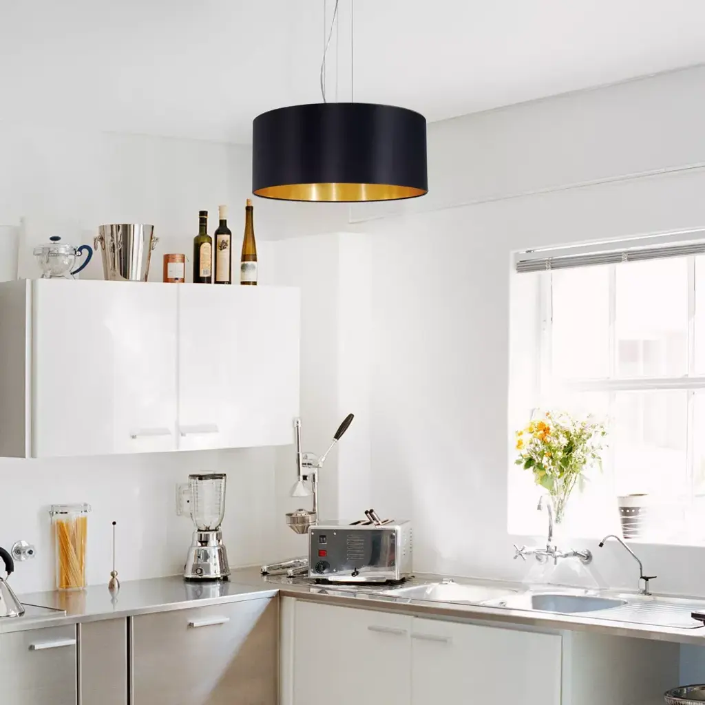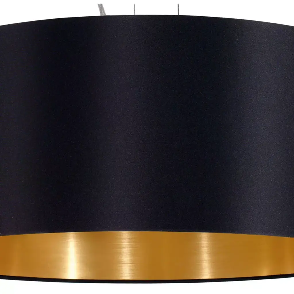 The Maserlo family brings a modern touch to the original shade fixture. The black cloth shade surrounds the shiny textured gold interior lining. The fixture is light weight which makes for easy installation. Eglo Lighting Maserlo 3 light large ceiling pendant features a circular ceiling plate in satin nickel finish, holding a drum shaped, black fabric shade with gold lining. This stunning design will be a striking display for modern or contemporary decors within your home and the gold lining will reflect warm, welcoming light. The Maserlo collection includes a smaller drum pendant, 2 light over island pendants, LED flush ceiling fitting, single light swing arm wall fitting, table and floor lamps to complete the look.