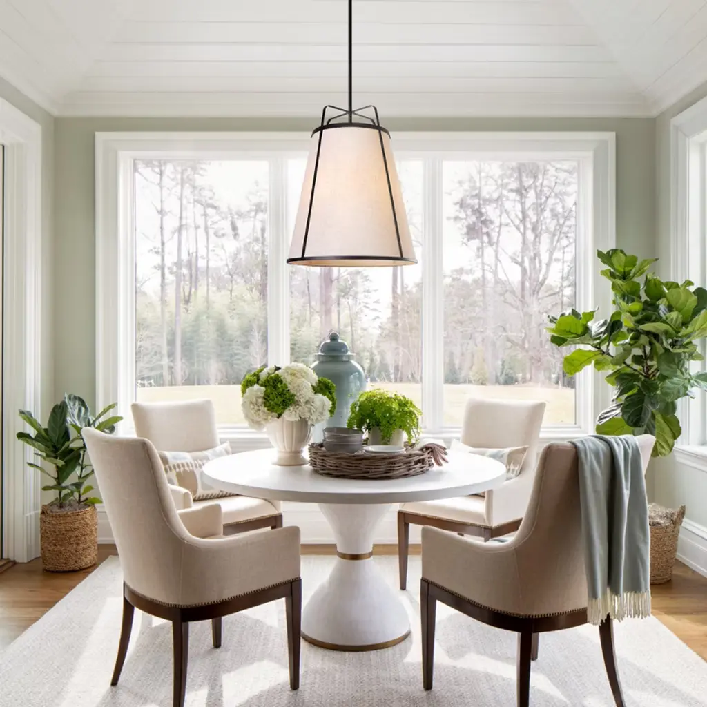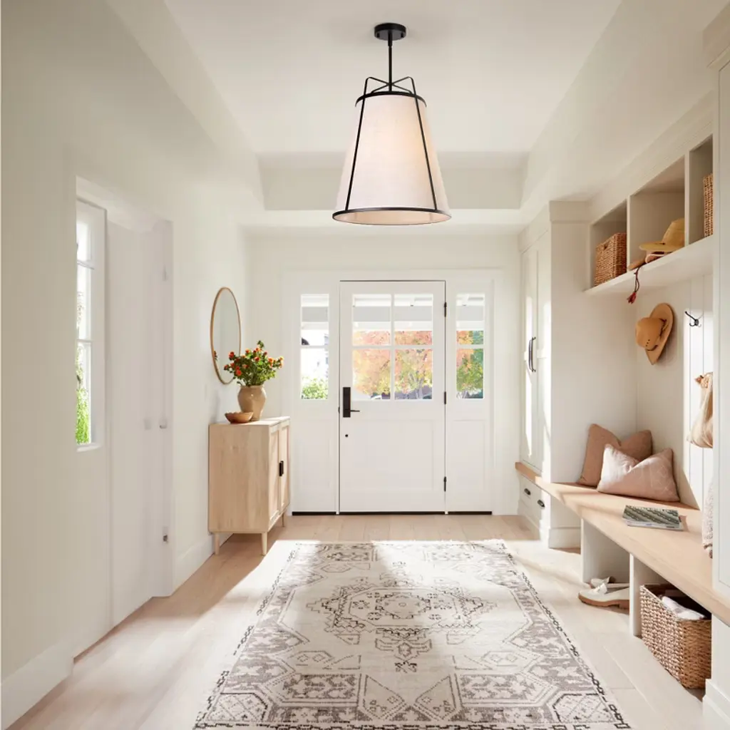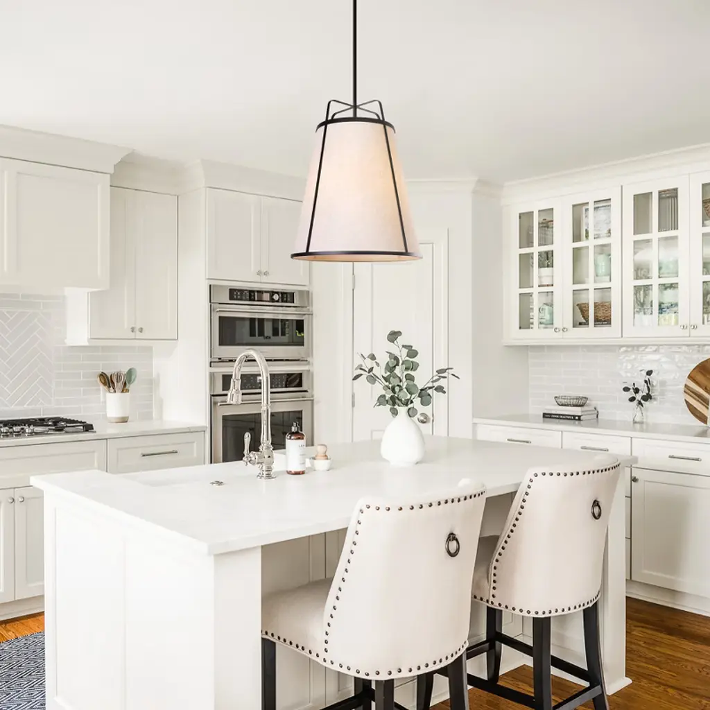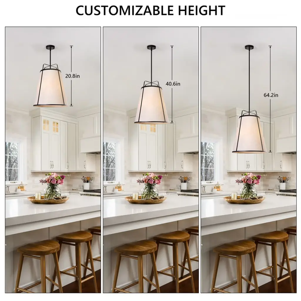 Traditional with hints of modern flair, this 3-light pendant chandelier makes any room a bit more charm. The metal fixture features a minimalist style and comes with a tapered fabric shade that brings a bit of industrial appeal to your dining area or entryway. This pendant light hangs with the help of a height-adjustable downrod
