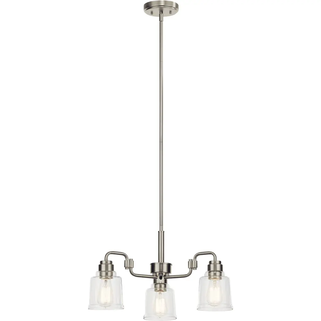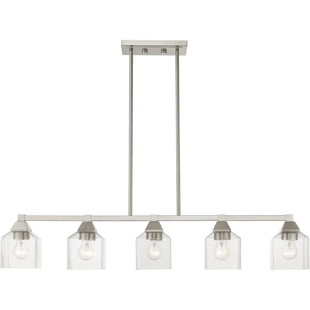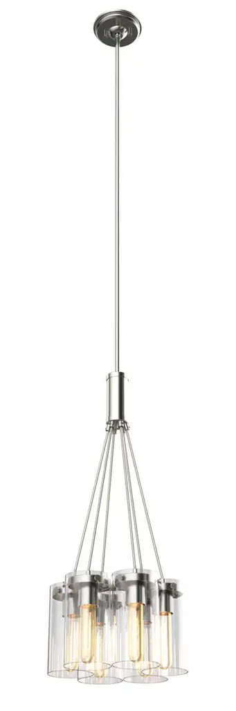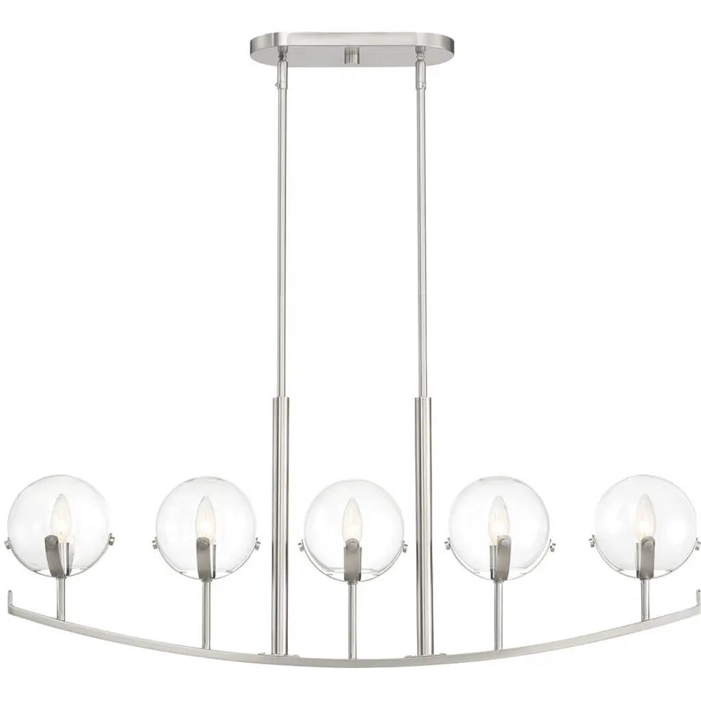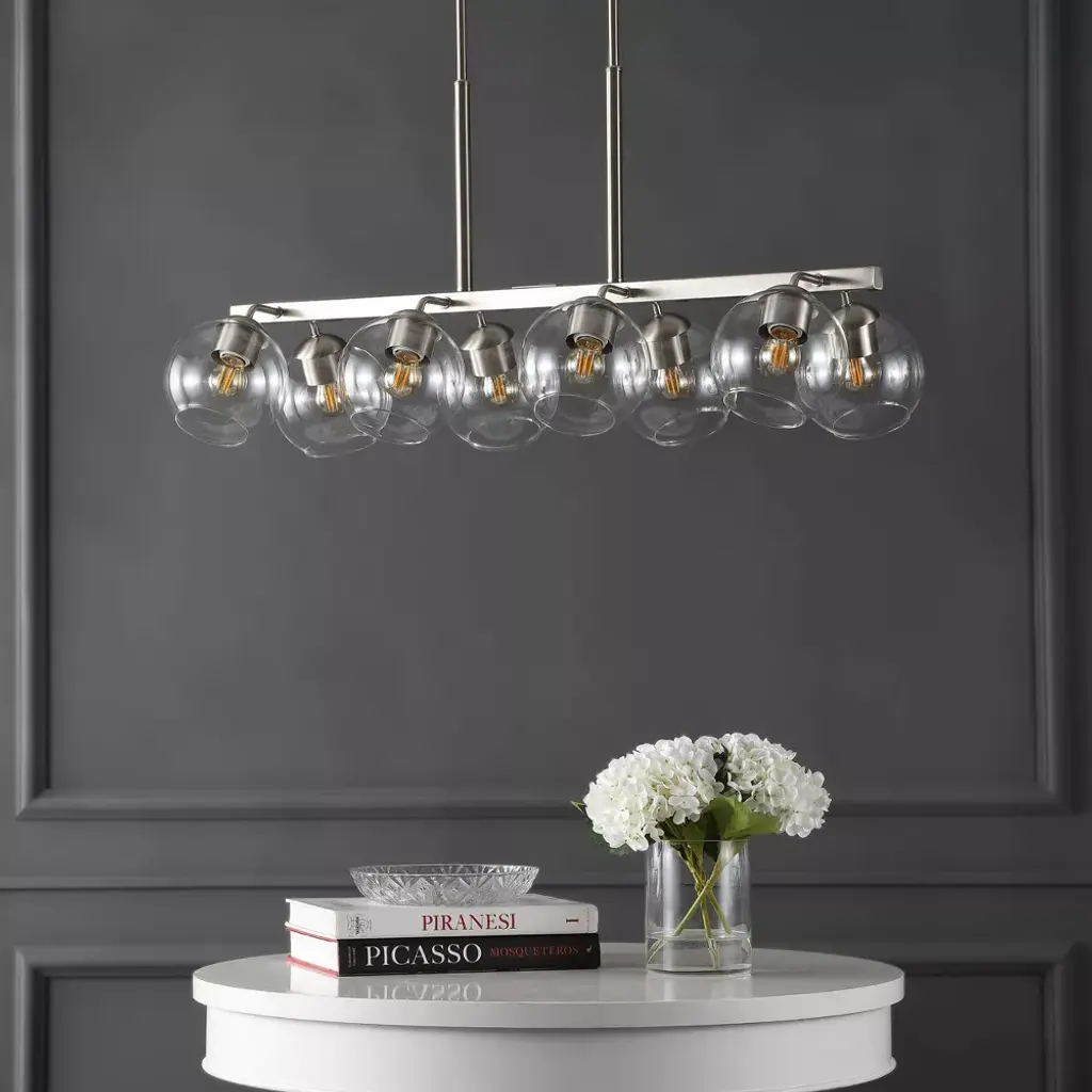 Our mid-century style linear chandelier has Edison bulbs and clear globes with a modern nickel finish. Adjustable-height pendant works best for ceilings up to twelve-feet high. Eight Edison bulbs create soft, warm lighting, while the clear glass globes add a mid-century touch. Eco-friendly 4W LED bulb included. Takes 8 bulbs and compatible with TYPE "A" 40W or CFL 13W or LED 9WBefore cleaning any lamp shade or fixture, disconnect the power source. Wipe with a soft, dry cloth. Avoid the use of chemicals and household cleaners as they may damage the finish.