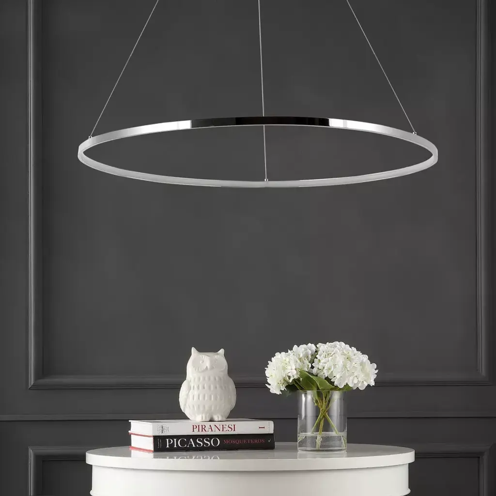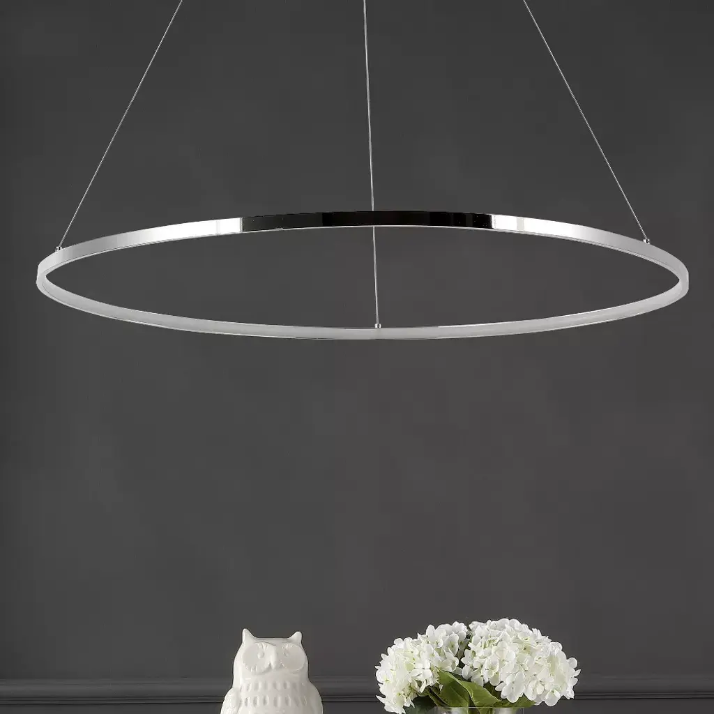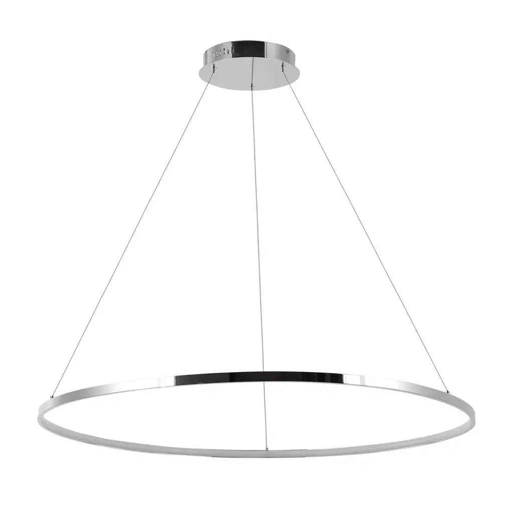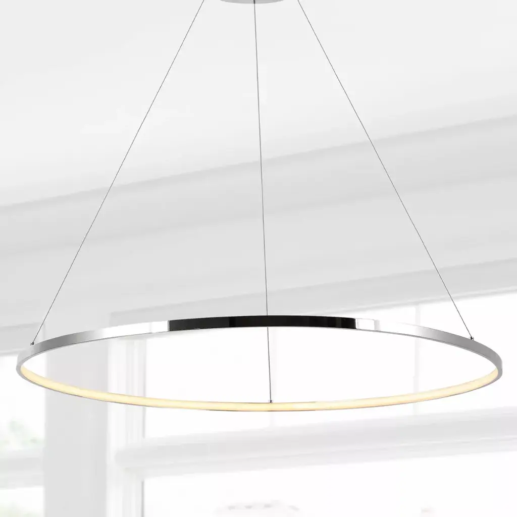 Classic geometry gets a modern chrome finish in this single hoop pendant/chandelier. Height-adjustable single-tier ceiling LED lighting that's as robust as its category is going to get; works best for ceilings up to fourteen-feet high. Fusing coastal and futuristic elements, this mid-air circular float of a pendant is among the best modern lighting updates for your home. ETL Listed. Integrated 48W LED bulbBefore cleaning any lamp shade or fixture, disconnect the power source. Wipe with a soft, dry cloth. Avoid the use of chemicals and household cleaners as they may damage the finish.