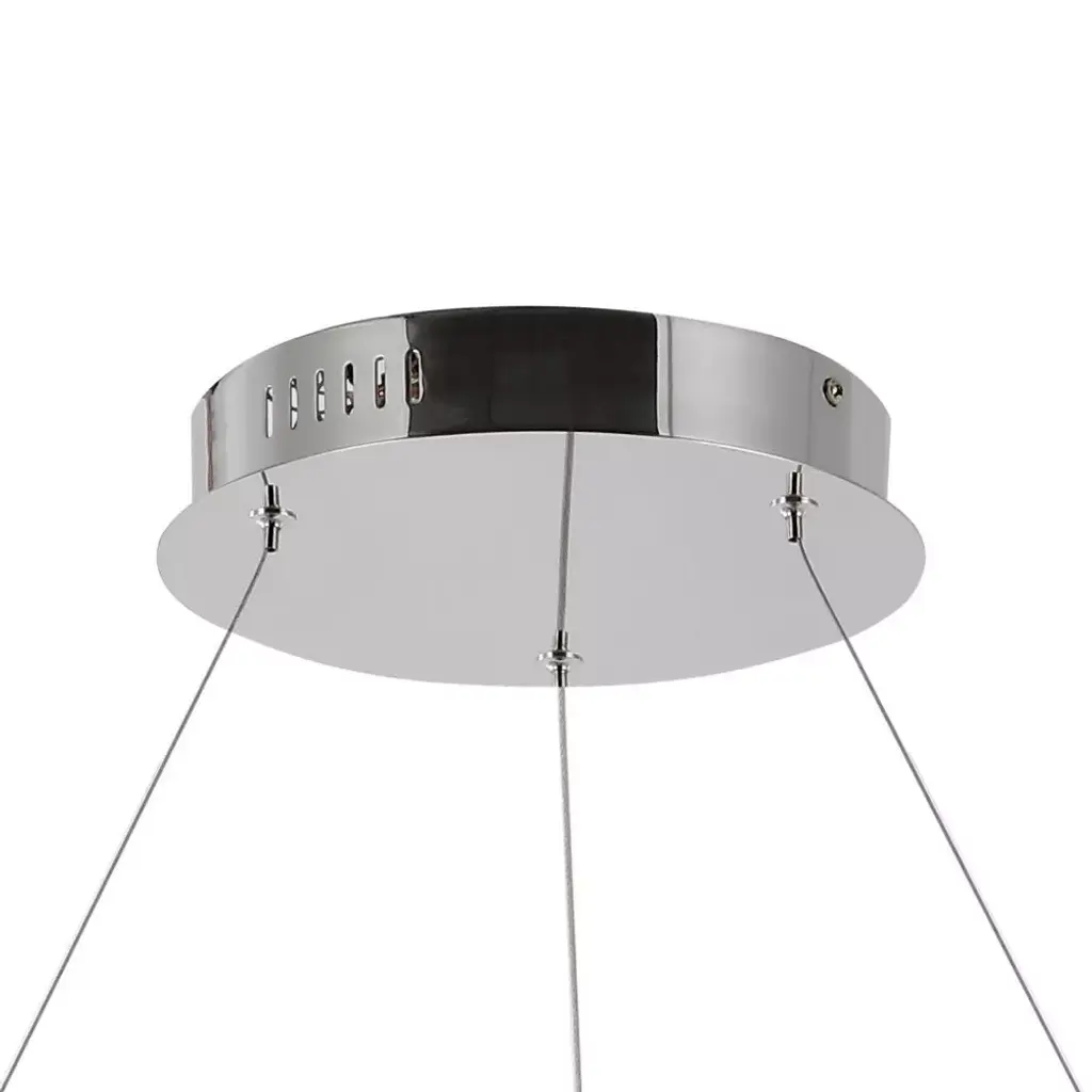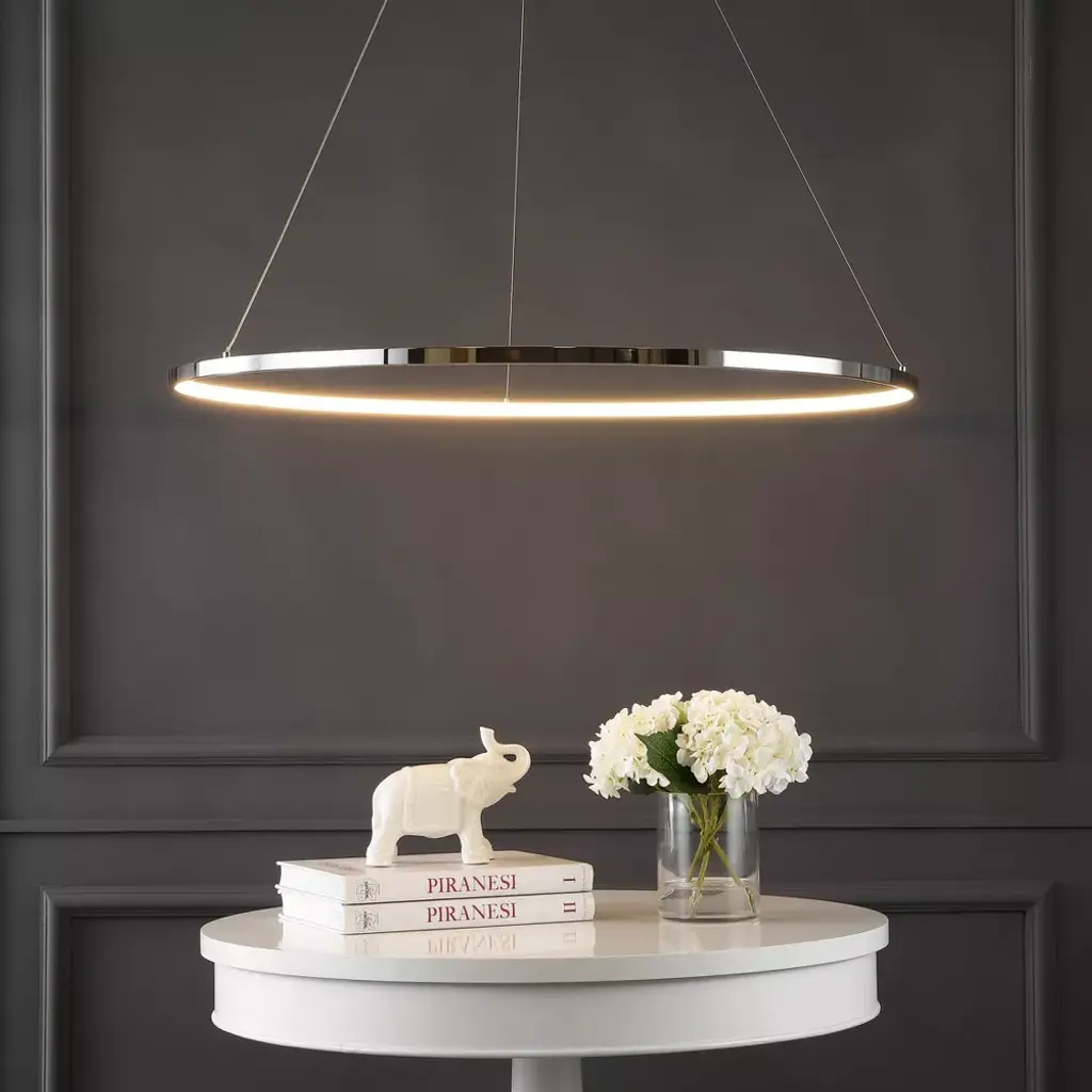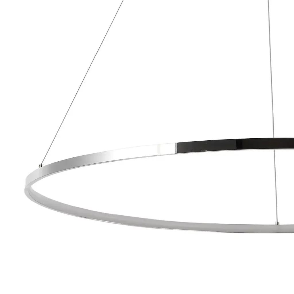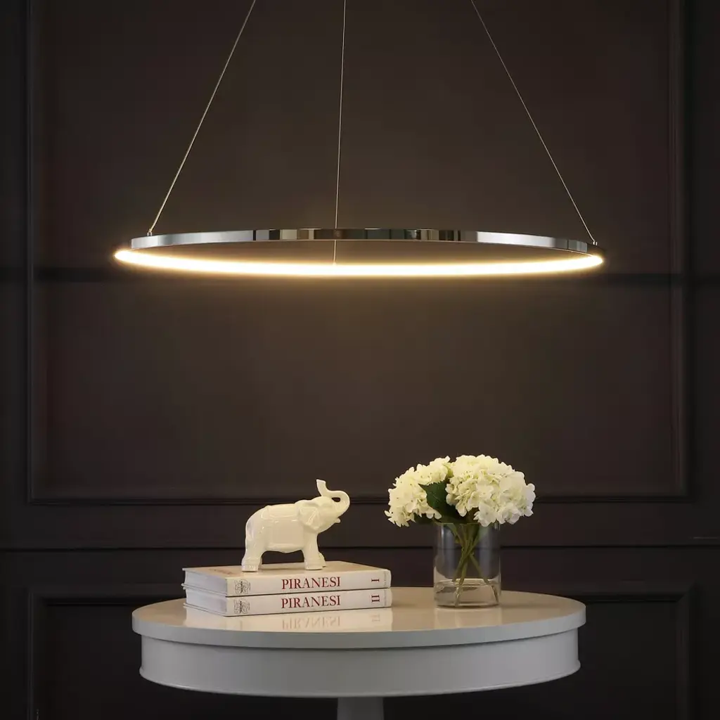 Classic geometry gets a modern chrome finish in this single hoop pendant/chandelier. Height-adjustable single-tier ceiling LED lighting that's as robust as its category is going to get; works best for ceilings up to fourteen-feet high. Fusing coastal and futuristic elements, this mid-air circular float of a pendant is among the best modern lighting updates for your home. ETL Listed. Integrated 48W LED bulbBefore cleaning any lamp shade or fixture, disconnect the power source. Wipe with a soft, dry cloth. Avoid the use of chemicals and household cleaners as they may damage the finish.