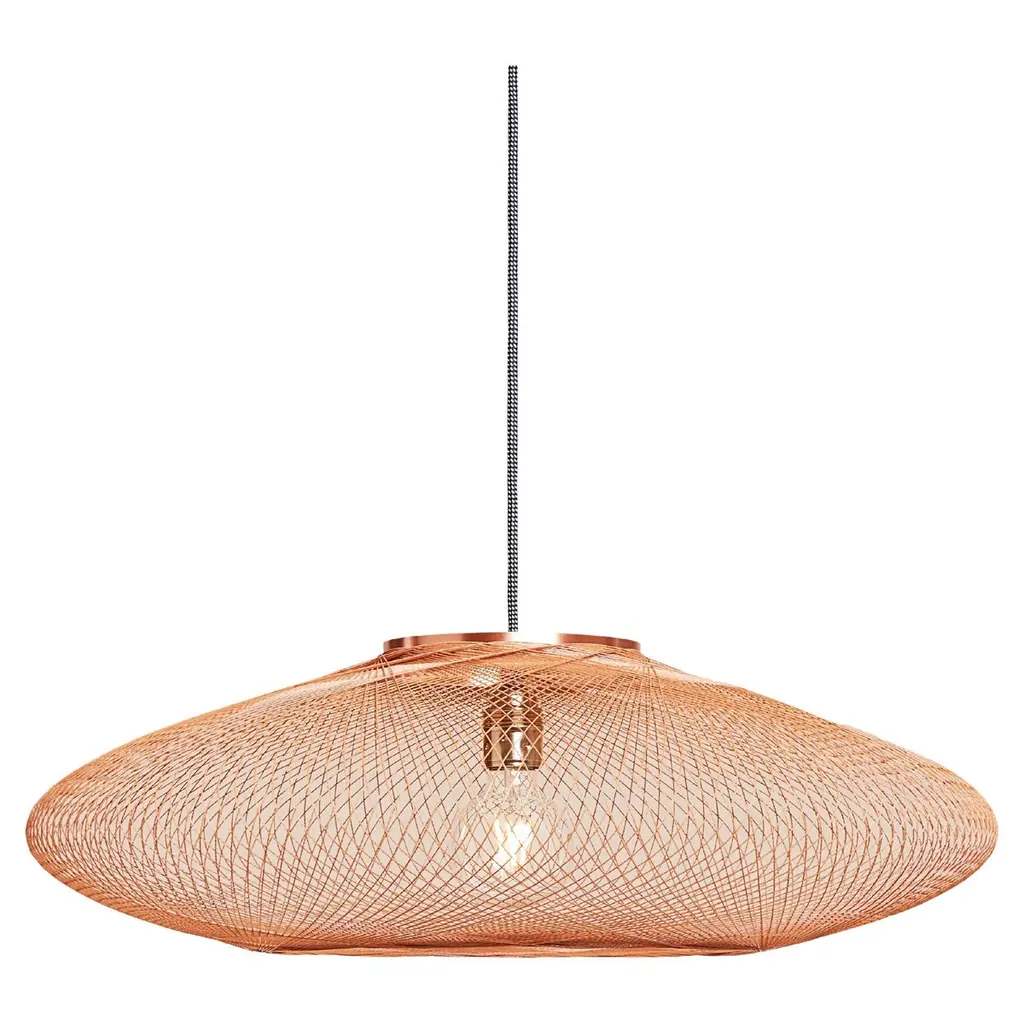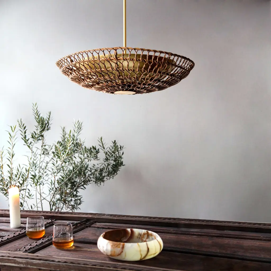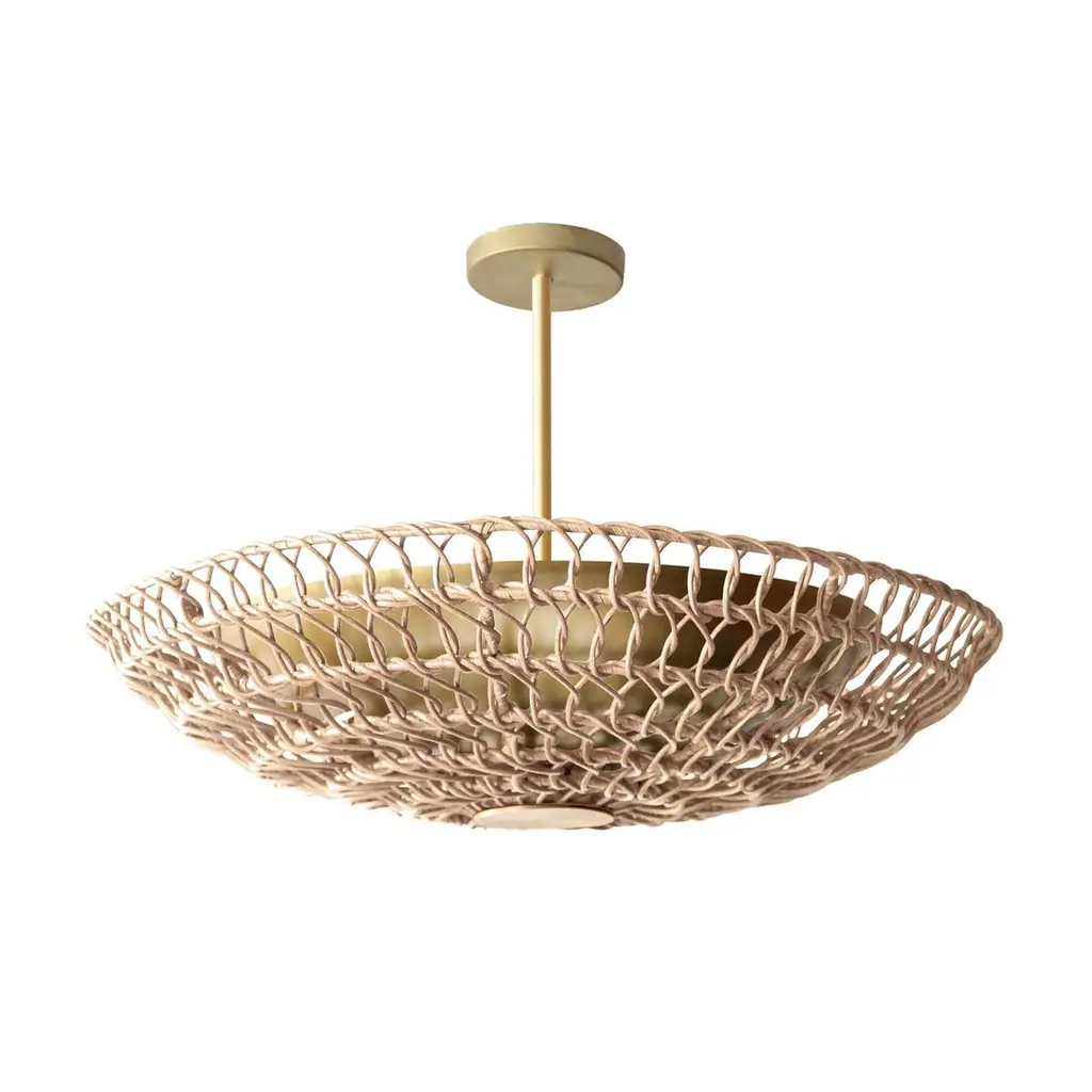 Ventila, our nickname for the Tagalog word for ‘fan’, is woven from Filipino rattan and takes inspiration from colonial era ceiling fans. Measure: 34".It’s an interplay of textures, a mix of rustic and refined, meant to capture a relaxed grandeur. Strands of blackened palm are carefully intertwined, forming a pattern of organic contours that balances against the crisp, warm edges of our brushed brass fittings.Expert craftsmen create each piece, with its unique twists and turns, by hand in the Philippines from local, fully-renewable materials.Brass stem10” – 40” total drop, standard(+40” – 72” total drop, additional cost)Ceiling mount, hardwired, requires professional installation.2 – socket for type A bulb up to 60w.UL listed.Also available in 24" diameter.Also available in black rattan and natural rattan.