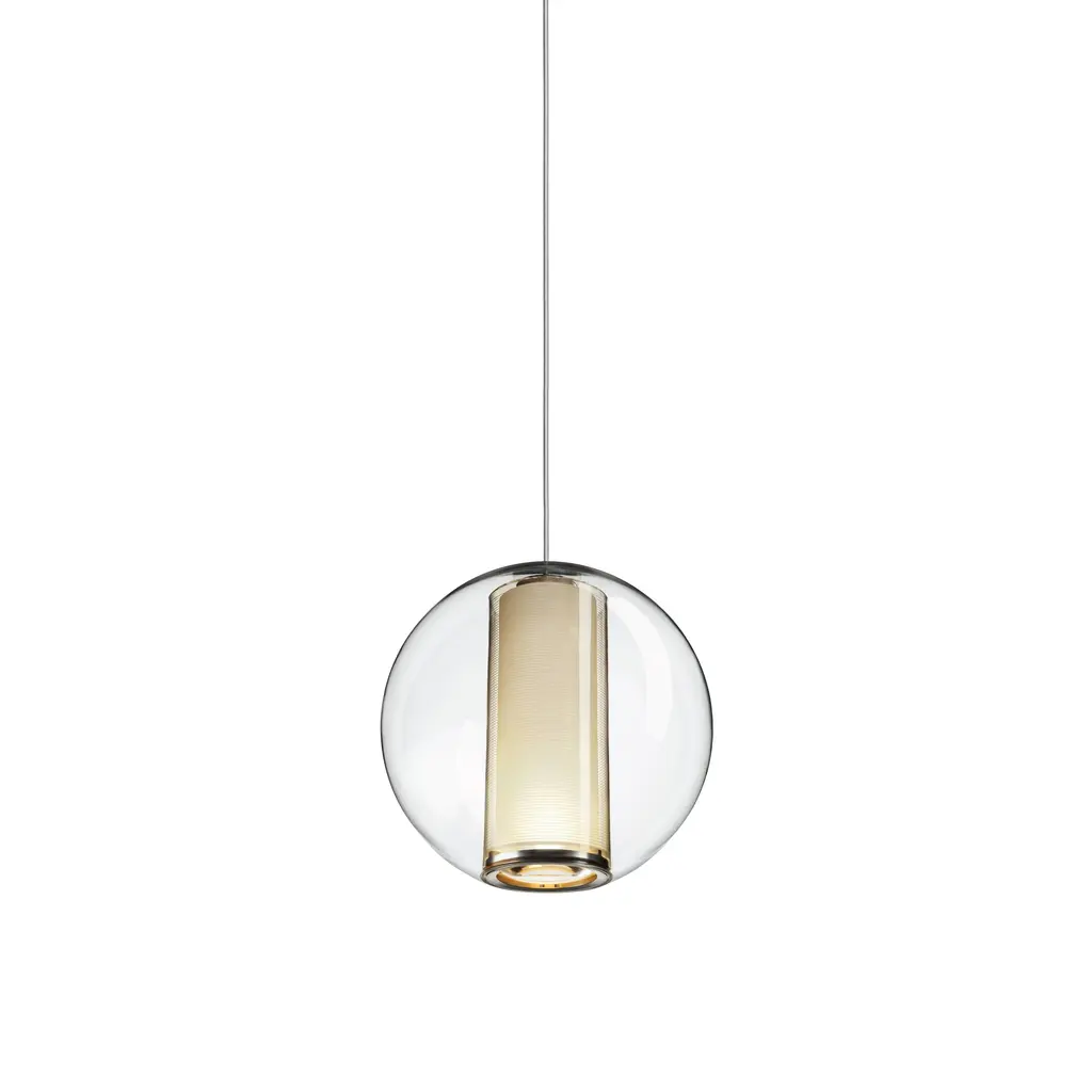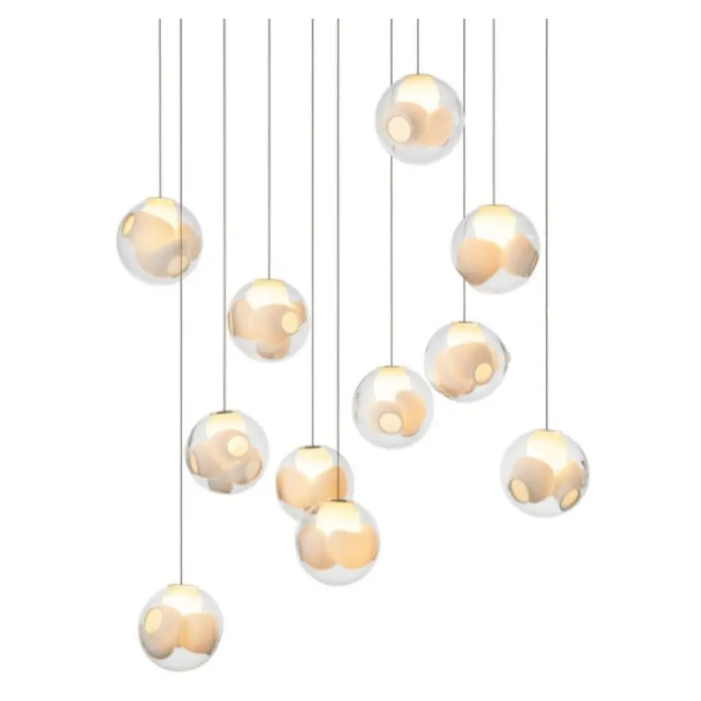 38.1 pendant by BocciDimensions: D 11.6 x H 300 cmMaterials: brushed nickel round canopyWeight: 2.7 kgAlso available in different dimensions and models.All our lamps can be wired according to each country. If sold to the USA it will be wired for the USA for instance.38 pushes the fabrication technique originally developed for 28 to its technical and Material limits. A large glass sphere is blown with a multitude of haphazard interior cavities, which intersect and collide with each other in unpredictable ways.Bocci is a design and manufacturing company based in Vancouver and Berlin. Founded in 2005 under the creative directorship of Omer Arbel, Bocci is committed to fostering a lateral and open-ended relationship between creative direction and Craft.The company launched with one lighting design, ‘14’, which became an instant Classic and remains a design staple and bestseller. Bocci’s growing portfolio of sculptural lighting is developed, engineered and fabricated in-house, through an infrastructure calibrated to provide full control over technique, quality and scale.In 2015, Bocci transformed a historic Berlin building into a showroom and archive. ‘Bocci 79’ inhabited a 2,200 m² / 23,600 sq. ft. former courthouse, constructed in 1896, and showcased over a decade of works by Omer Arbel, ranging from pieces in progress, prototypes and ideas, to the complete range of catalogue pieces developed for Bocci.