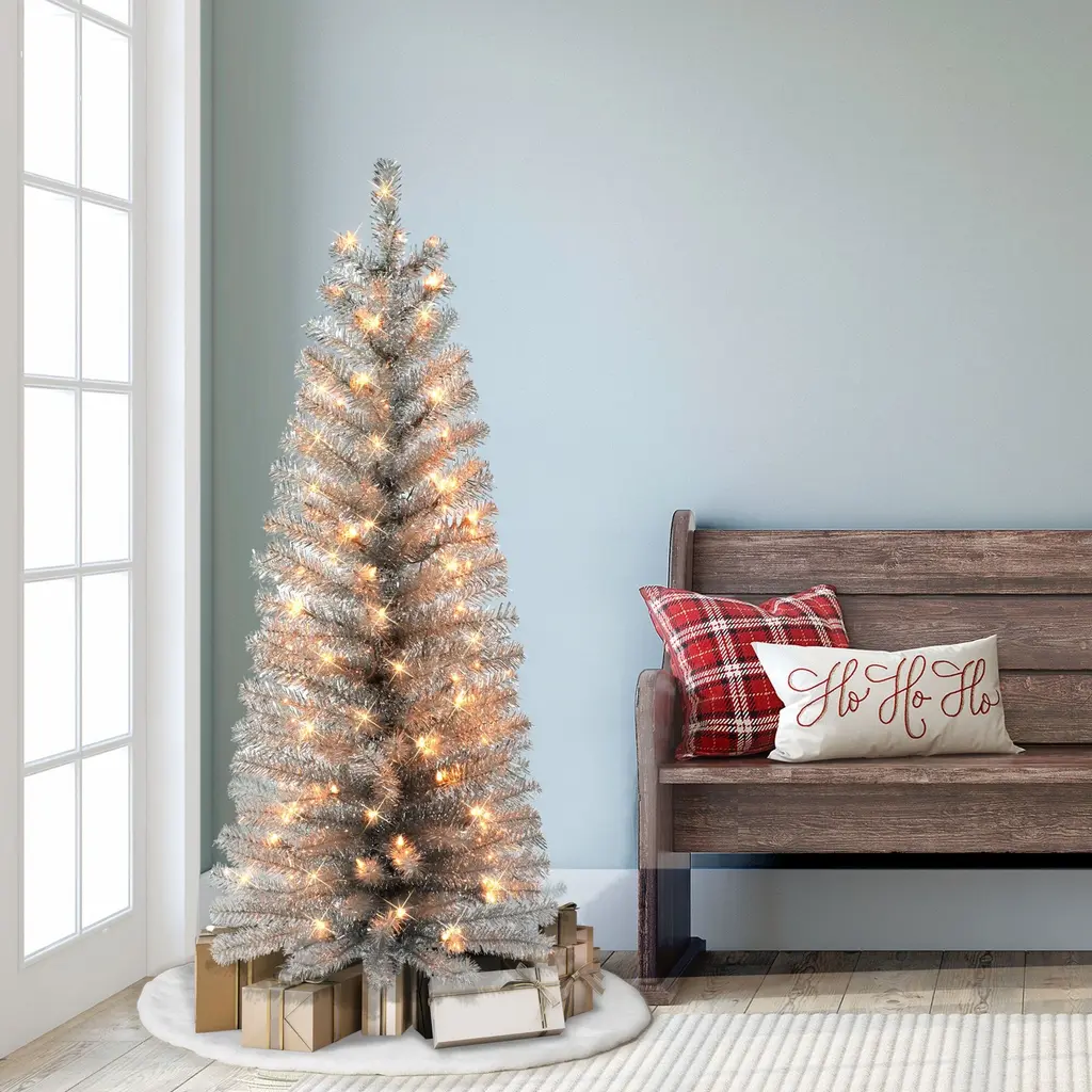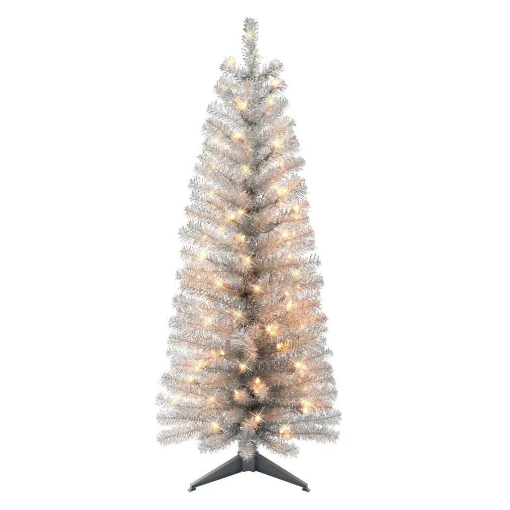 4.5' Pre-Lit Silver Tinsel Slim Artificial Christmas Tree, Clear Lights - 4.5 Foot - Silver - 4.5 Foot