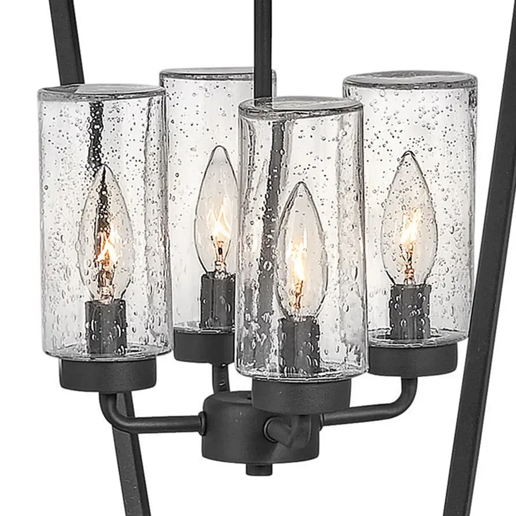 The clean and classic design of this hanging light features a line of chandelier options. Each traditional oversized cage entraps a series of lamps enclosed by clear seedy glass. It provides excellent illumination from all sides.