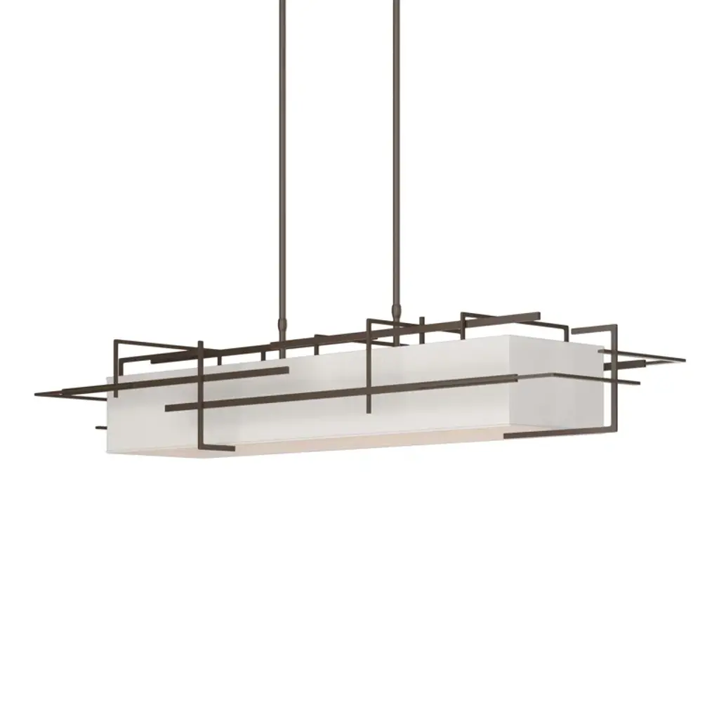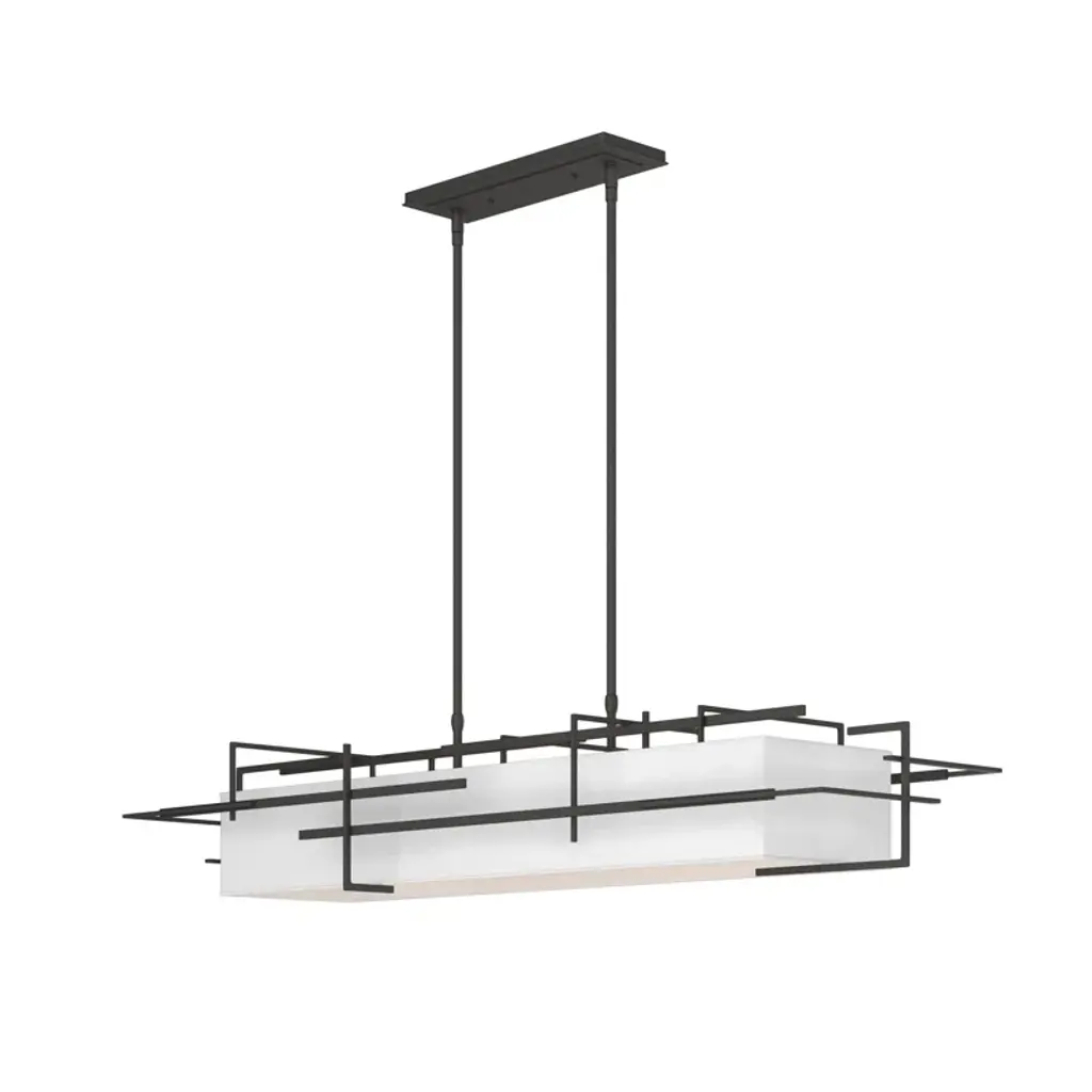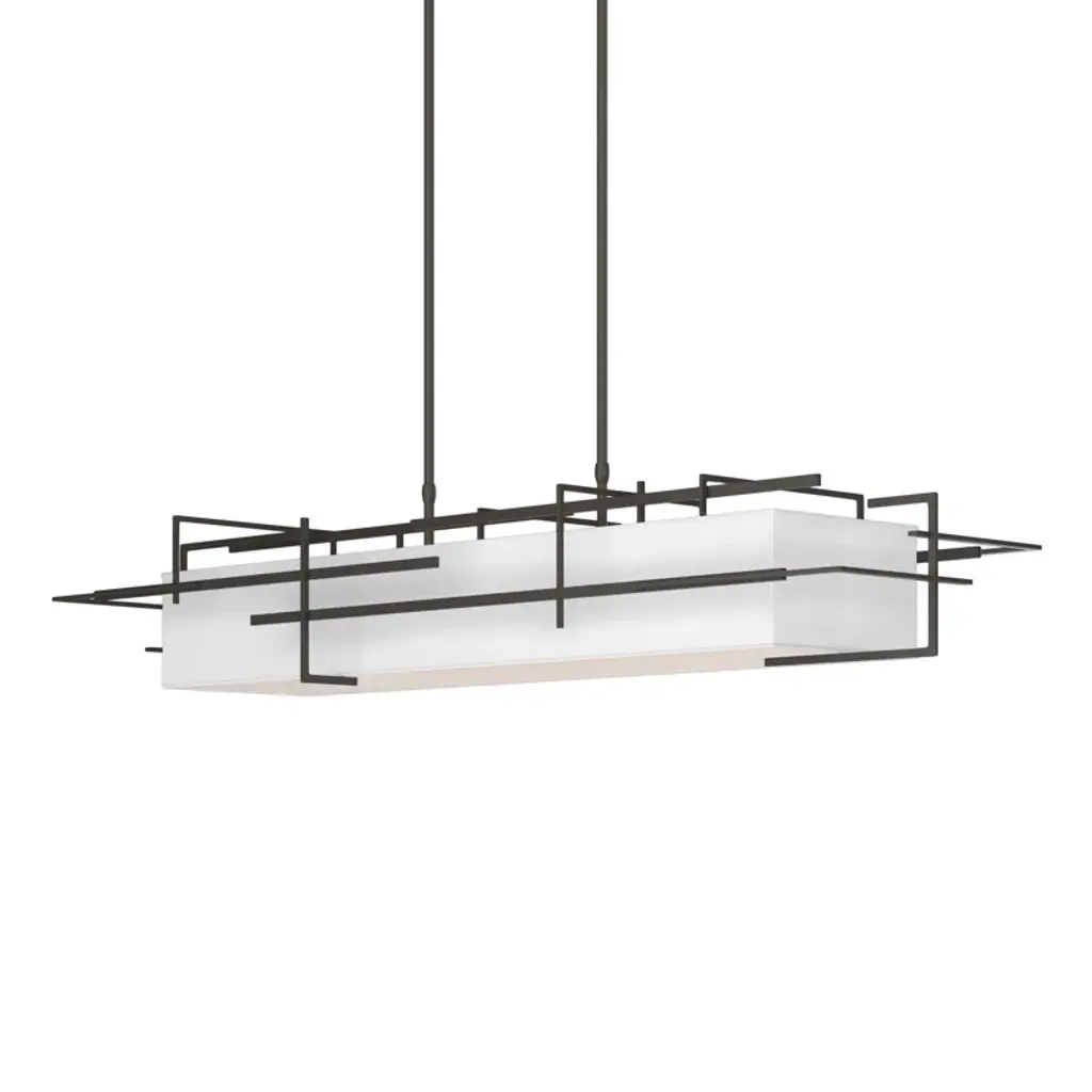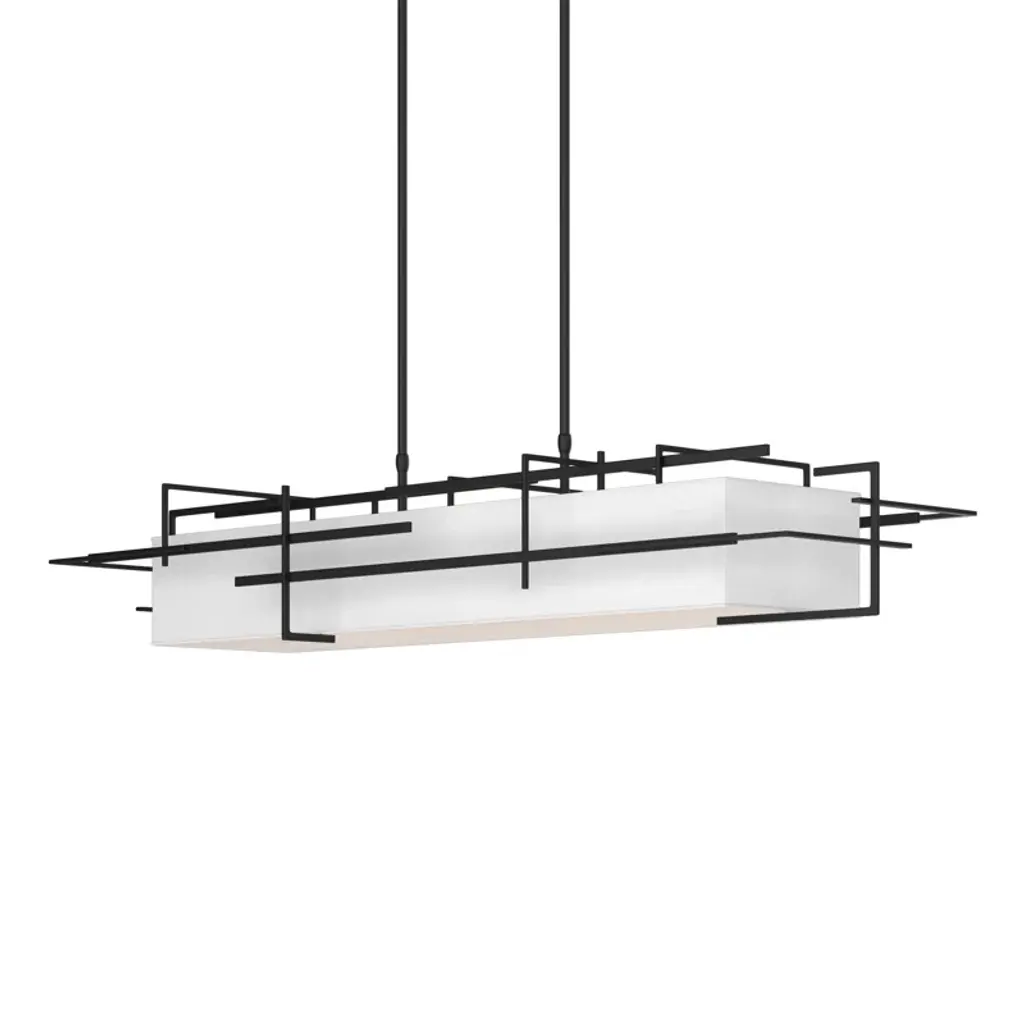 A modern take on a classic form, the Pendant is full 54" in width. A classic, rectangular shade is held within an abstract, Mondrian-esque hand-forged steel exoskeleton with clean lines and angles. An impressive and versatile lighting pendant is suited to a variety of design styles. All Hubbardton Forge products are hand-crafted to last one at a time in Vermont and backed by a Lifetime Limited Warranty.