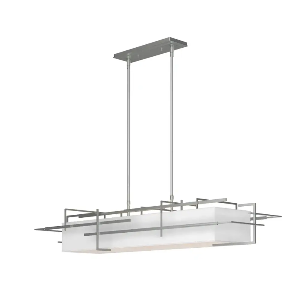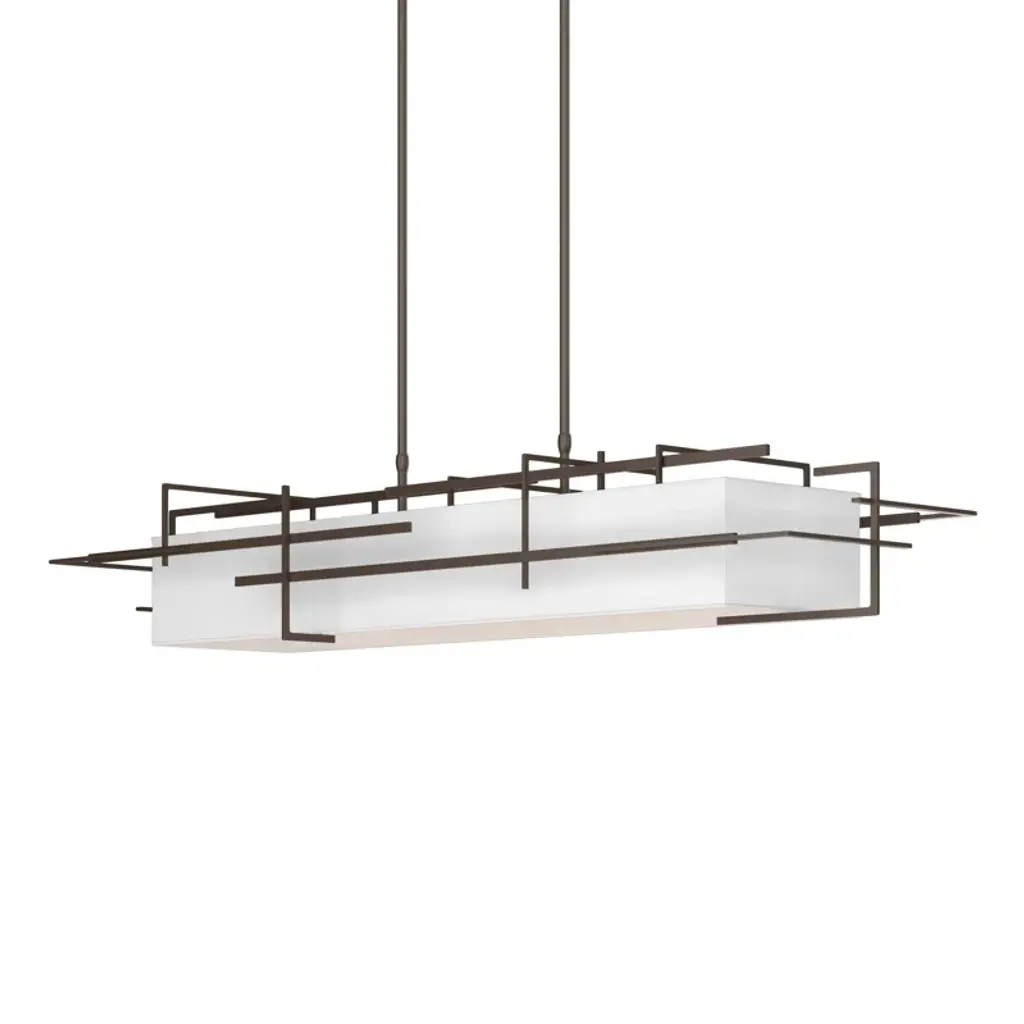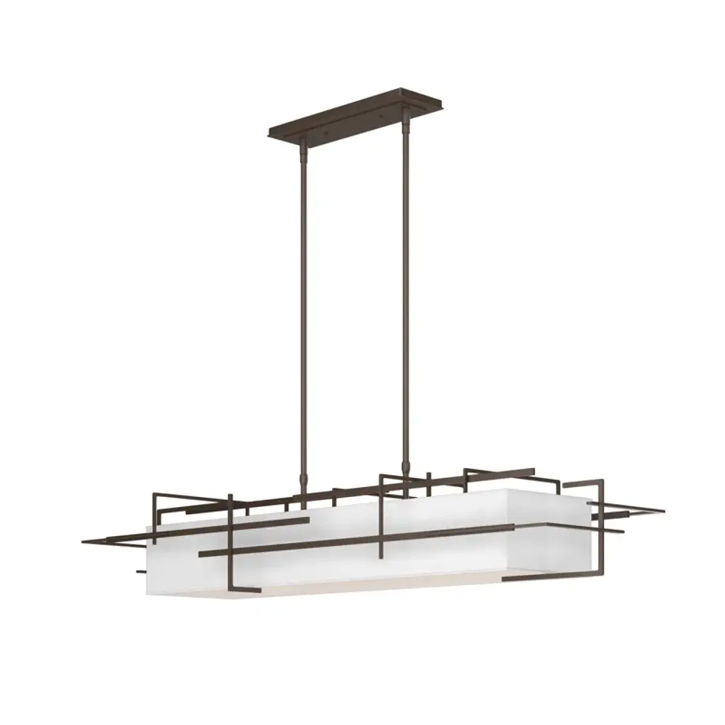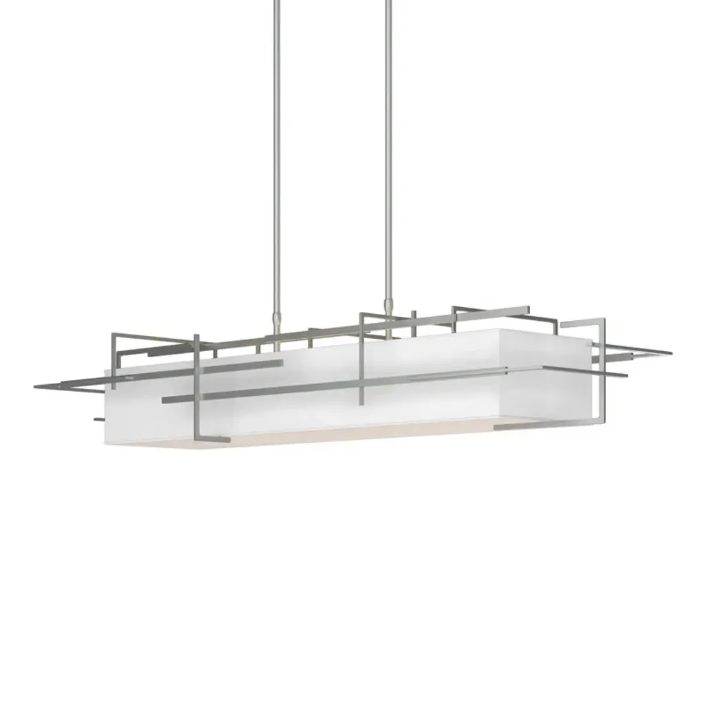 A modern take on a classic form, the Pendant is full 54" in width. A classic, rectangular shade is held within an abstract, Mondrian-esque hand-forged steel exoskeleton with clean lines and angles. An impressive and versatile lighting pendant is suited to a variety of design styles. All Hubbardton Forge products are hand-crafted to last one at a time in Vermont and backed by a Lifetime Limited Warranty.