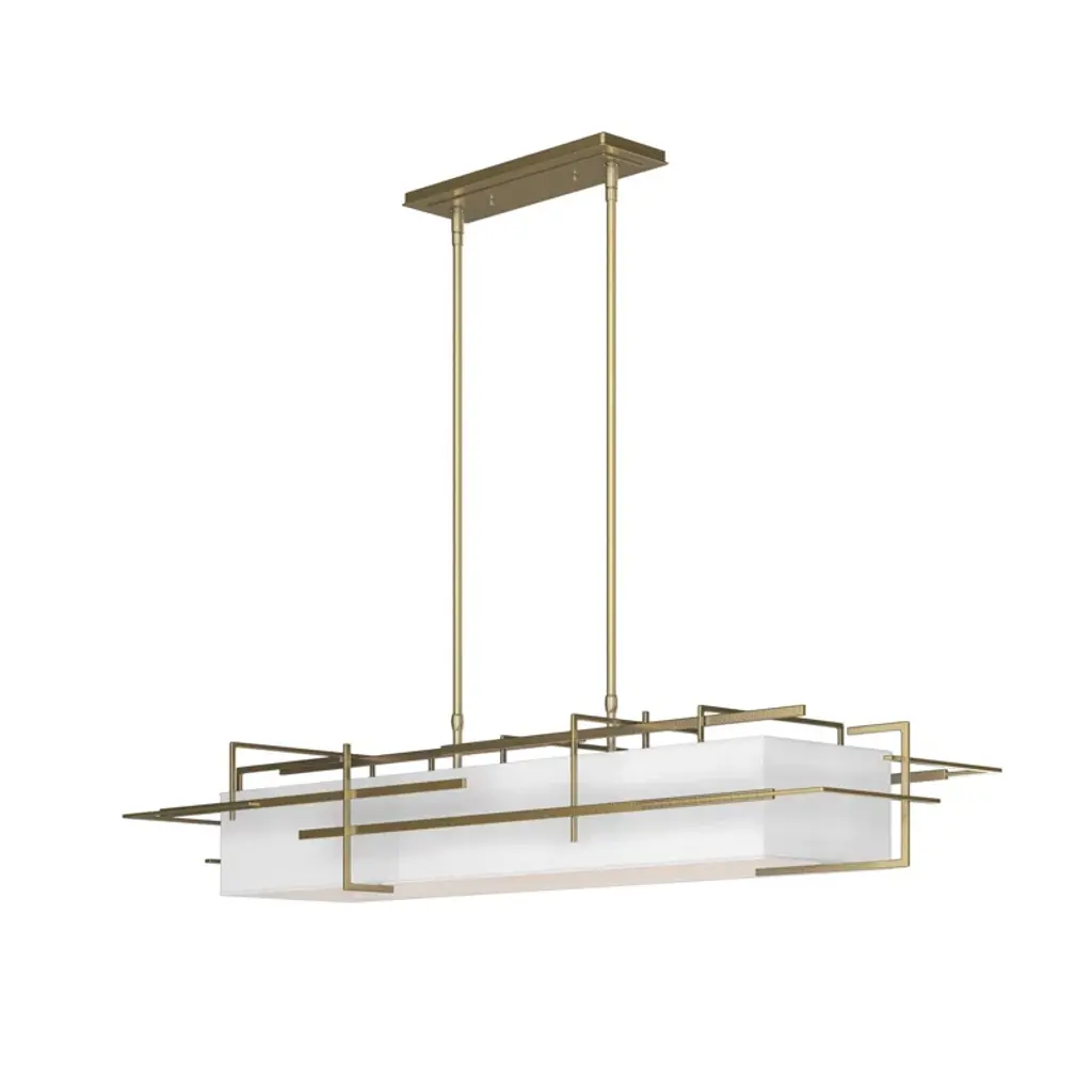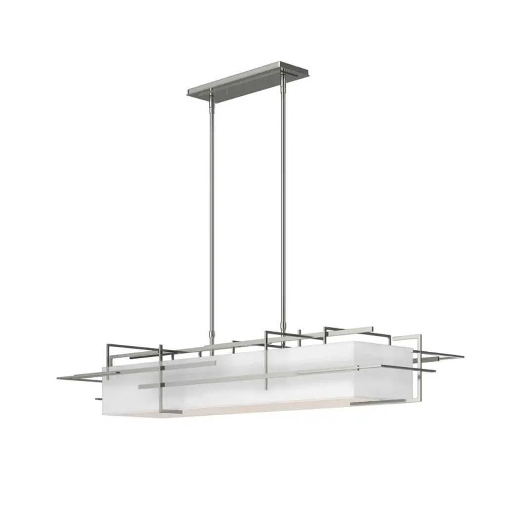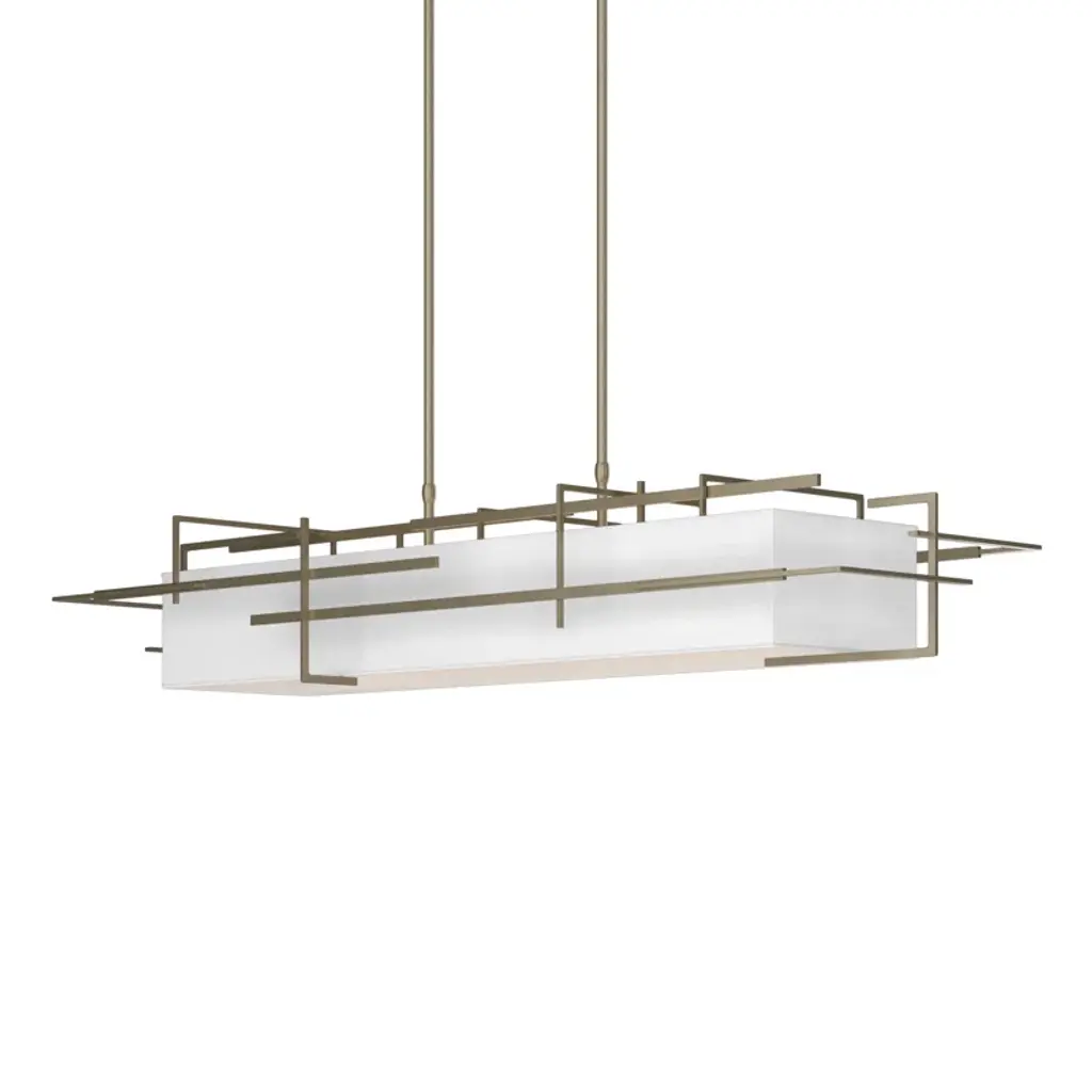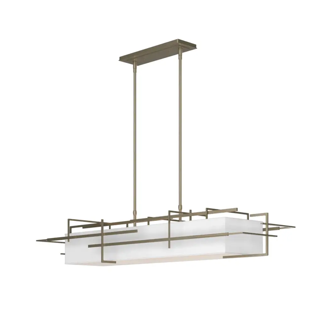 A modern take on a classic form, the Pendant is full 54" in width. A classic, rectangular shade is held within an abstract, Mondrian-esque hand-forged steel exoskeleton with clean lines and angles. An impressive and versatile lighting pendant is suited to a variety of design styles. All Hubbardton Forge products are hand-crafted to last one at a time in Vermont and backed by a Lifetime Limited Warranty.