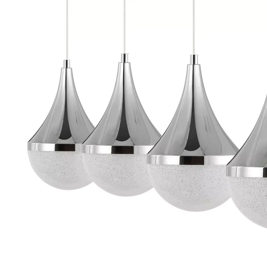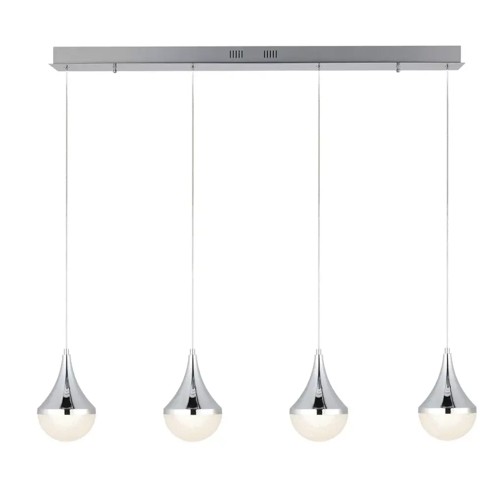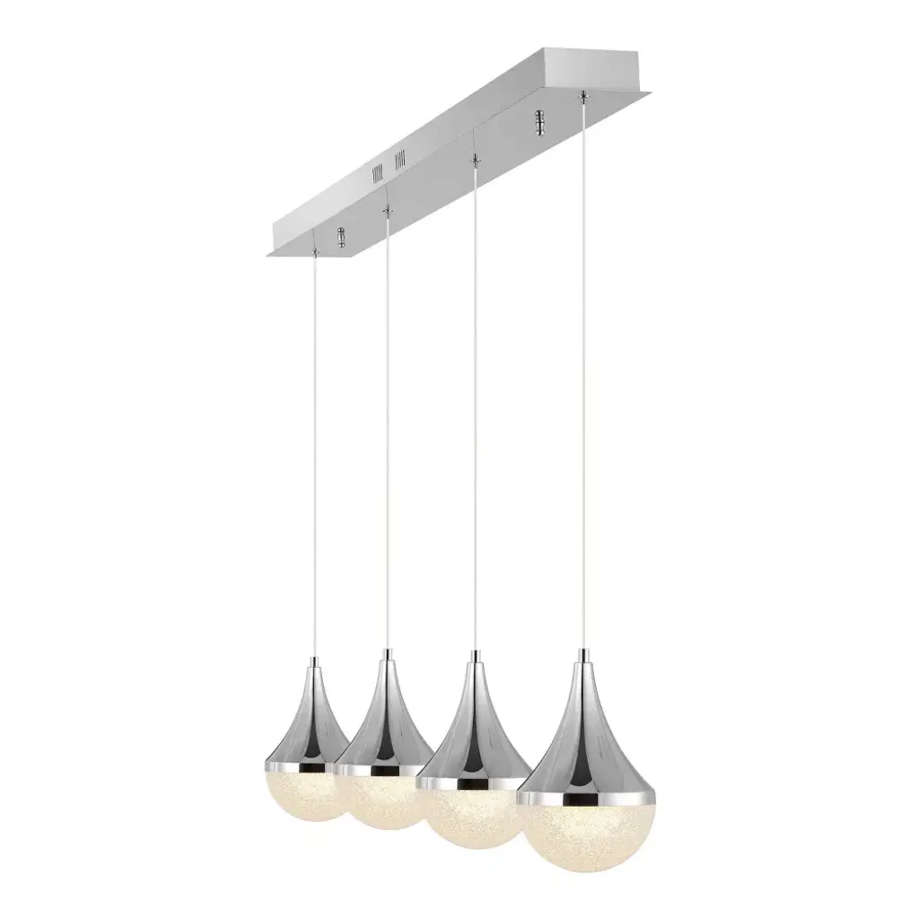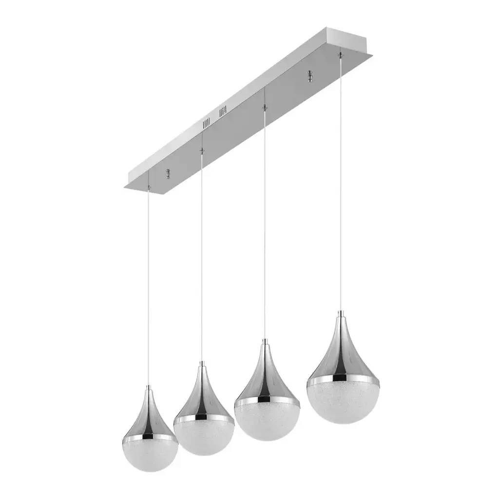 This sleek linear pendant has textured globes and a chrome finish for a touch of glam. Pendant heights are individually adjustable and integrated LED bulbs never need replacing; for ceilings up to twelve feet high. Replace outdated kitchen or dining room lighting with on-trend linear chrome pendants for a minimalist-modern makeover. Eco-friendly ed LED bulb included. Integrated 32W LED BulbBefore cleaning any lamp shade or fixture, disconnect the power source. Wipe with a soft, dry cloth. Avoid the use of chemicals and household cleaners as they may damage the finish.
