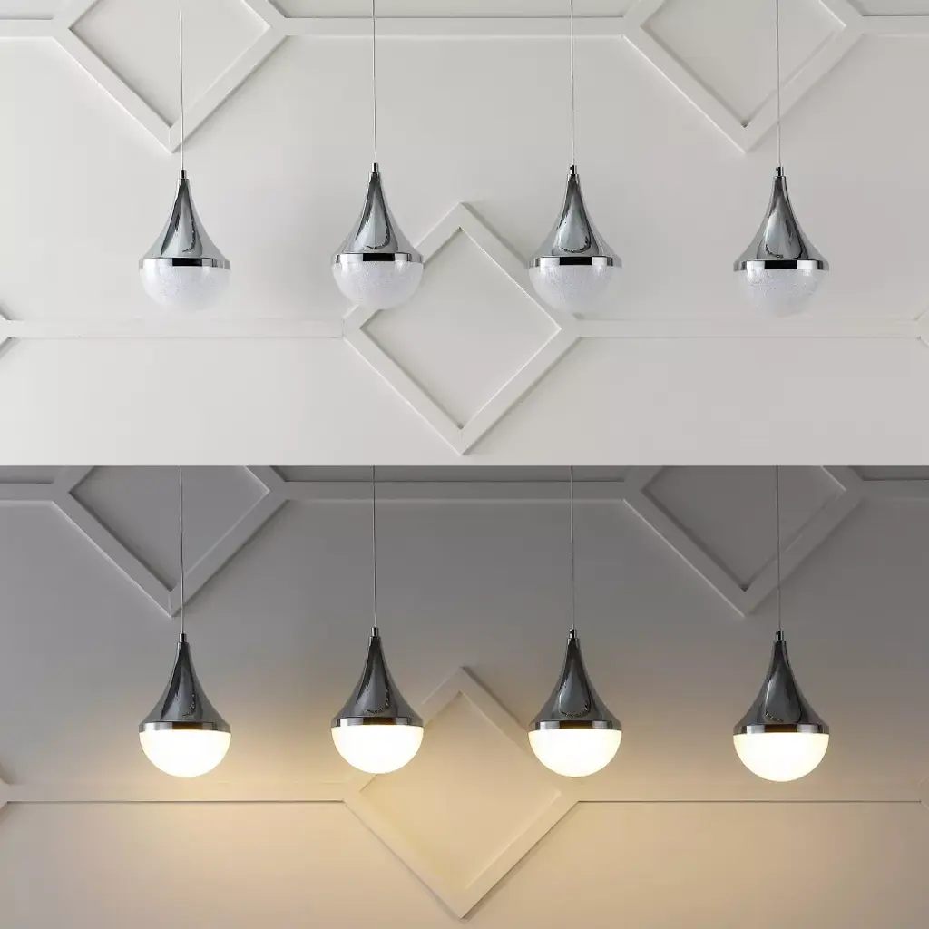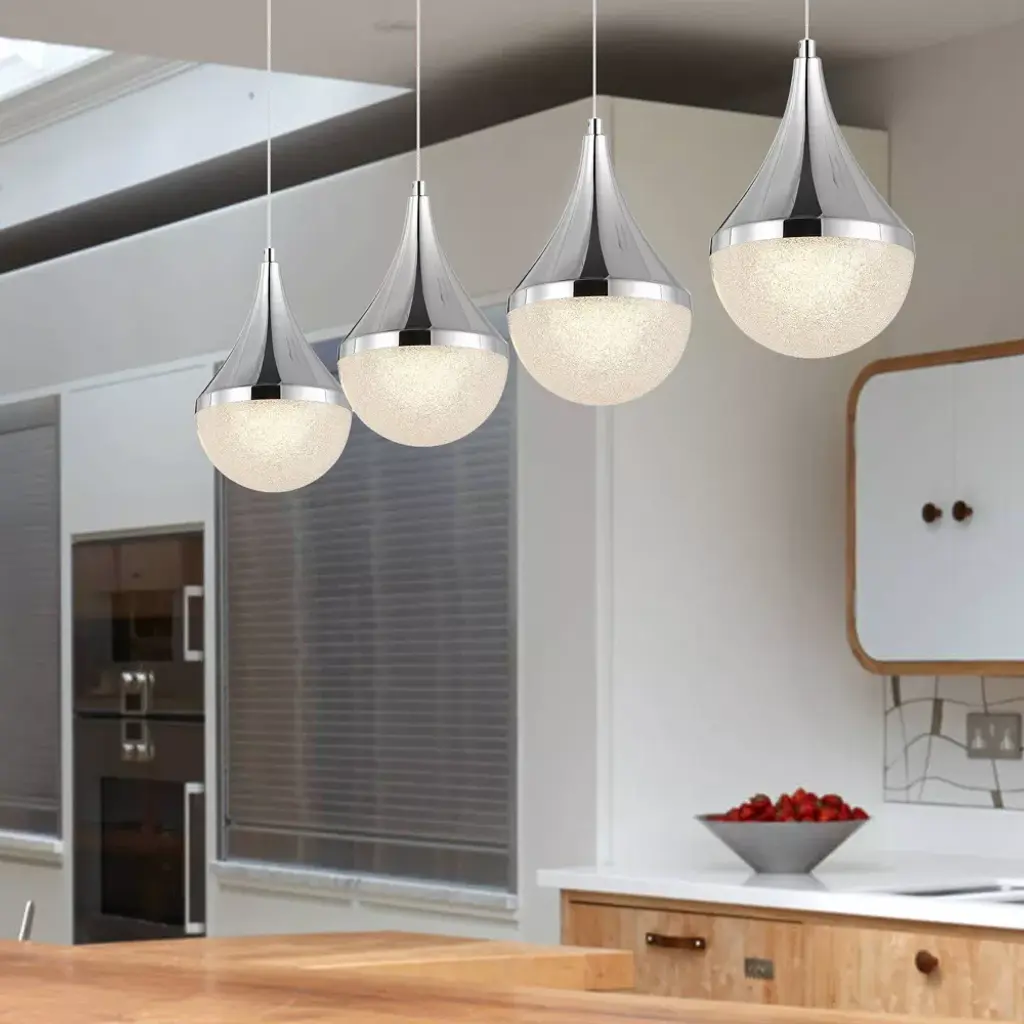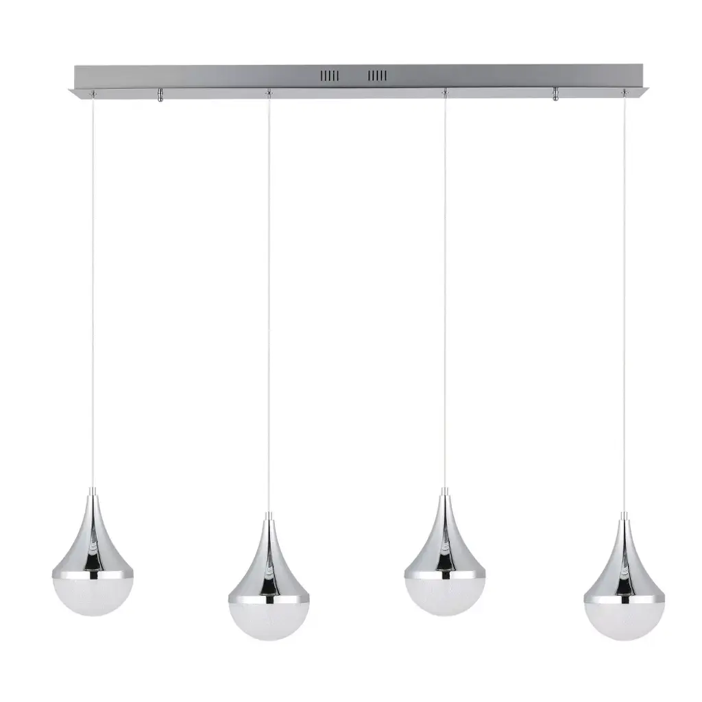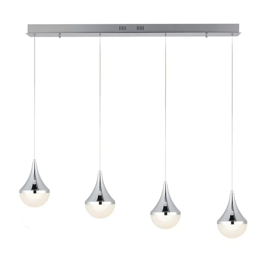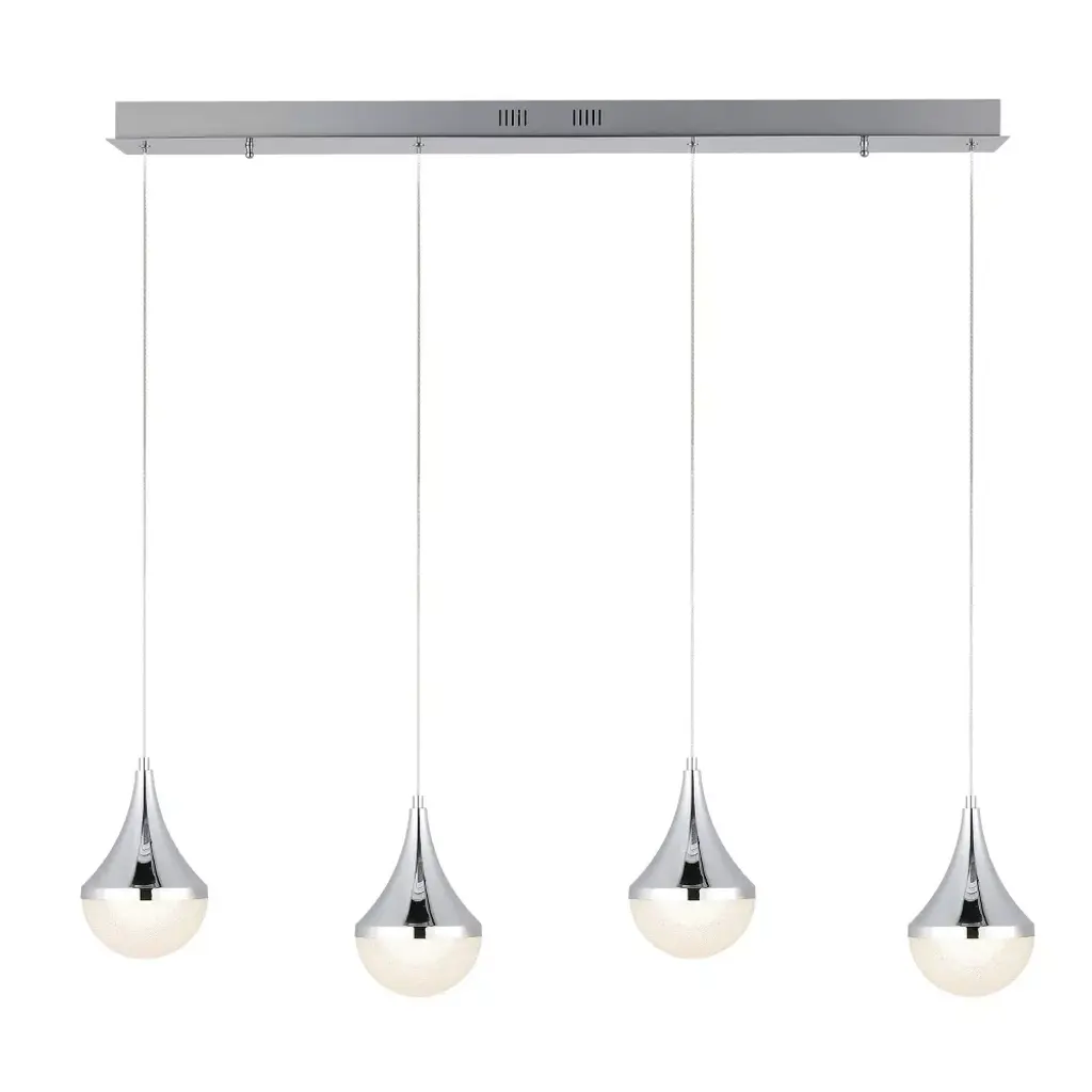 This sleek linear pendant has textured globes and a chrome finish for a touch of glam. Pendant heights are individually adjustable and integrated LED bulbs never need replacing; for ceilings up to twelve feet high. Replace outdated kitchen or dining room lighting with on-trend linear chrome pendants for a minimalist-modern makeover. Eco-friendly ed LED bulb included. Integrated 32W LED BulbBefore cleaning any lamp shade or fixture, disconnect the power source. Wipe with a soft, dry cloth. Avoid the use of chemicals and household cleaners as they may damage the finish.