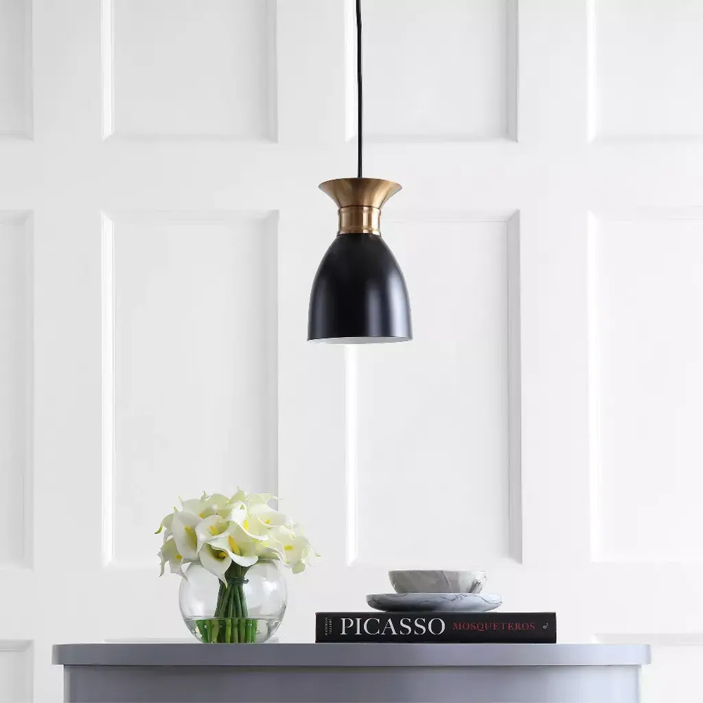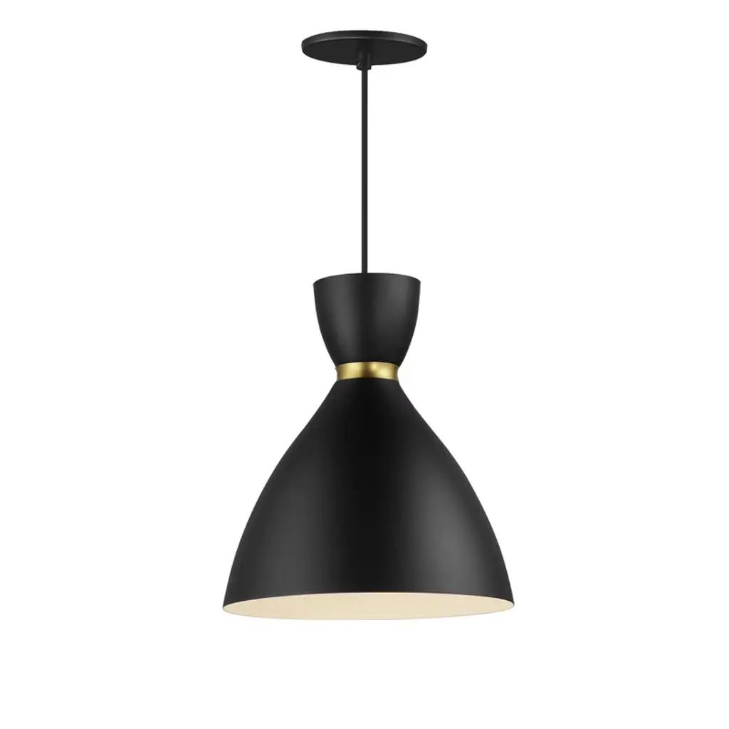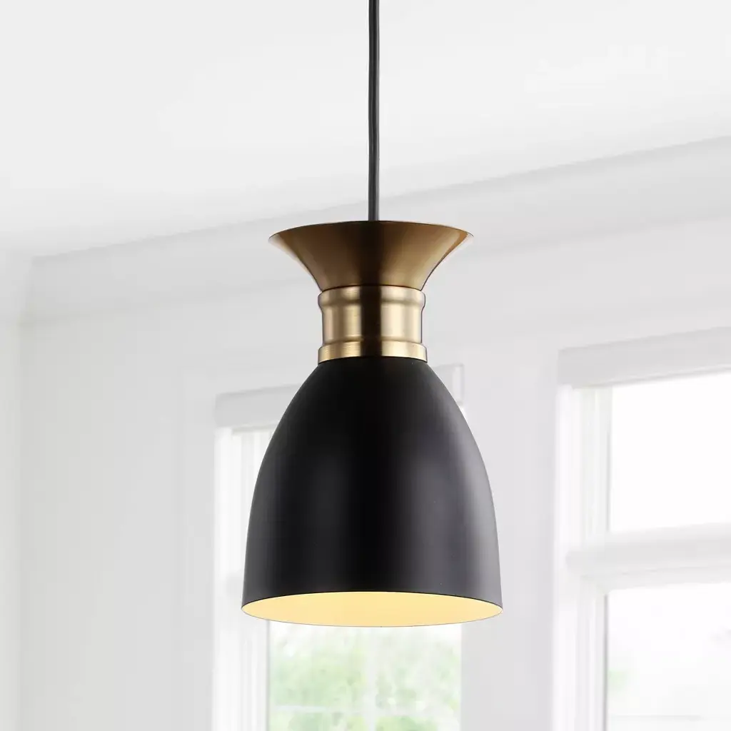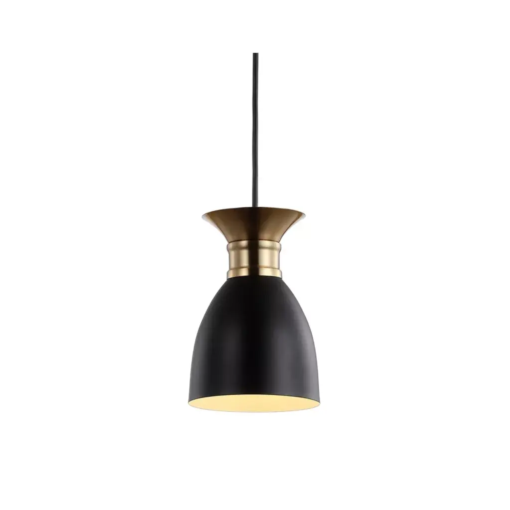 The gorgeous shade of this minimalist pendant is evocative of antique Japanese bud vases. With a combination of linear interest and alluring curves, the black and gold emphasize this now modern silhouette. We love using this style, with its smaller width, as hanging fixtures on either side of a bed in lieu of nightstand lighting, or over a kitchen sink.