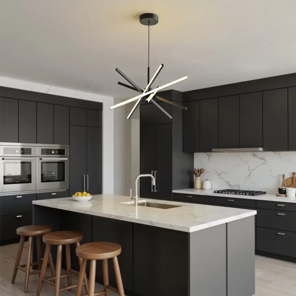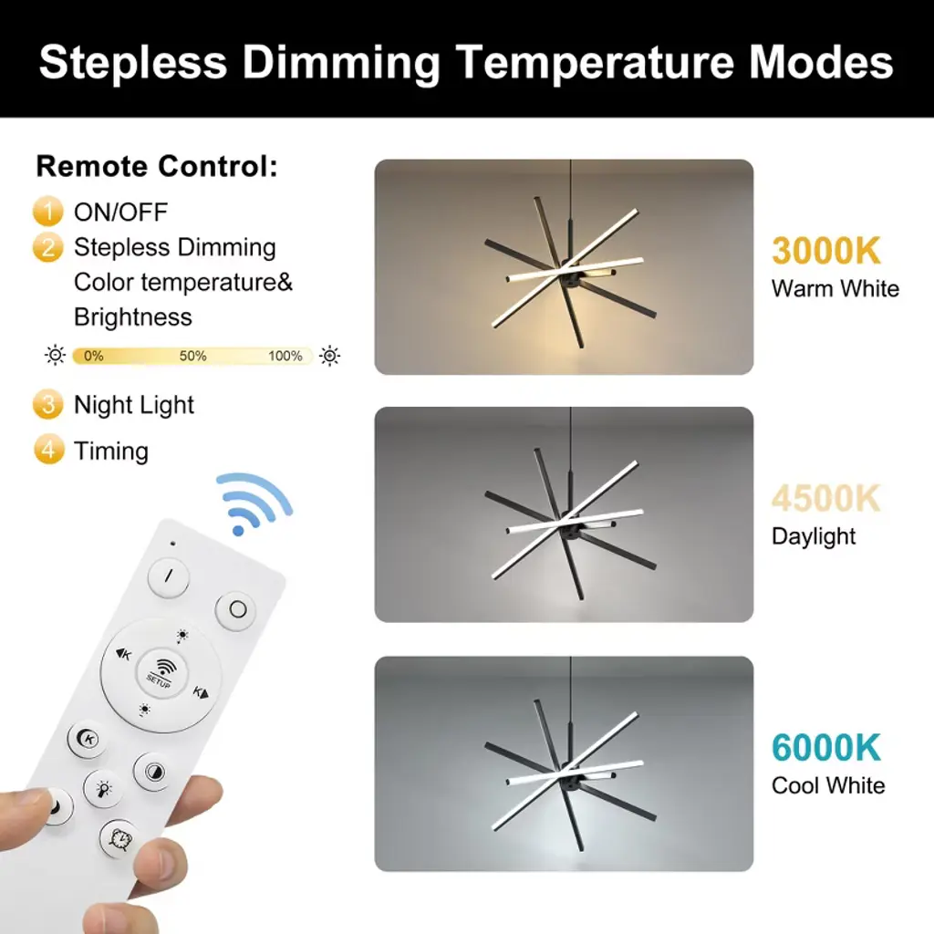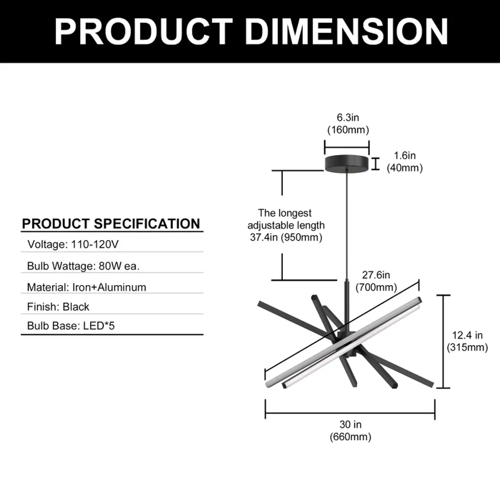 Illuminate your living space with this stylish 5-light LED chandelier featuring a matte black finish and modern metal aluminum tube design. Frosted PC shades provide soft, even lighting, creating a comfortable atmosphere. Easily adjust the color temperature between warm white (3000K), neutral white (4000K), and cool white (6000K) using the included remote control, allowing you to customize your lighting to suit any mood or occasion. The integrated energy-efficient LEDs offer long-lasting performance, while installation is hassle-free with all necessary hardware included. Perfect for dining rooms, living rooms, or bedrooms seeking contemporary elegance and versatile lighting.