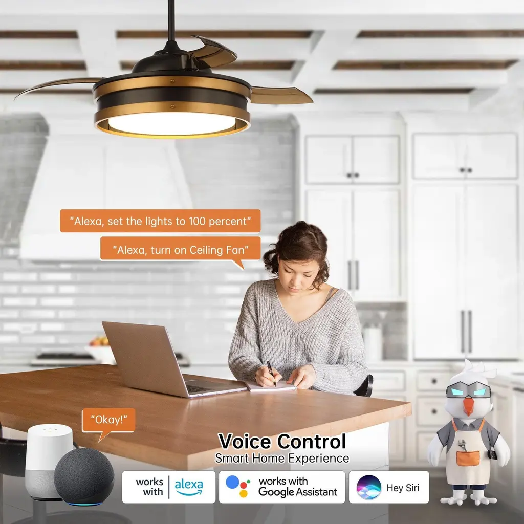 This Cochin 52-inch smart ceiling fan is compact and practical, suitable for use in large, dry indoor spaces. Featuring a black exterior and made from iron and acrylic, this fan features 3 reversible ABS blades that add a modern touch to any home decor. This smart fan can be used with WIFI, Alexa, Google, and apps. You can control your ceiling fan with simple voice commands or app control, making your life easier. At the same time, this Cochin smart fan comes with 3000K-6000K color-changing lights (3000K warm yellow light, 4000K bright daylight, 5000K cool white light), which can create an ideal atmosphere for your work, leisure, and parties.