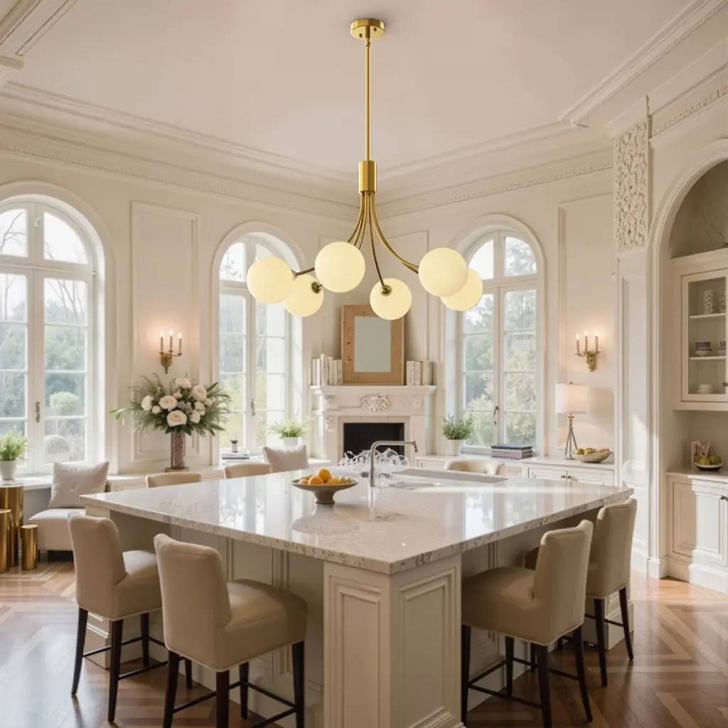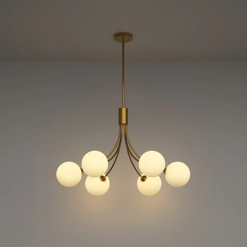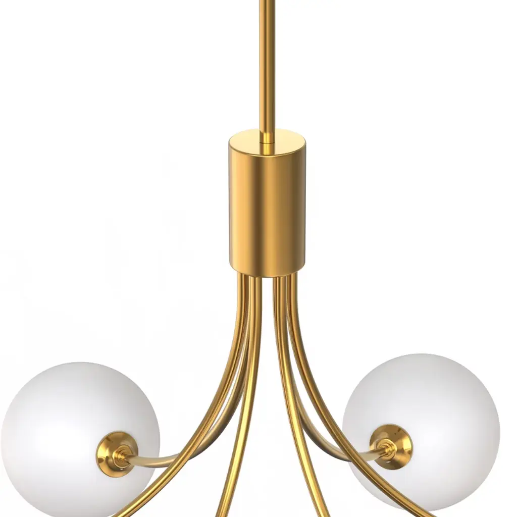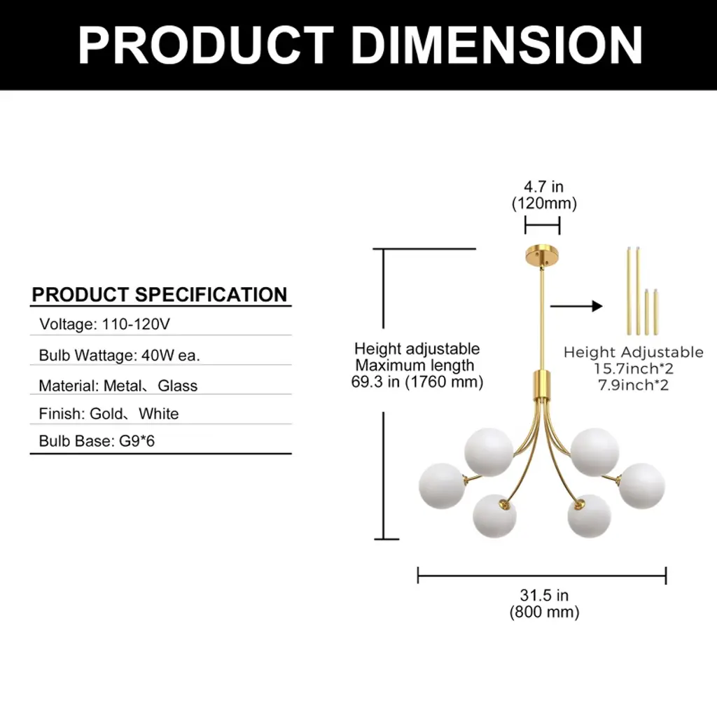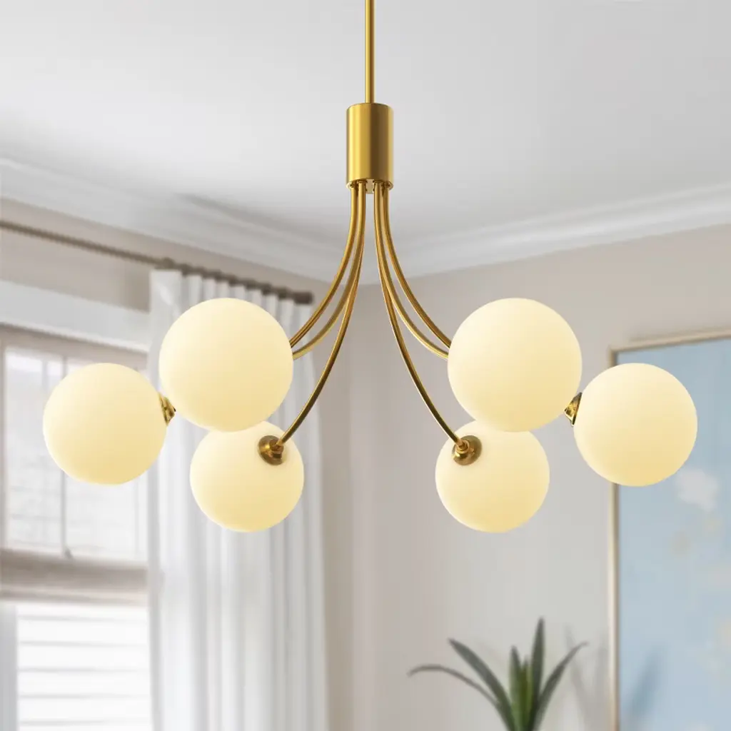 Make a bold statement with this vintage-inspired 6-light gold Sputnik chandelier. Featuring a sleek linear frame and 6 evenly spaced frosted globe glass shades, this eye-catching fixture combines classic mid-century style with modern elegance. The soft white frosted globes diffuse light beautifully, creating a warm and inviting atmosphere in dining rooms, living areas, or open-concept kitchens. Whether you're refreshing a retro interior or adding character to a contemporary space, this linear chandelier provides generous illumination and timeless style in 1 stunning package. It's the perfect blend of artful design and practical lighting.
