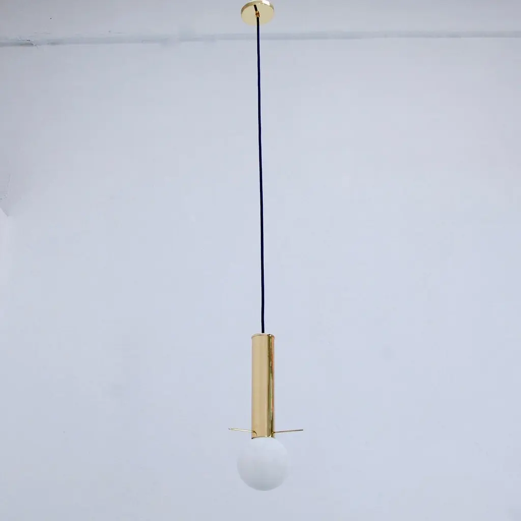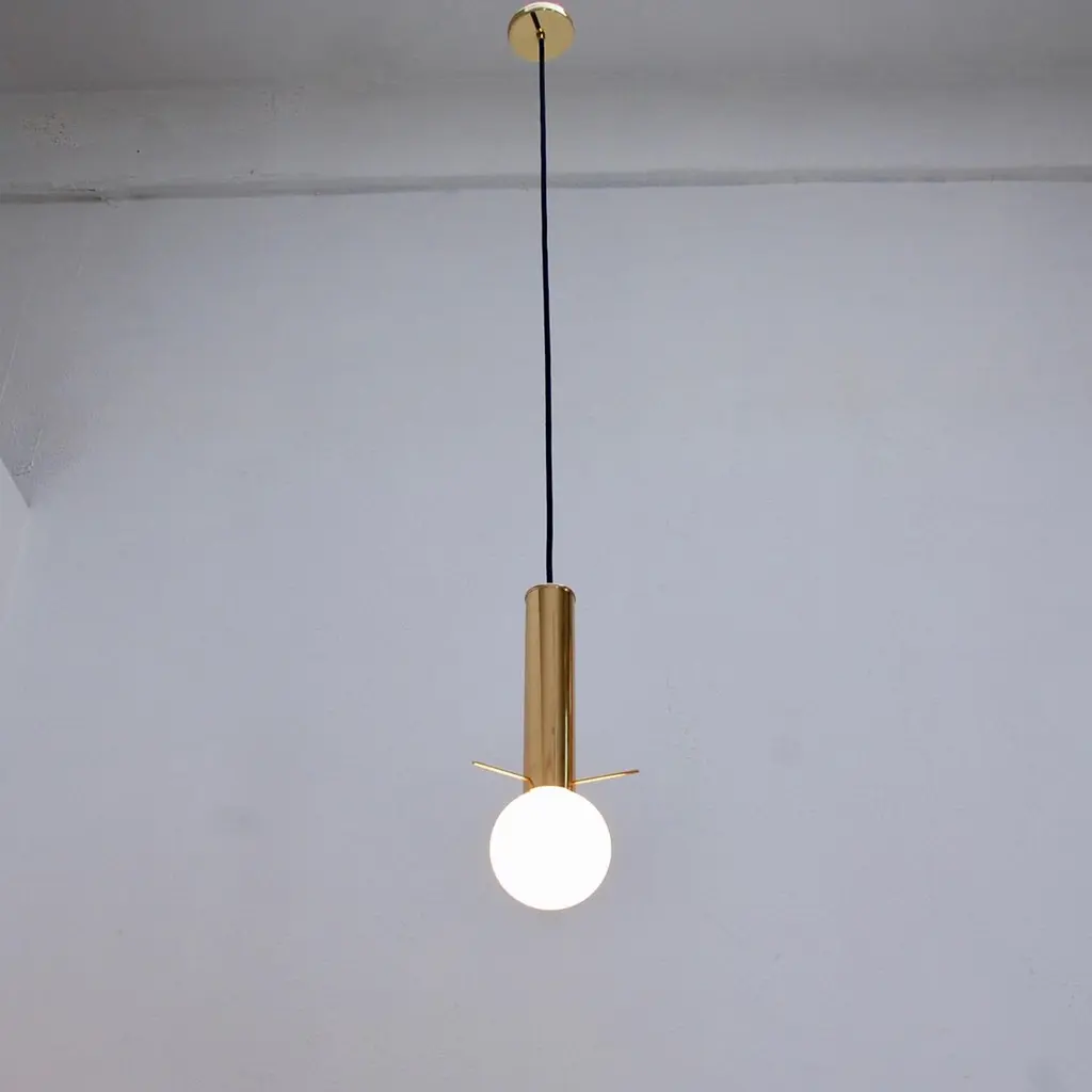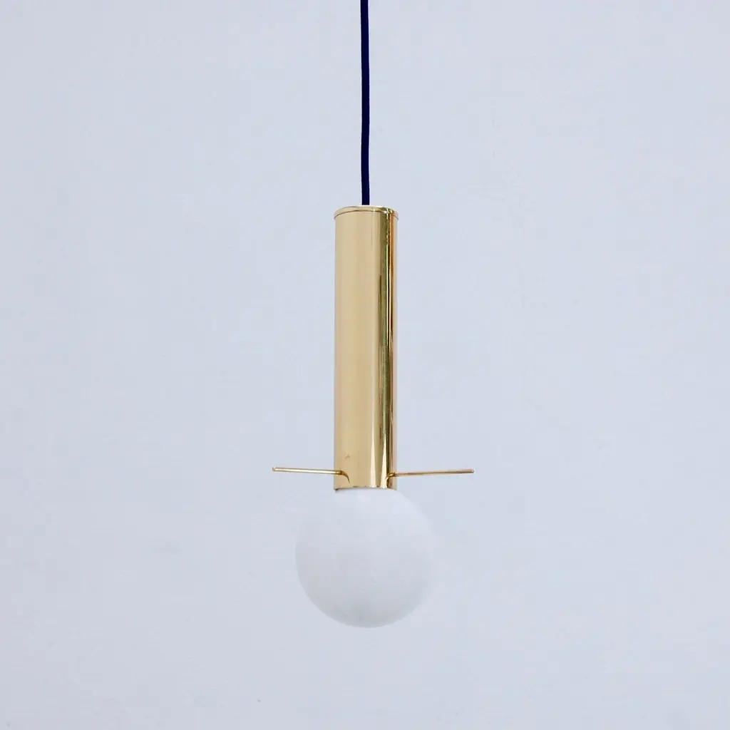 (7) Of the period American 1960s brass pendants with G40 LED bulbs and tri-pin detailing. Fully restored. Wired for the US with a single E26 based socket. Light bulb included with order. Overall drop adjustable upon request. Sold individually.Measurements:OAD: 55”Fixture height: 14.75” with bulbDiameter: 7”.