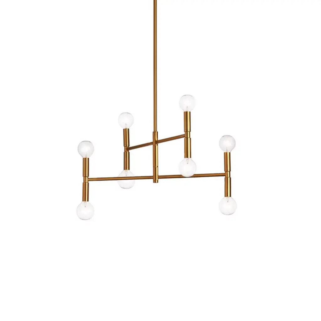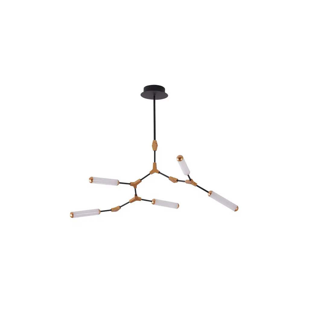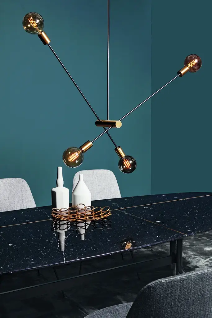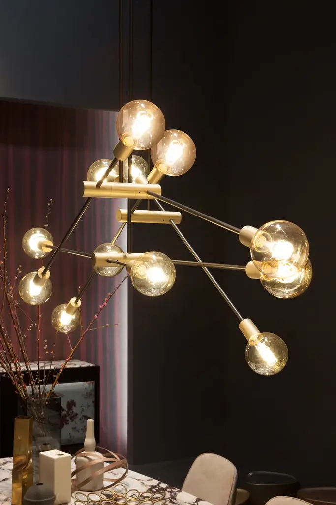 The suspended lamp 7000 Itinerari is perfect to light up and be hung over formal dining tables.The play on geometries created by the intersection of tubes make its design dynamic, while the lightness of its lines is emphasized by the play on lights.Technical featuresFrame: black varnished tubular structure with brass intersections and end elementsCeiling rose: brassIncluded light bulbs: E27 max 60W CE