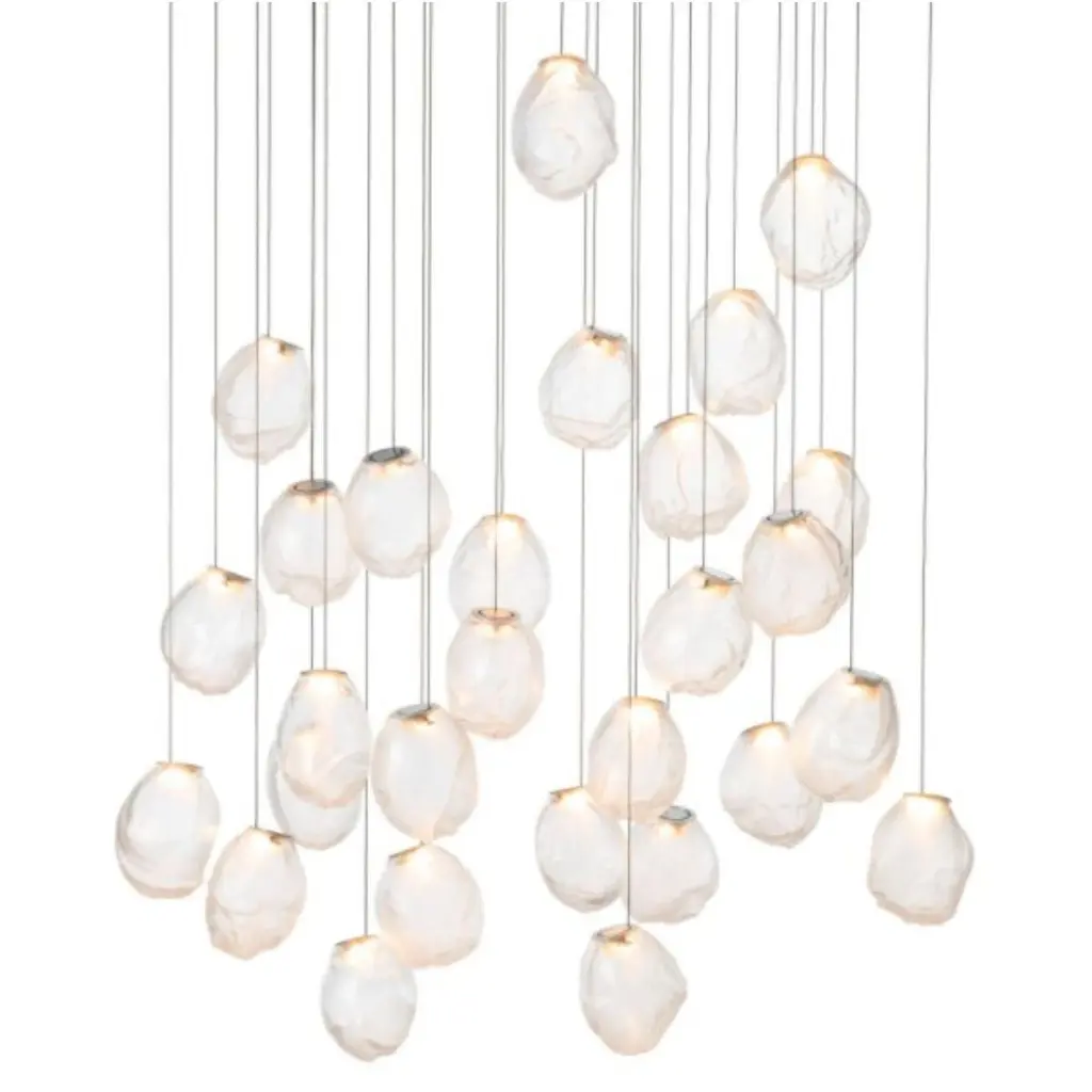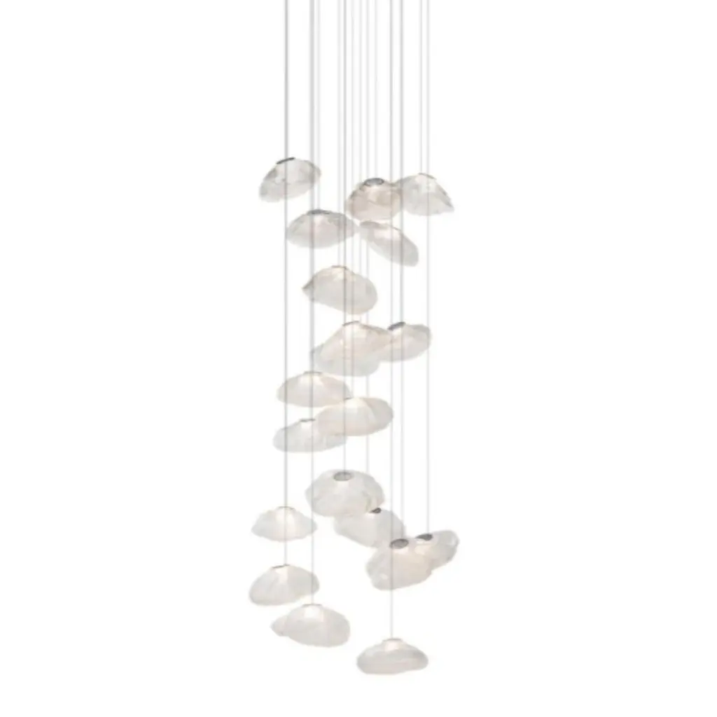 73.20 Pendant by BocciDimensions: D75.5 x H300 cmMaterials: brushed nickel round canopyWeight: 69 kgAlso available in different dimensions and colours.All our lamps can be wired according to each country. If sold to the USA it will be wired for the USA for instance.73V is an expansion of the technique used to create Bocci’s popular 73 series. The new pendant features a novel oblong shape and gradient colour range. 73V results from blowing molten glass into a folded, heat-resistant ceramic fabric. The resulting shape has a formal and textural expression intuitively associated with fabric, which becomes permanent as it cools. A light source is positioned at the top of each pendant, accentuating the volumetric perception of the piece as well as the gradation of colour.Bocci is a design and manufacturing company based in Vancouver and Berlin. Founded in 2005 under the creative directorship of Omer Arbel, Bocci is committed to fostering a lateral and open-ended relationship between creative direction and craft. The company launched with one lighting design, ‘14’, which became an instant classic and remains a design staple and bestseller. Bocci’s growing portfolio of sculptural lighting is developed, engineered and fabricated in-house, through an infrastructure calibrated to provide full control over technique, quality and scale.In 2015, Bocci transformed a historic Berlin building into a showroom and archive. ‘Bocci 79’ inhabited a 2,200 m² / 23,600 sq ft former courthouse, constructed in 1896, and showcased over a decade of works by Omer Arbel, ranging from pieces in progress, prototypes and ideas, to the complete range of catalogue pieces developed for Bocci.