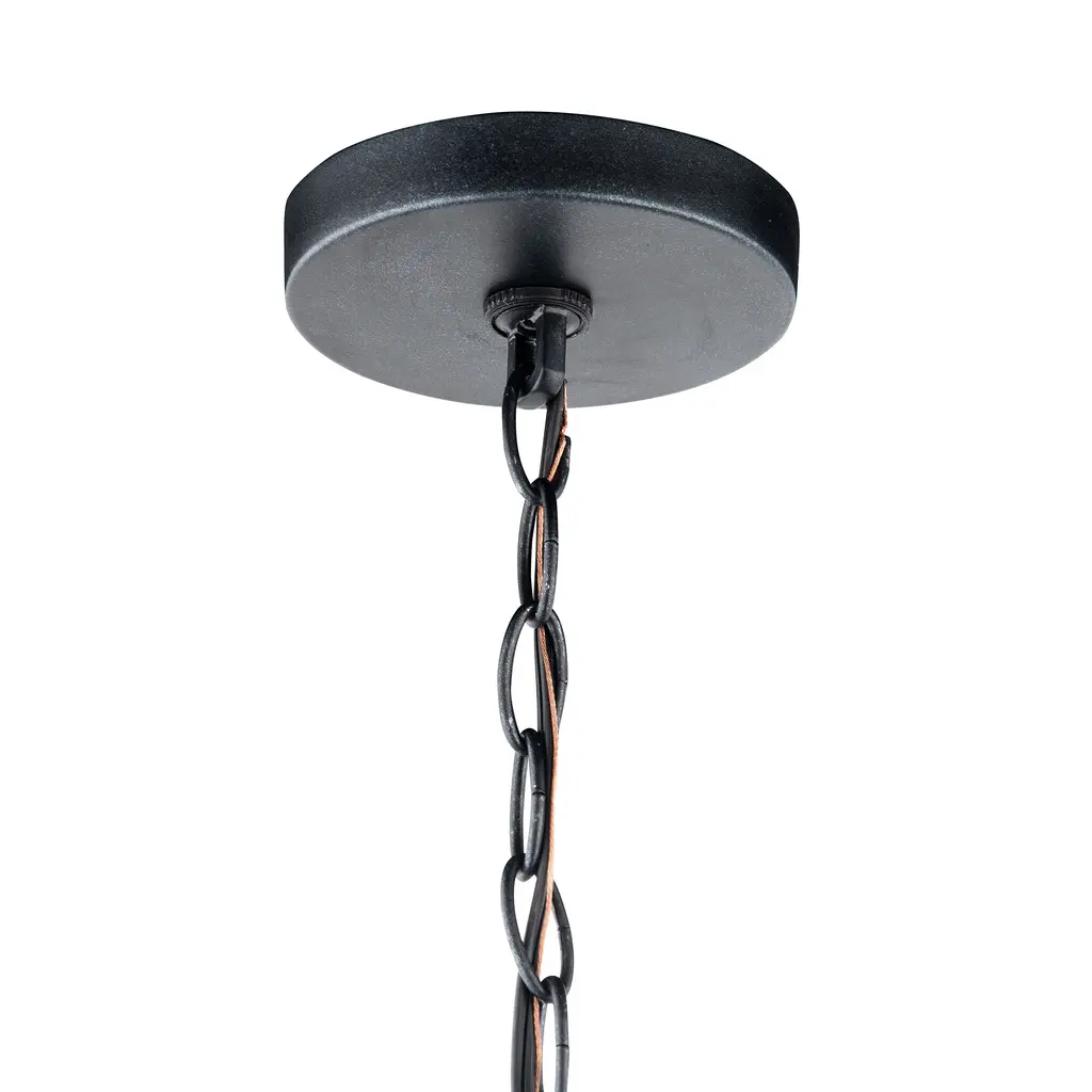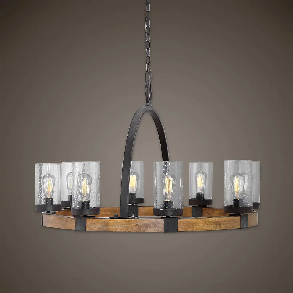 This stunning pendant light combines the rustic charm of a wooden wagon wheel with the industrial appeal of metal accents. The heavy-gauge wooden frame, finished in a mid-tone, adds warmth and character, while the clear seeded glass shades create a soft, inviting glow. The deep weathered bronze finish of the iron-wrapped frame and large circular hook adds a touch of rugged elegance. This unique piece is perfect for creating a focal point in any space. Product Features: Brown and clear ceiling pendant Showcases heavy gauge real wood frame wooden wagon design Comes with clear seeded glass shades Includes iron wrapped frame and large circular hook Accented with weathered bronze finish Uses (8) 60 watt max, Edison socket; bulbs not included Chain for adjustable installation Recommended for indoor use only Additional Features: Wattage: 60W Bulb Type: TYPE A Socket Type: E26 Bulb Quantity: 8 Dimension: Overall Dimension: 24.5" high x 39" diameter Shade Dimension: 7.75" high x 4.25" diameter Canopy Dimension: 1" high x 6" diameter Wire Length: 20' long Chain Length: 7' long Material(s): wood/metal/glass