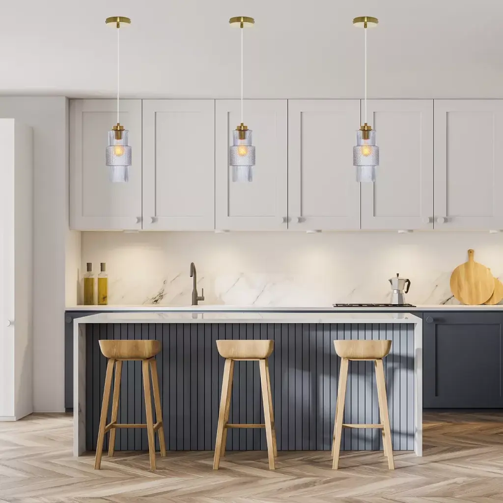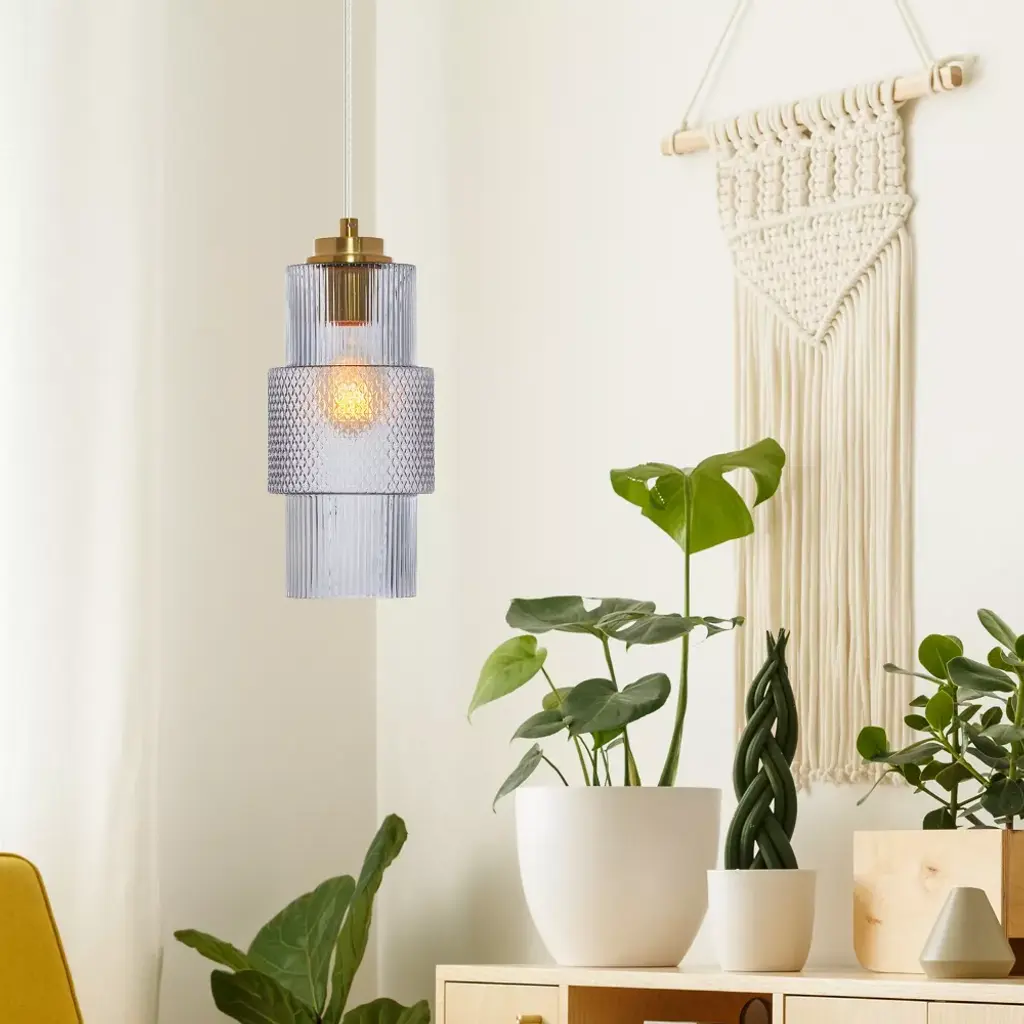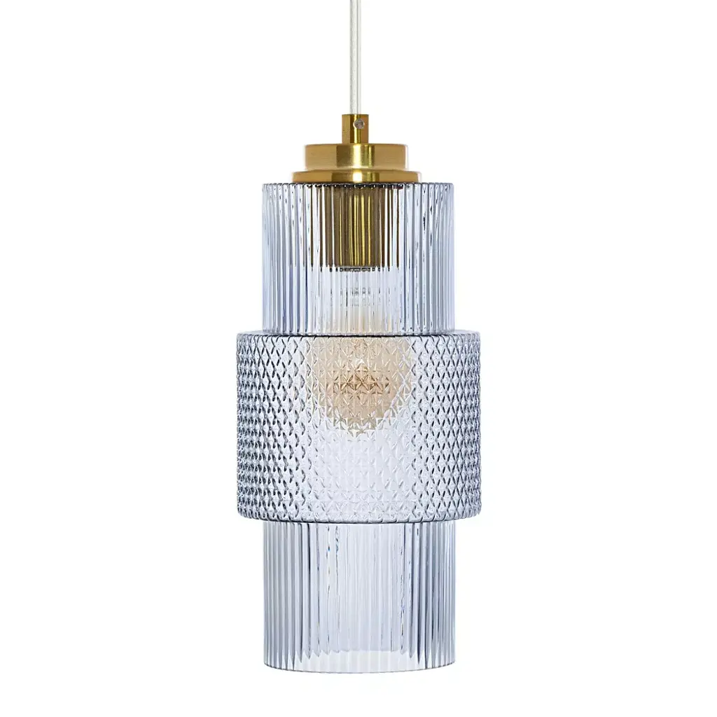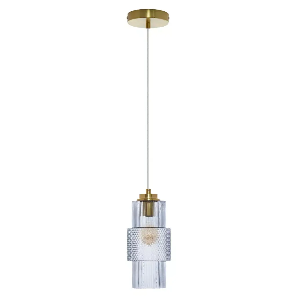 Add a statement piece to your interior lighting with this 9.75" H Noah Pillar Shade Pendant Light from River of Goods. Showcasing a brushed gold-finish metal base and a blue glass pillar shade with a wider, textured center, this pendant exudes retro style. It casts a warm, constant glow with one 40-watt E26 bulb (not included) and is also LED compatible. Best of all, the adjustable hanging wire allows you to set the drop height to anywhere from 12.75 to 60.75 inches to best fit your space.