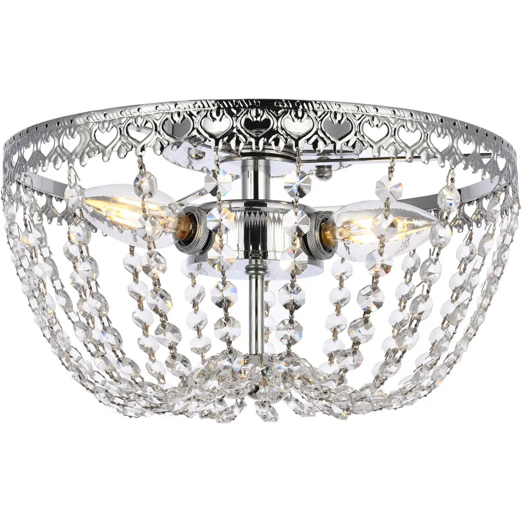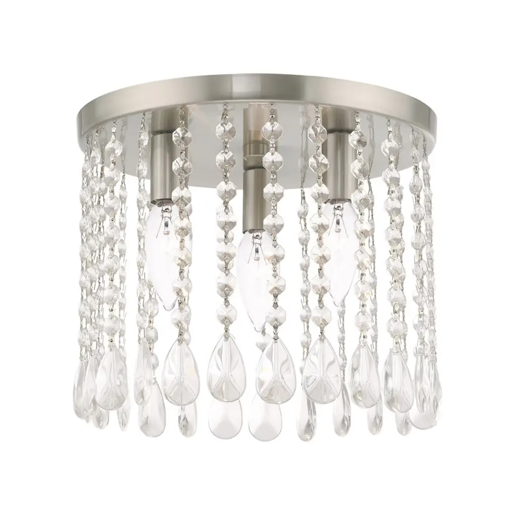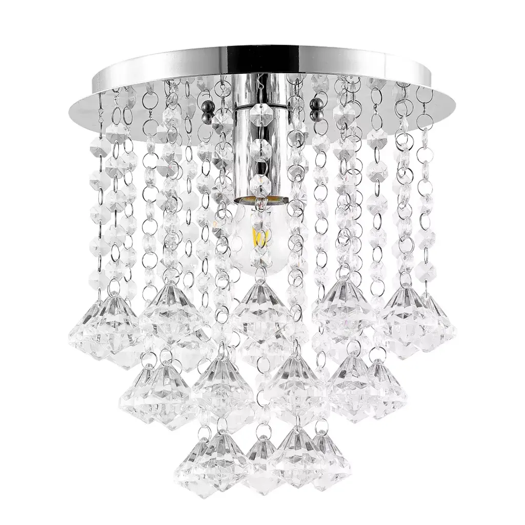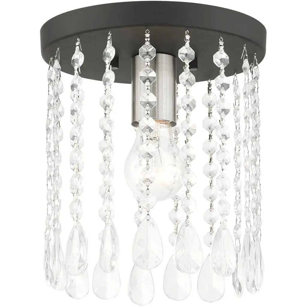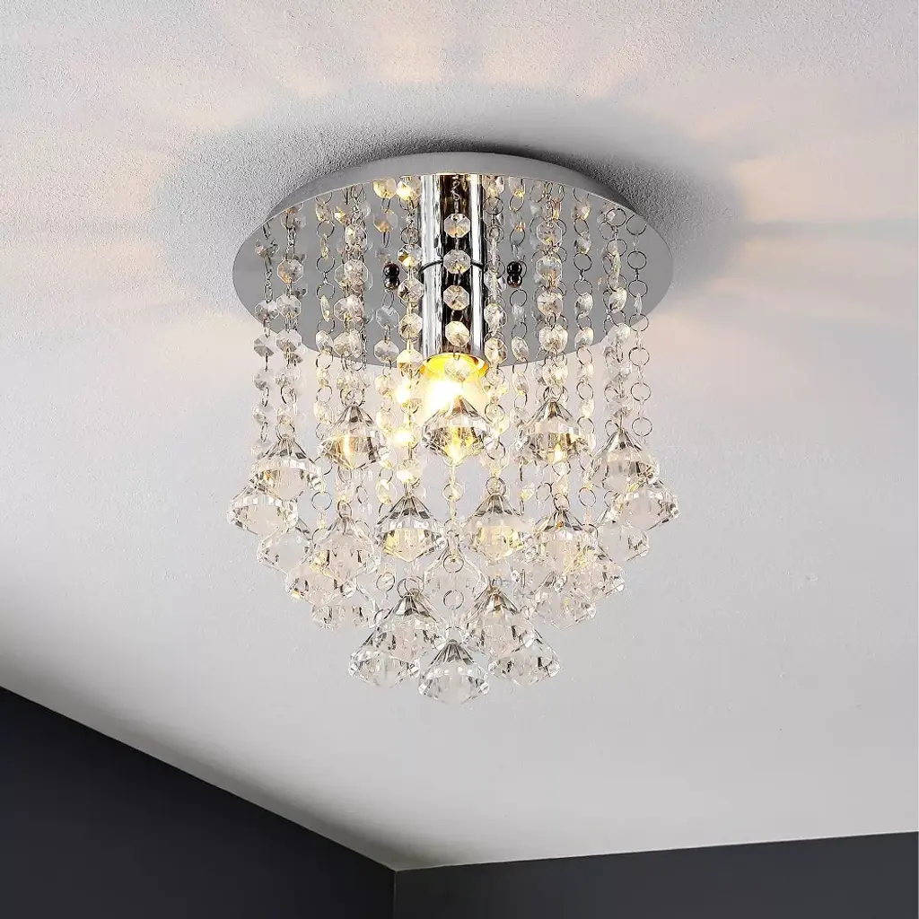 Replace outdated ceiling lights with this modern glam light fixture for an instant update. At just under 11" high, this sparkly light fixture is ideal for eight-to-ten foot ceilings. Our light fixtures work with LED-compatible dimmers; professional installation is recommended. Eco-friendly 4W LED bulb included. Takes 1 bulb and compatible with TYPE "B" 25W or CFL 9W or LED 5W. Color Temperature: 2700K. CRI: 80. Before cleaning any lamp shade or fixture, disconnect the power source. Wipe with a soft, dry cloth. Avoid the use of chemicals and household cleaners as they may damage the finish.