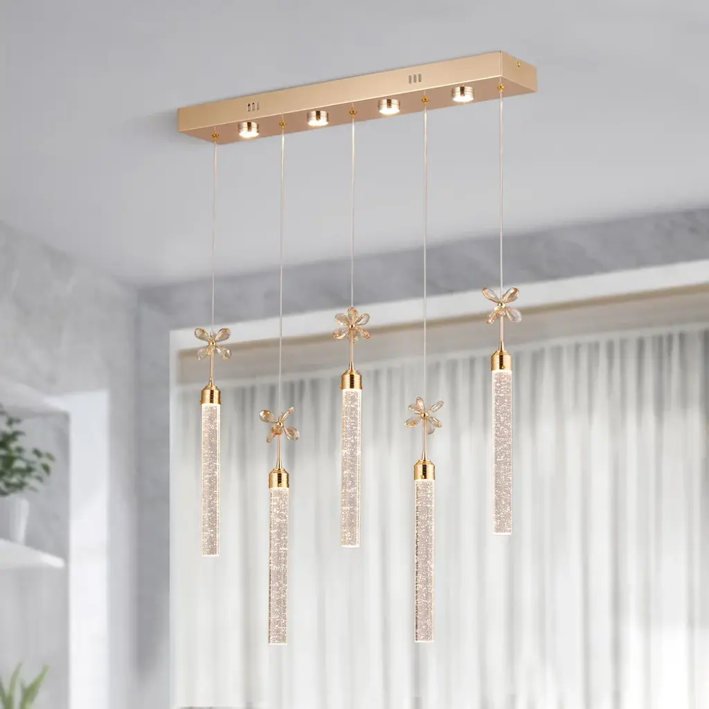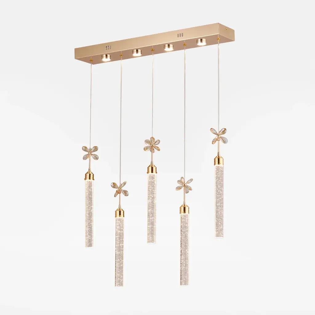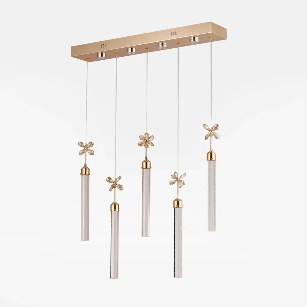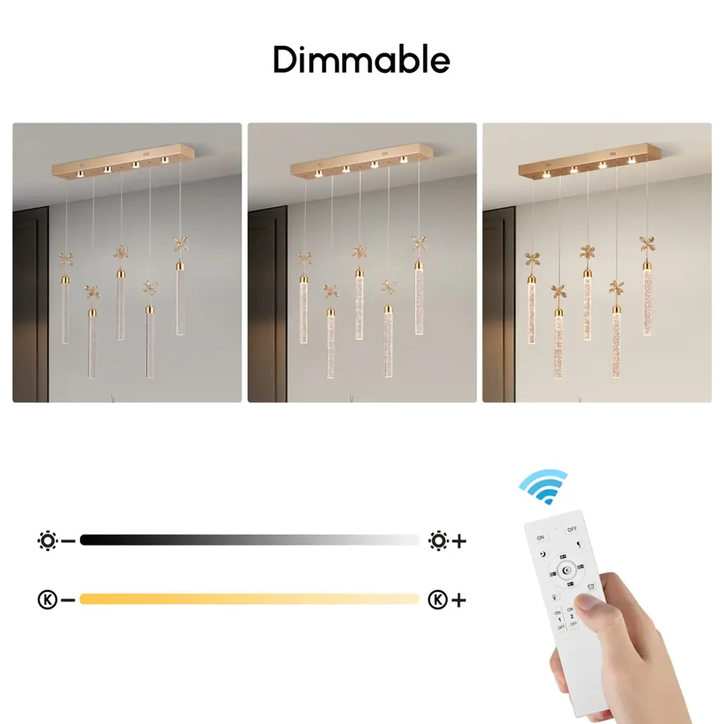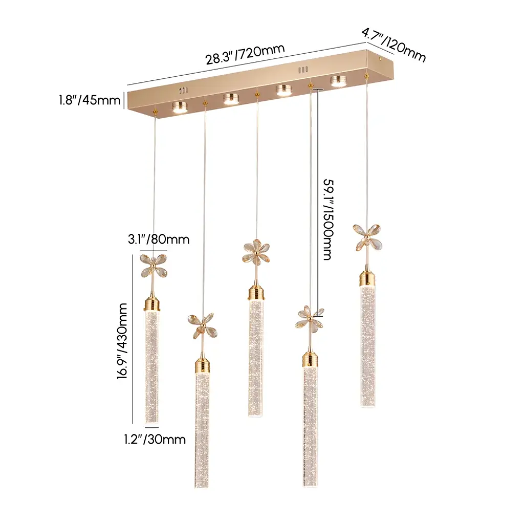 Illuminate your dining space with refined elegance using this luxury gold pendant chandelier. Measuring 28.3 inches wide, this fixture features five graceful pendant lights suspended from a sleek rectangular gold ceiling plate. Each pendant showcases a crystal-textured acrylic tube topped with a delicate flower design, combining artistic beauty with modern lighting function. Built for versatility, this chandelier supports 3 adjustable color temperatures (Warm, Neutral, and Cool White) and stepless dimming for the perfect lighting ambiance. Height-adjustable cables allow for customization according to your ceiling height and layout. A standout feature of this design is the integrated four built-in ceiling spotlights on the canopy, which enhance the overall brightness and highlight the pendants below — perfect for both ambient and task lighting. Ideal for dining areas, living rooms, kitchen islands, bars, or foyers, this chandelier brings both beauty and brilliance to your space.
