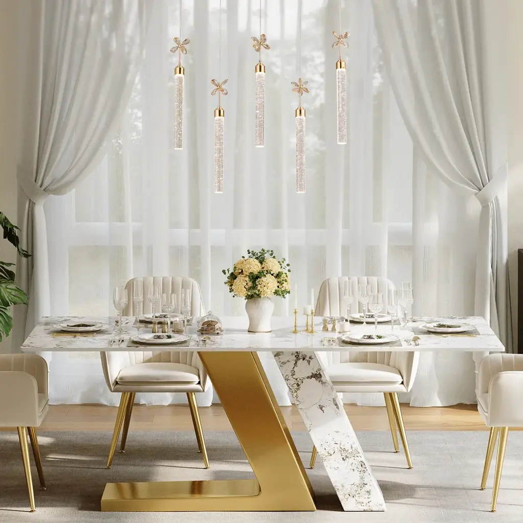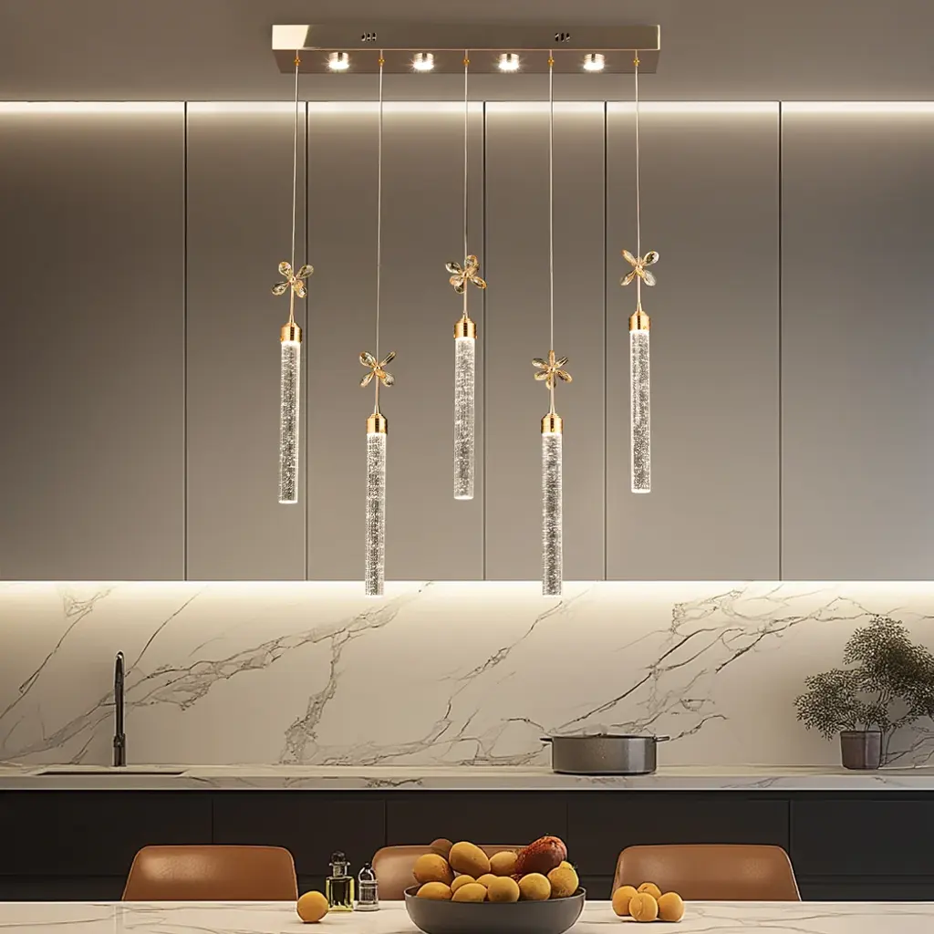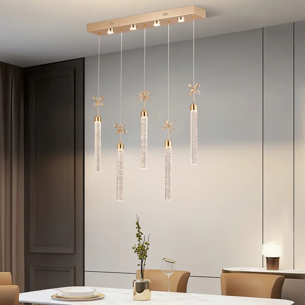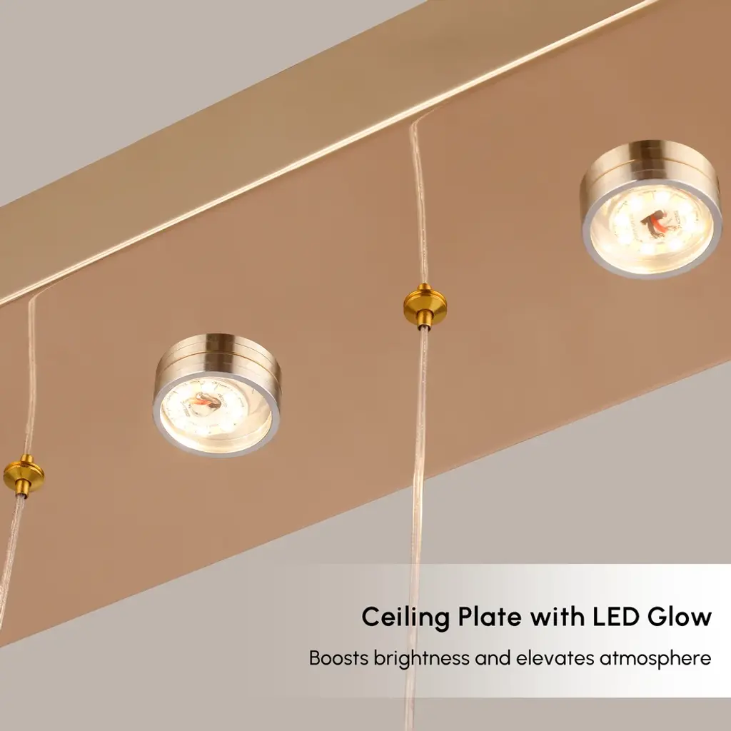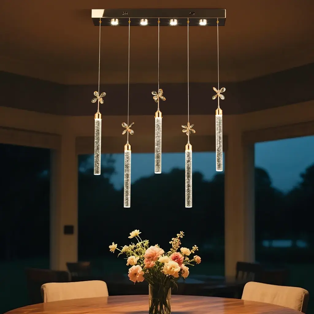 Illuminate your dining space with refined elegance using this luxury gold pendant chandelier. Measuring 28.3 inches wide, this fixture features five graceful pendant lights suspended from a sleek rectangular gold ceiling plate. Each pendant showcases a crystal-textured acrylic tube topped with a delicate flower design, combining artistic beauty with modern lighting function. Built for versatility, this chandelier supports 3 adjustable color temperatures (Warm, Neutral, and Cool White) and stepless dimming for the perfect lighting ambiance. Height-adjustable cables allow for customization according to your ceiling height and layout. A standout feature of this design is the integrated four built-in ceiling spotlights on the canopy, which enhance the overall brightness and highlight the pendants below — perfect for both ambient and task lighting. Ideal for dining areas, living rooms, kitchen islands, bars, or foyers, this chandelier brings both beauty and brilliance to your space.