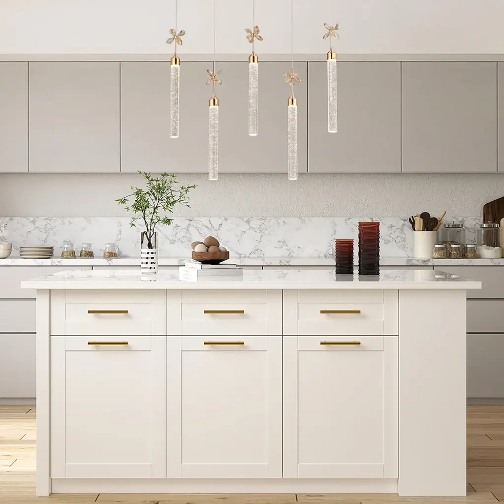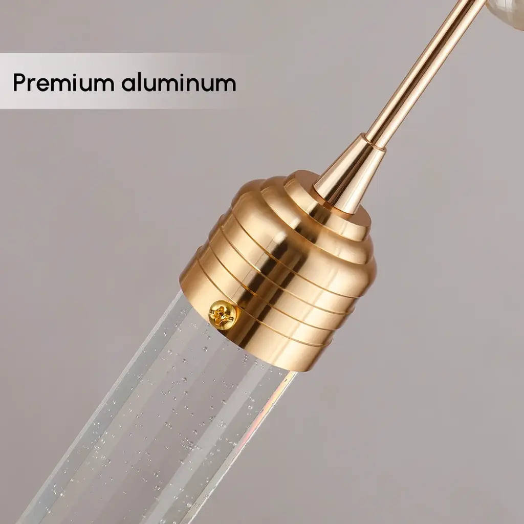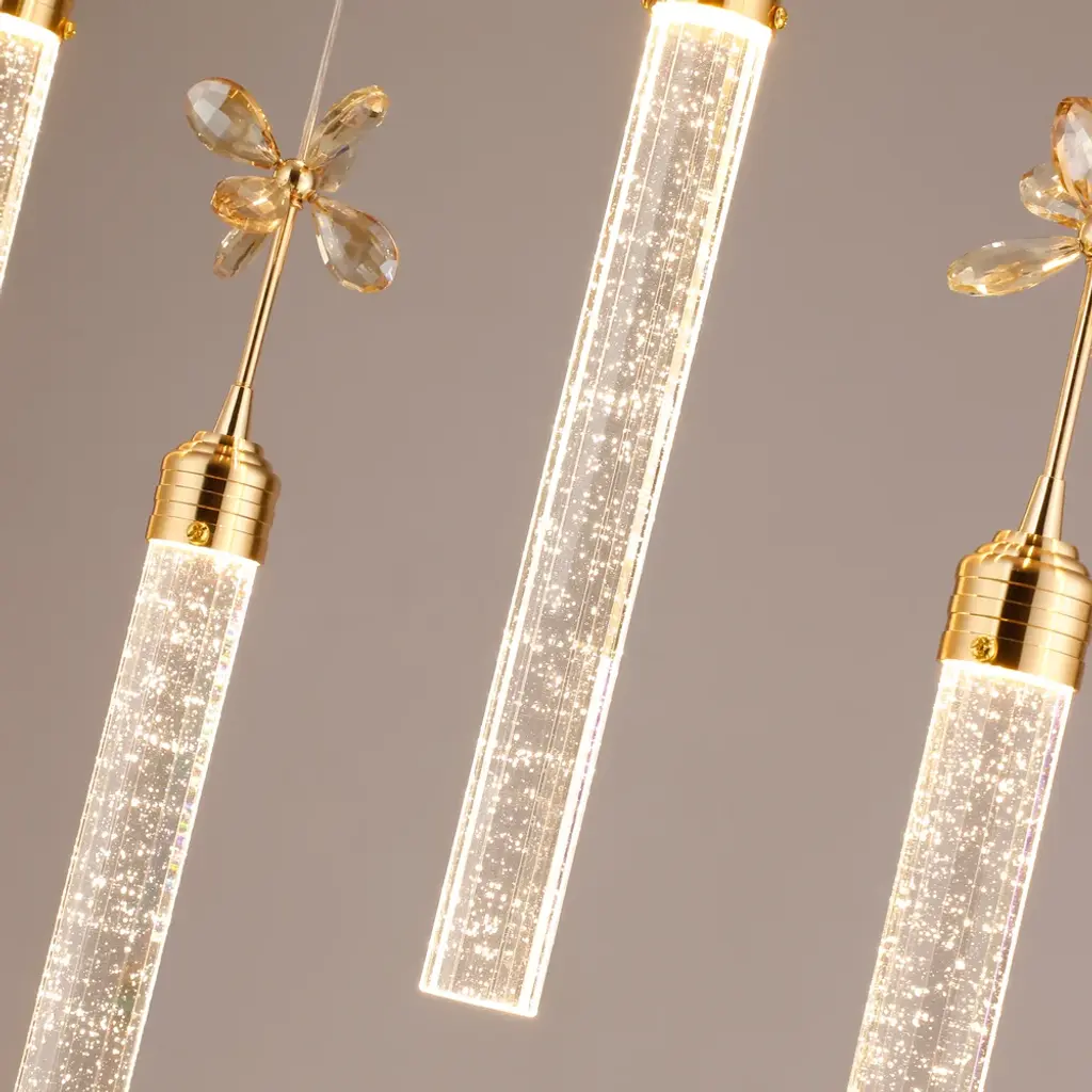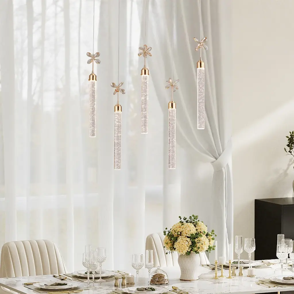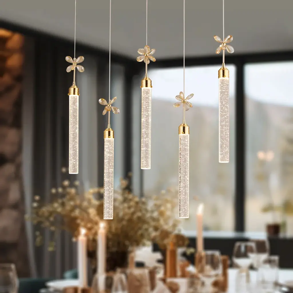 Illuminate your dining space with refined elegance using this luxury gold pendant chandelier. Measuring 28.3 inches wide, this fixture features five graceful pendant lights suspended from a sleek rectangular gold ceiling plate. Each pendant showcases a crystal-textured acrylic tube topped with a delicate flower design, combining artistic beauty with modern lighting function. Built for versatility, this chandelier supports 3 adjustable color temperatures (Warm, Neutral, and Cool White) and stepless dimming for the perfect lighting ambiance. Height-adjustable cables allow for customization according to your ceiling height and layout. A standout feature of this design is the integrated four built-in ceiling spotlights on the canopy, which enhance the overall brightness and highlight the pendants below — perfect for both ambient and task lighting. Ideal for dining areas, living rooms, kitchen islands, bars, or foyers, this chandelier brings both beauty and brilliance to your space.