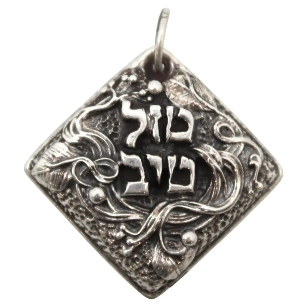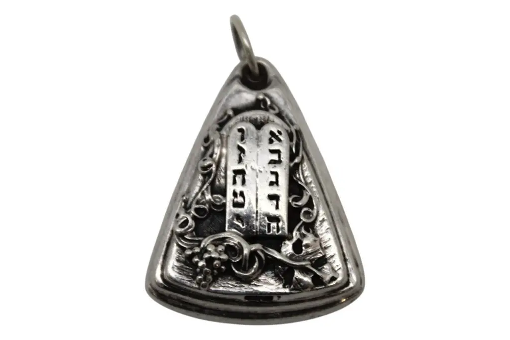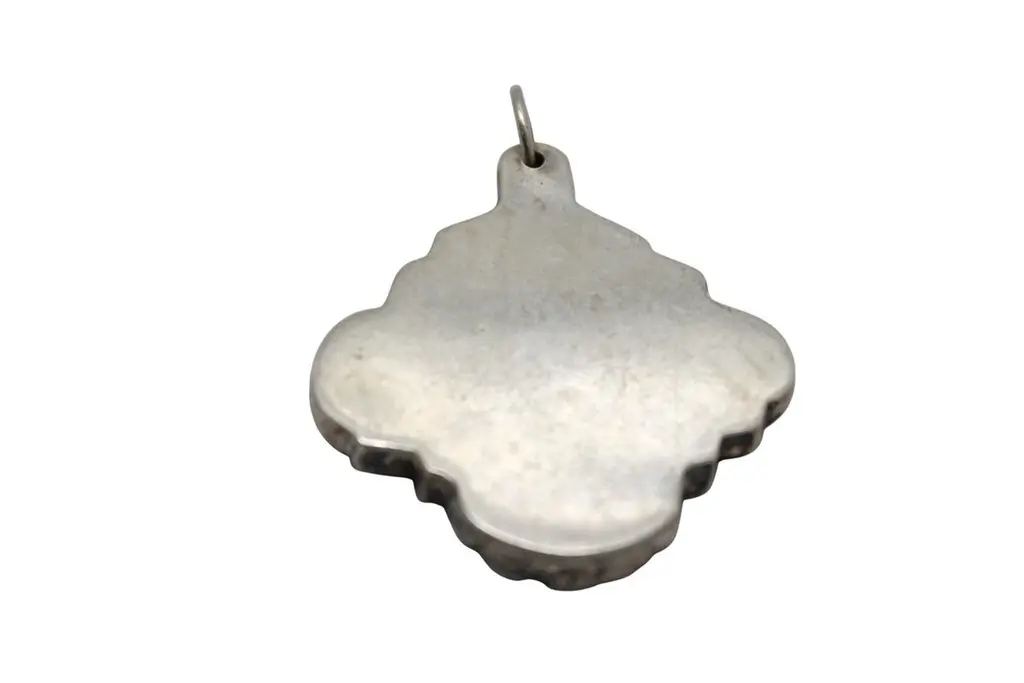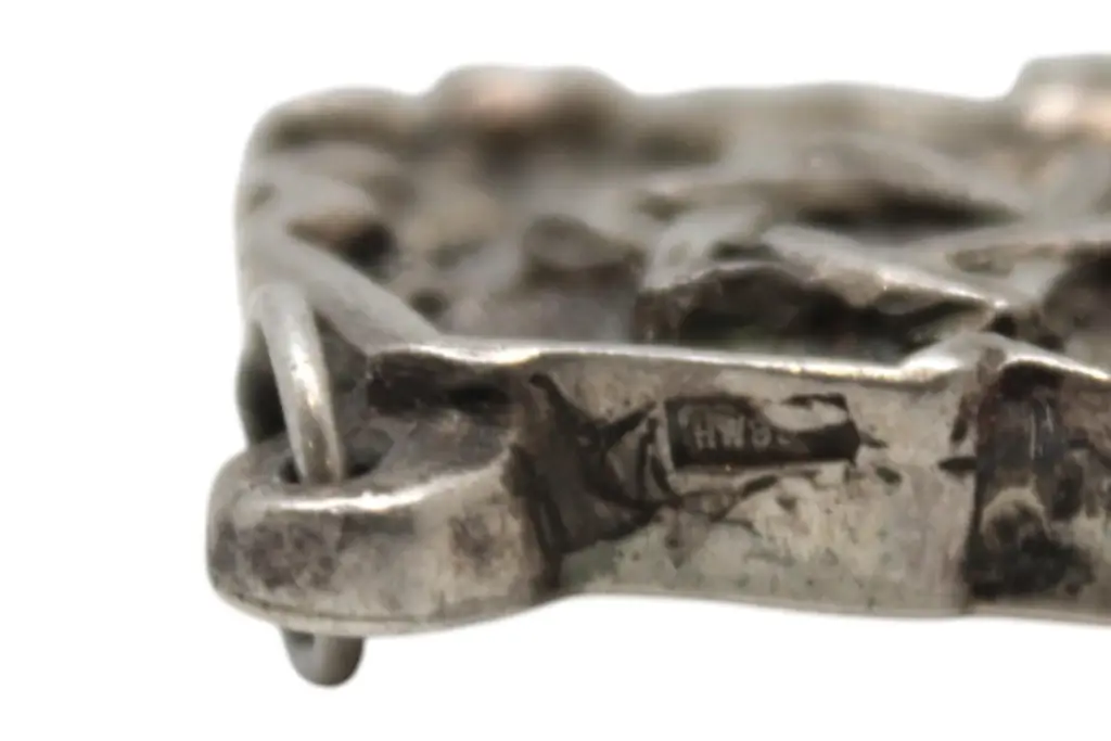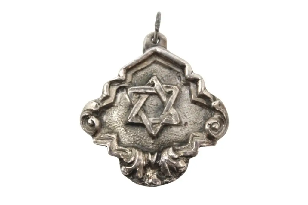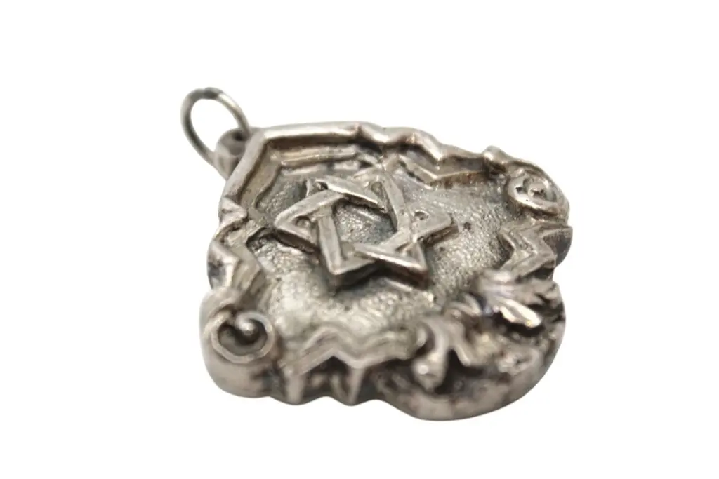 A striking and richly detailed silver Judaica pendant by renowned repoussé master Henryk Winograd, crafted in a rounded diamond form and displaying Winograd’s signature artistry in both design and symbolism.At the center of the pendant is a boldly embossed Star of David, rendered in high relief and framed against a textured pockmarked background that gives the design visual depth and an almost radiant appearance. The surrounding border is elegantly stepped and raised, giving the piece a sculptural and dimensional presence.The border features C-scroll motifs at each corner, along with foliate Art Nouveau-style scrollwork at the base, lending the pendant a graceful and flowing aesthetic. The fusion of classical Judaic symbolism with decorative flourishes reflects Winograd’s masterful approach to repoussé silversmithing.A small hole at the top, fitted with a silver loop, allows the pendant to be worn around the neck as a meaningful and beautifully crafted item of wearable Judaica.An expressive and timeless piece, showcasing Henryk Winograd’s dedication to fine silverwork and the preservation of Jewish artistry..40ozt