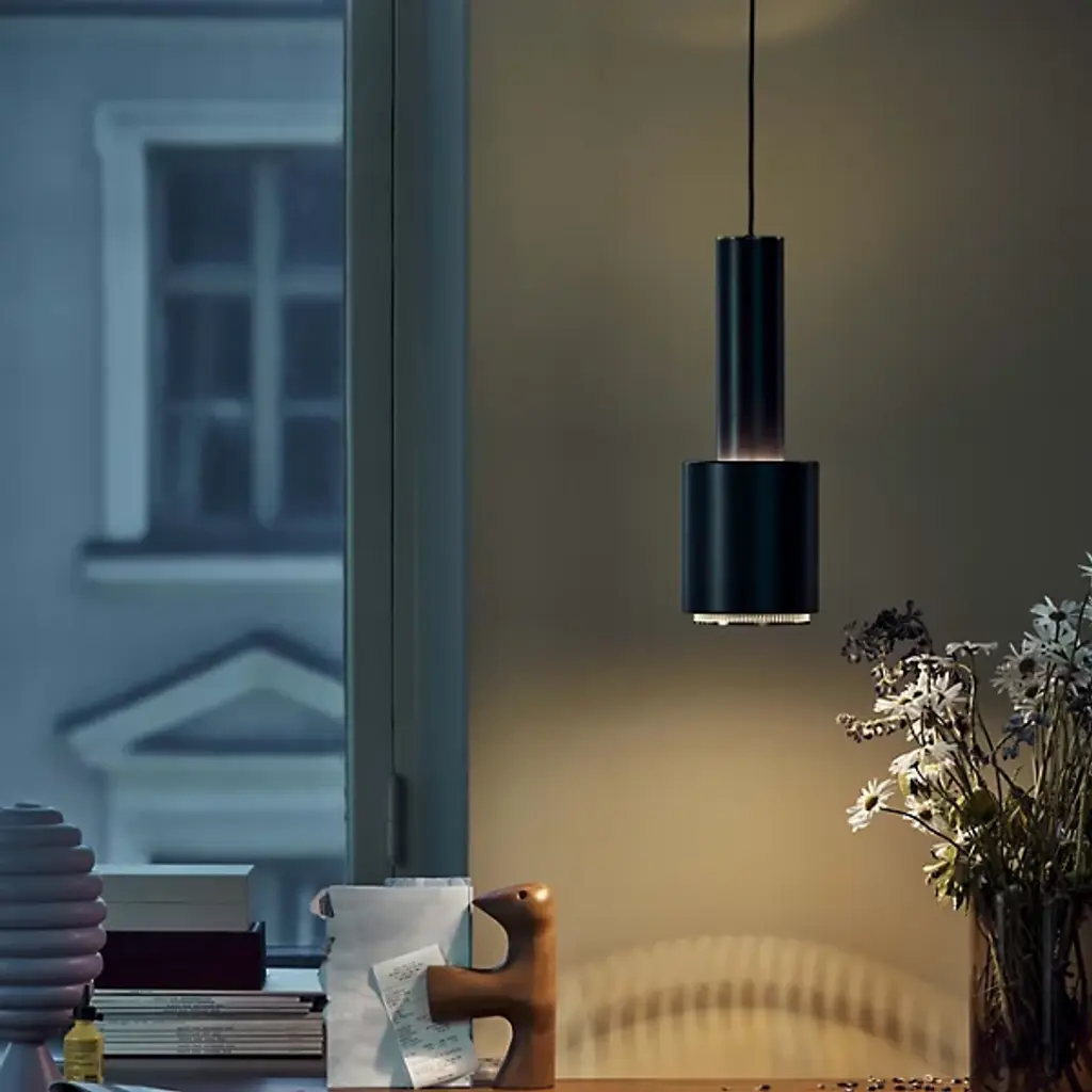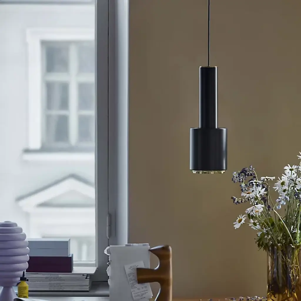 No detail spared. A stunning contemporary look with a purely functional build quality – the A110 Pendant by Artek uses a starkly contrasting finish on different components to offset the brilliant directional light output. The pairing of satin paint in striking, bold paint colors with the brass accent ring at the bottom of the pendant gives a touch of class, while still exuding a calm, understated attitude from the light fixture. A perfect choice in lighter spaces where the fixture needs to be seen but isn't the main design feature.