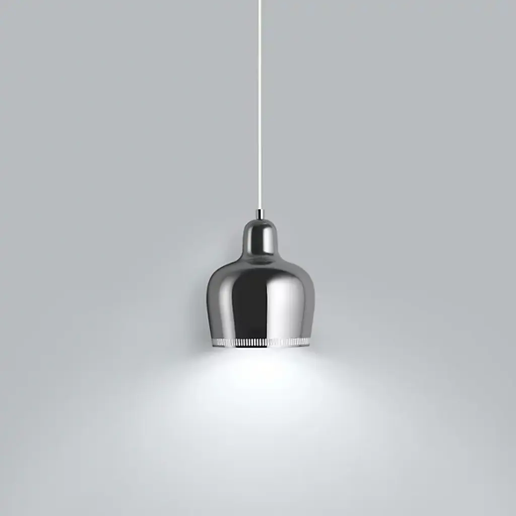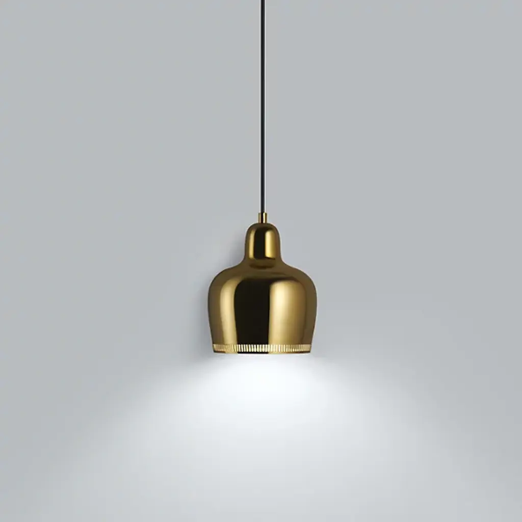 The Artek A330S Pendant, also known as the Golden Bell, was originally designed in the 1950s for large building projects. It first appeared in the teachers' lunchroom at the Finnish University of Jyvaskyla. The Artek A330S is a simplified version of the A330, featuring a solid body versus the more segmented look of the A330.