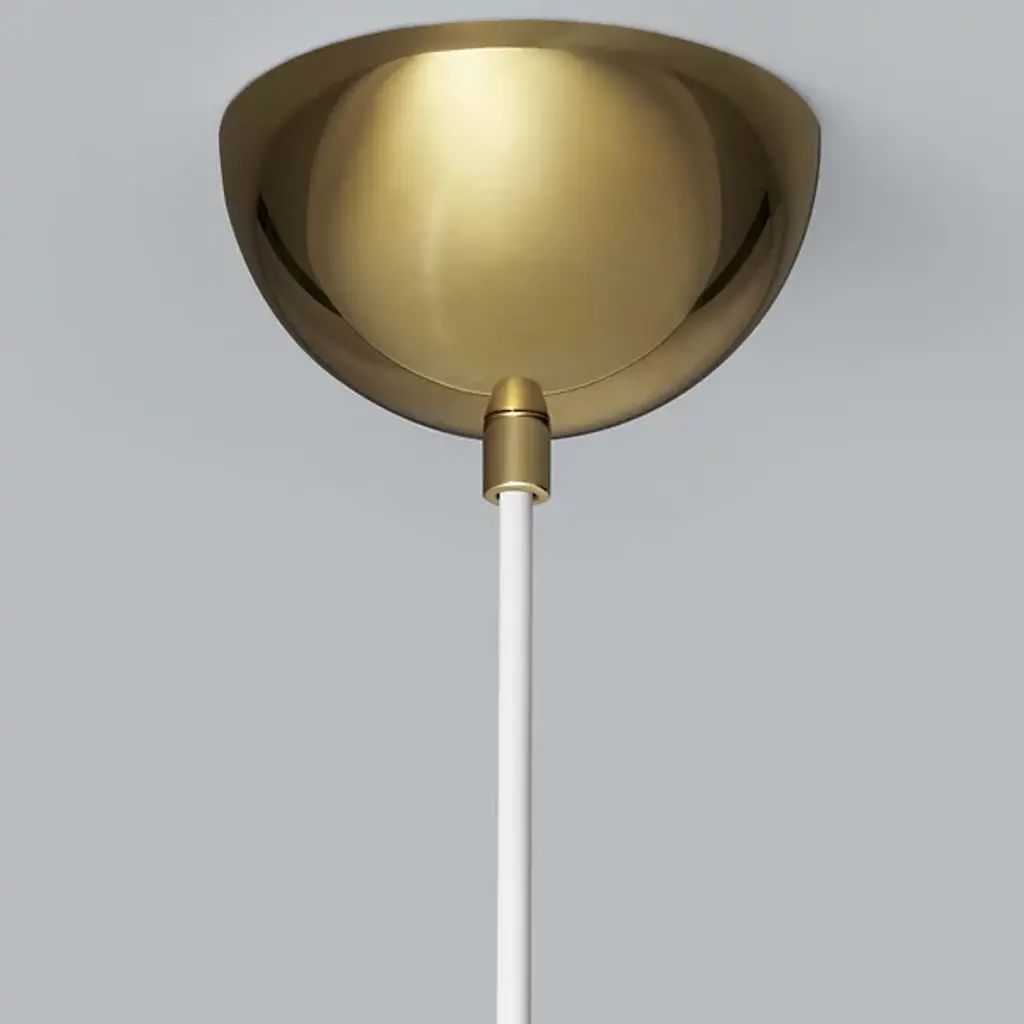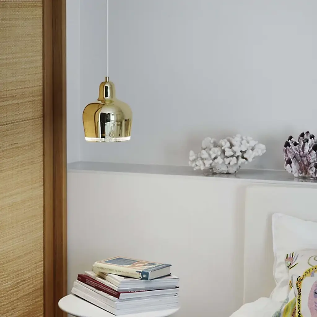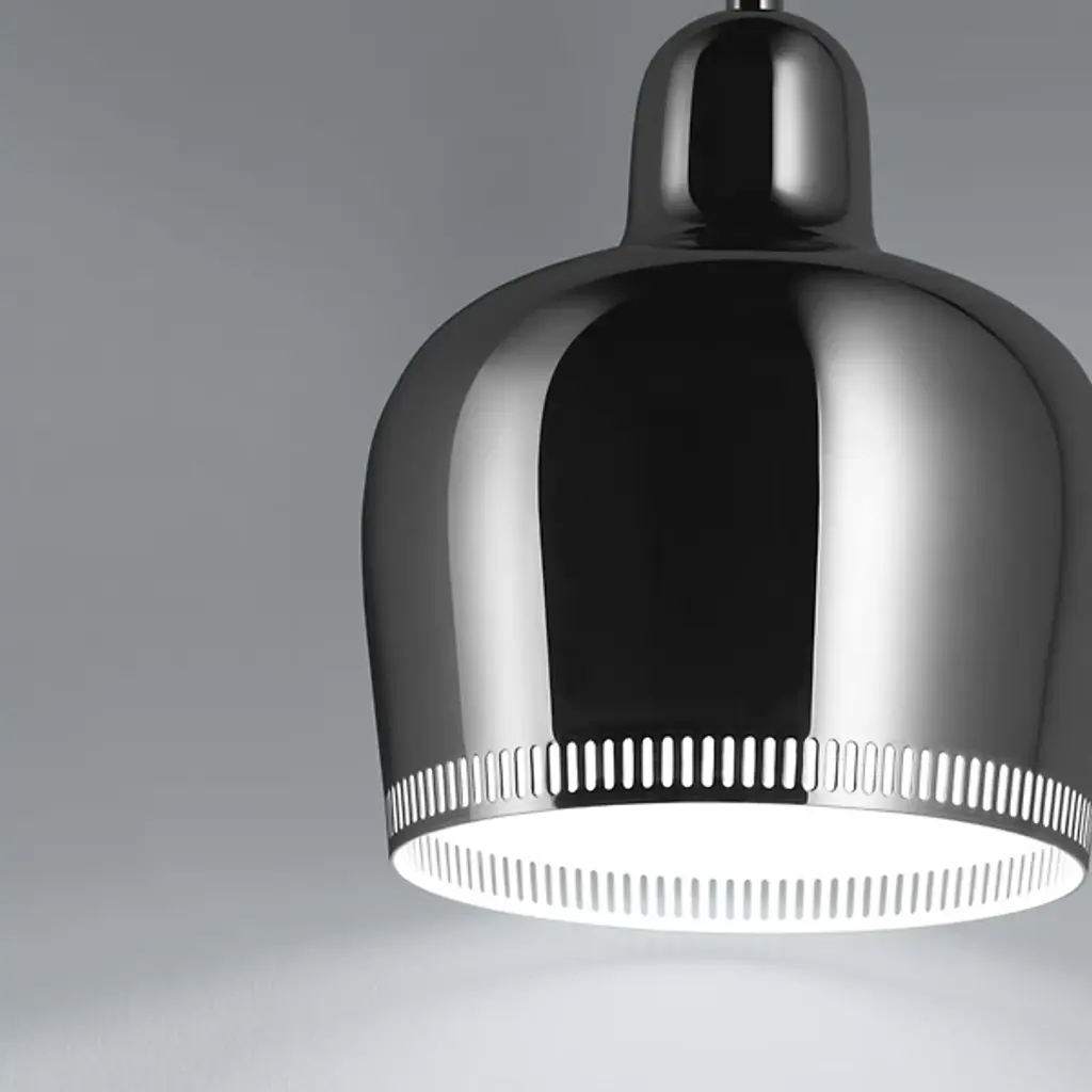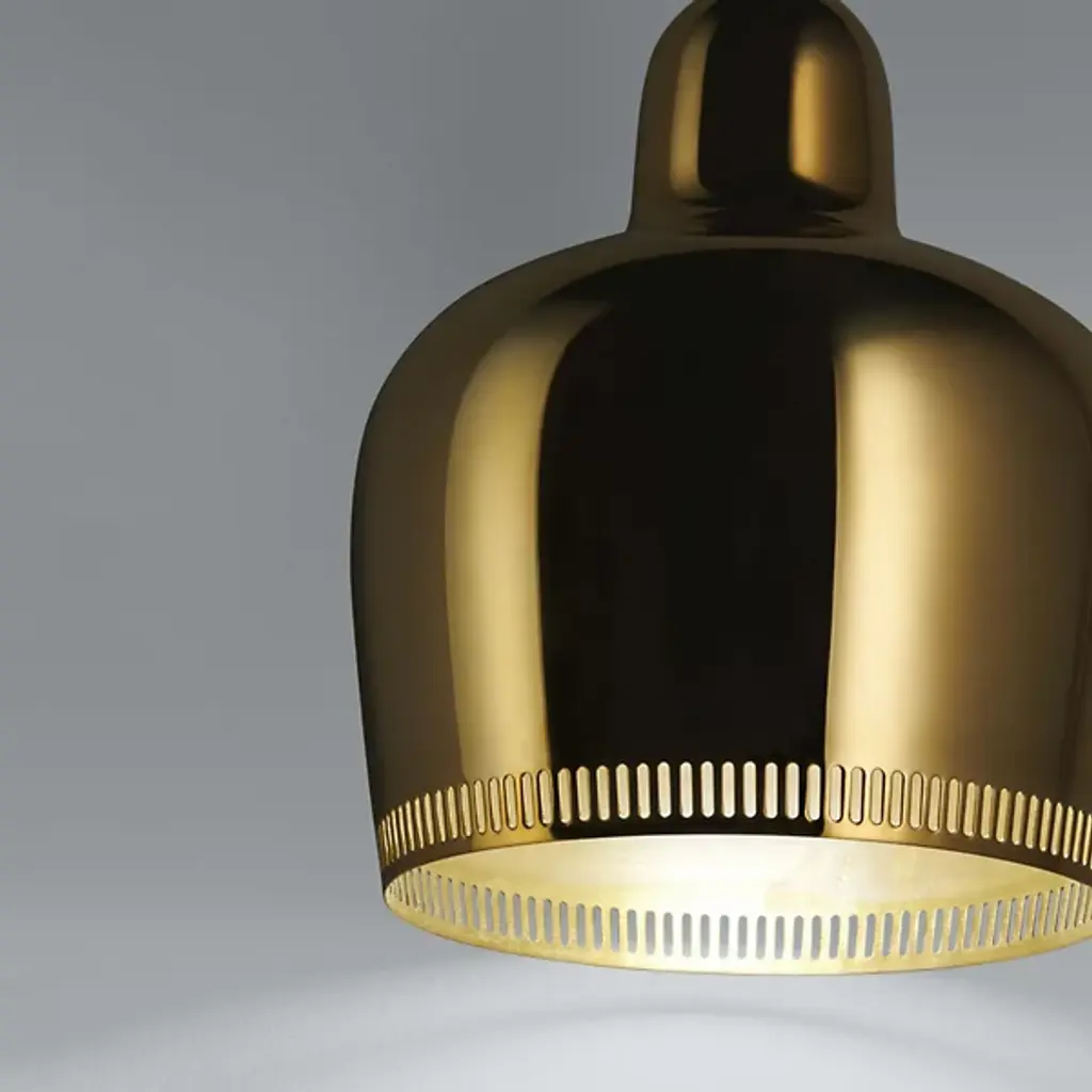 The Artek A330S Pendant, also known as the Golden Bell, was originally designed in the 1950s for large building projects. It first appeared in the teachers' lunchroom at the Finnish University of Jyvaskyla. The Artek A330S is a simplified version of the A330, featuring a solid body versus the more segmented look of the A330.