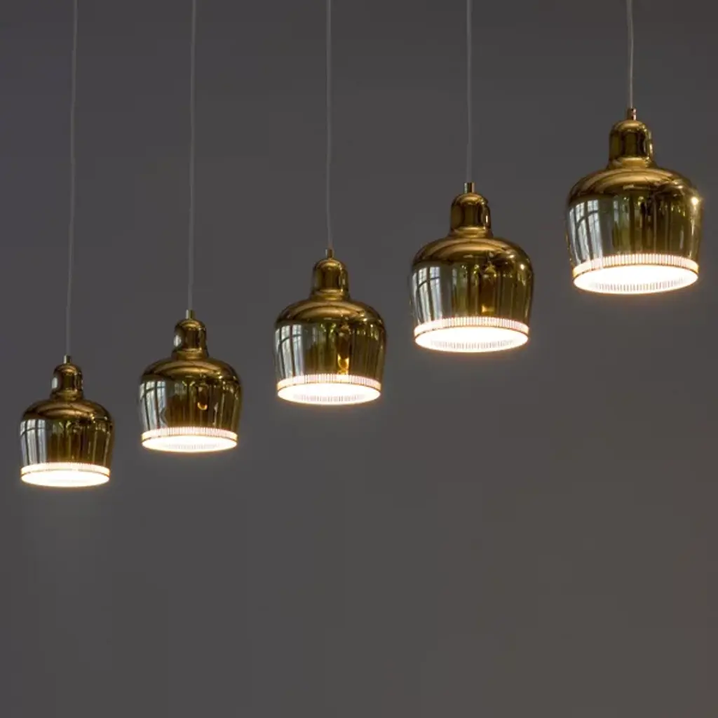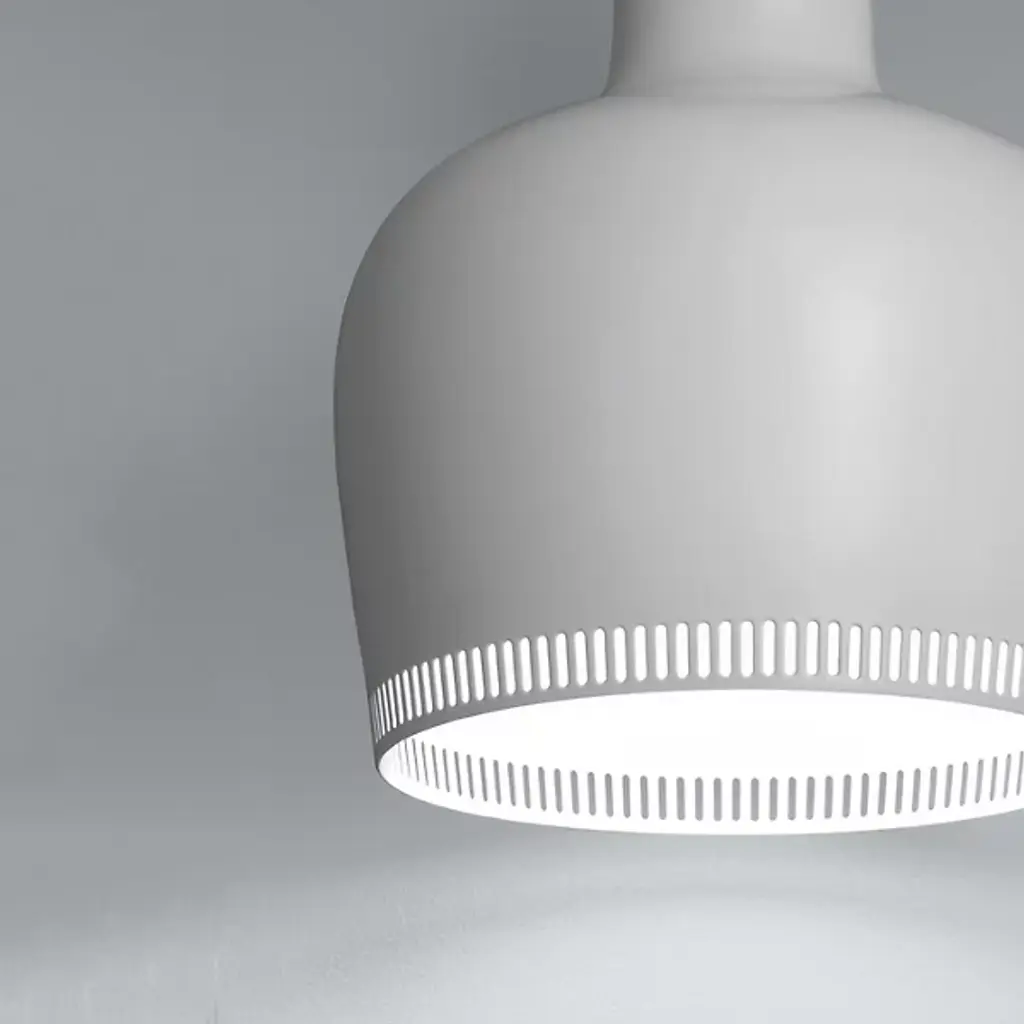 The Artek A330S Pendant, also known as the Golden Bell, was originally designed in the 1950s for large building projects. It first appeared in the teachers' lunchroom at the Finnish University of Jyvaskyla. The Artek A330S is a simplified version of the A330, featuring a solid body versus the more segmented look of the A330.
