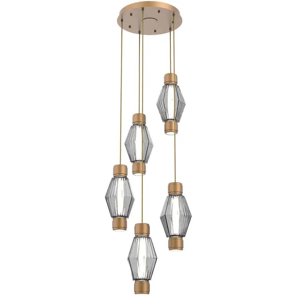 Mandrel Round 5pc Multi-Pendant - Aalto-Metallic Beige Silver-Smoke Blown Glass-Cloth Braided Cord-LED - 3000K