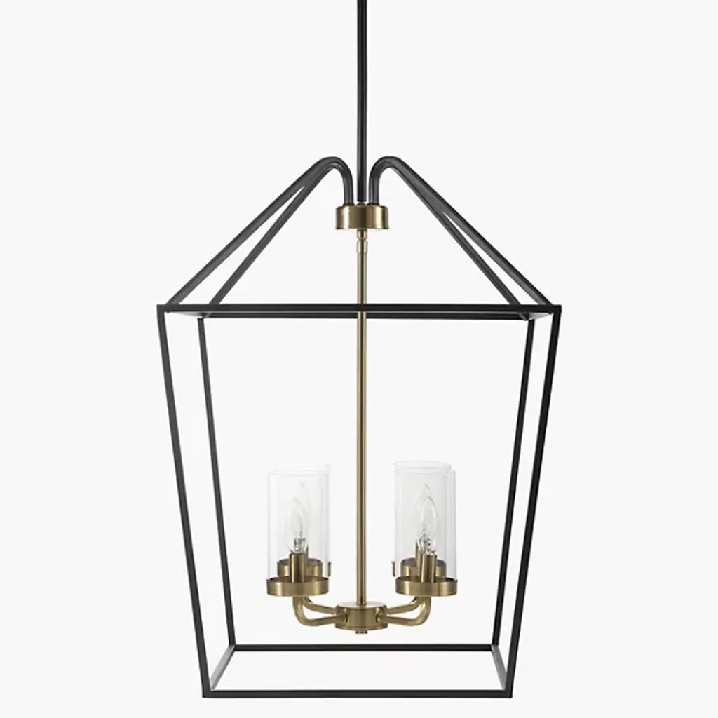 The Aaron 4 light chain hung pendant featuring stagged height light sockets, satin brass accents highlighting the clear acrylic cube surrounded by a larger flat black cage.
