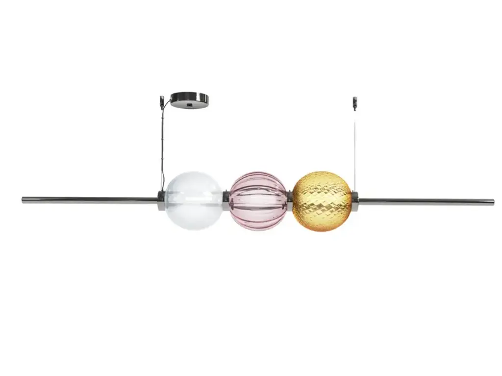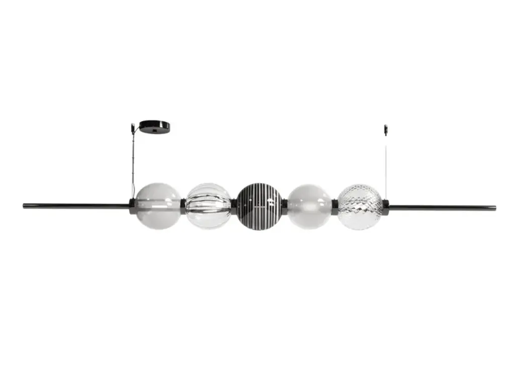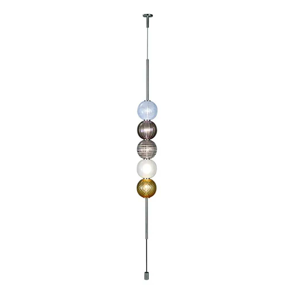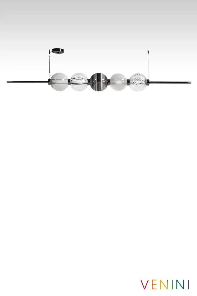 Abaco is a suspension lamp in blown glass. Calculations, numbers, man’s endless attempt to rationalize an otherwise intuitive world. All this enclosed in a unique work by Monica Guggisberg and Philip Baldwin. Crafted with spheres of light, it is the utmost expression of beauty. Abaco is available as a pendant light, a wall light and a ceiling light.Colors:- MILK-WHITE filigree CRYSTAL / straight rigadin CRYSTAL / MILK-WHITE spiral MOLE / satin CRYSTAL / balloton CRYSTAL- BLUE filigree MILK-WHITE / AMETHYST rigadin straight / MATT spiral MILK / satin CRYSTAL / AMBER ballotonLight source:5 x max 12W LED R75“Twenty years have passed since we first developed this iconic lamp for Venini. To celebrate Its longstanding success we have created two new variations to explore and expand its fuller possibilities. When creating Abaco we were inspired by the universality of the sphere. A symbol that resonates with one and in all cultures. It gives us great pleasure to know Abaco is found in homes throughout the world. It successfully represents Venini’s almost 100 years of commitment to originality, creativity and excellence. It’s an honour to be a part of this great tradition.”(Monica Guggisberg, Philip Baldwin)“ One the one hand, the sphere: the most ubiquitous form in the known universe. On the other, mathematical calculation: counting, numbers, man’s endless attempt to rationalize an otherwise intuitive world. But nevermind this the spheres exude light, the source of intelligence, heated expression, and beauty”.(Monica Guggisberg, Philip Baldwin)