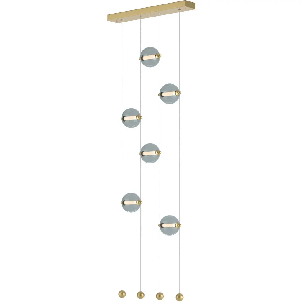 Perfect as a space divider, on either side of a headboard, or simply as a whimsical art installation, the Abacus 6-Light Ceiling-to-Floor LED Pendant features six blown glass globes. With adjustable height cables, the Abacus can be customized to suit any space. True to its namesake, the Abacus globes can be moved up and down their low-voltage cable "rails" by virtue of tiny grippers on each side, to customize each globe's position, with small, solid steel balls anchoring each cable.