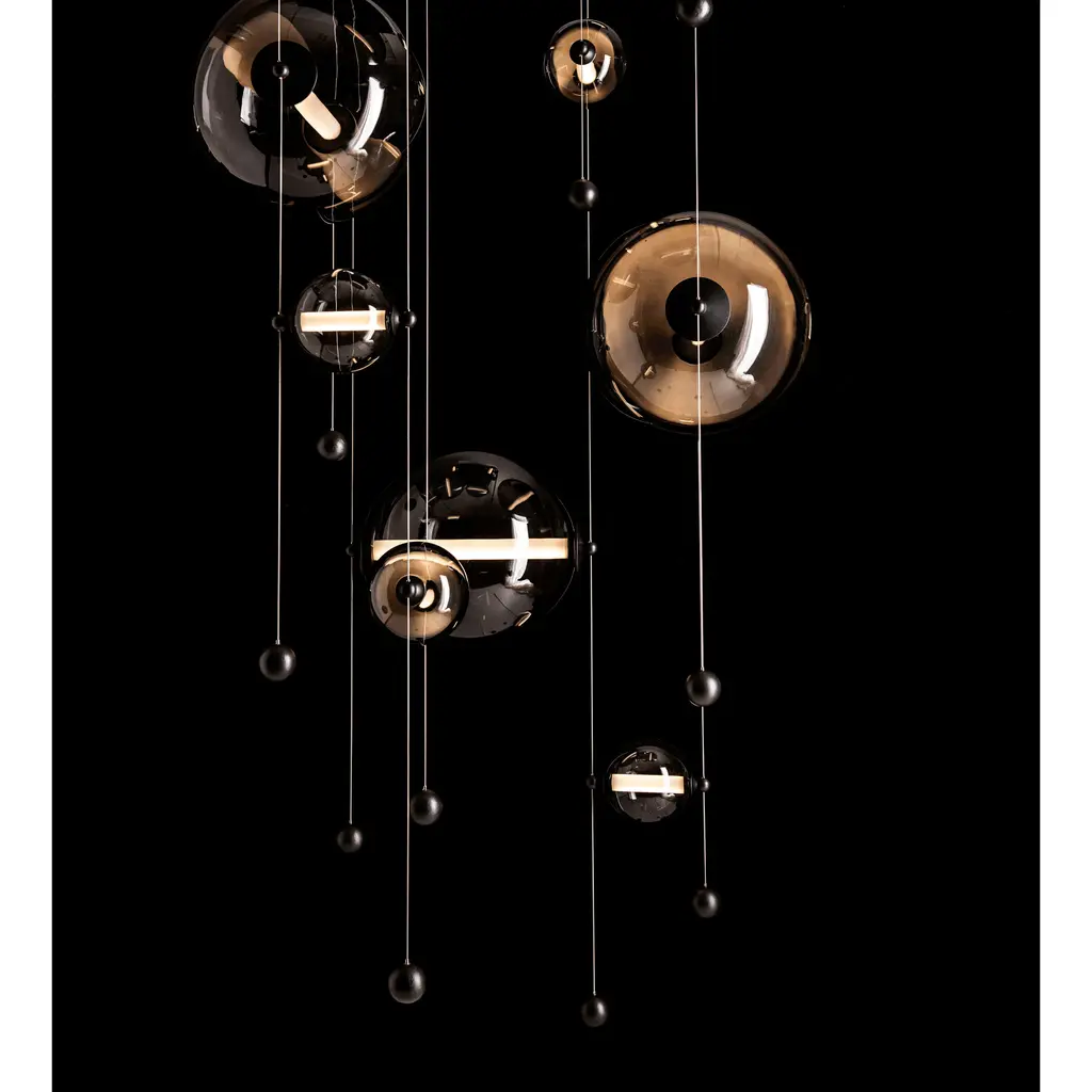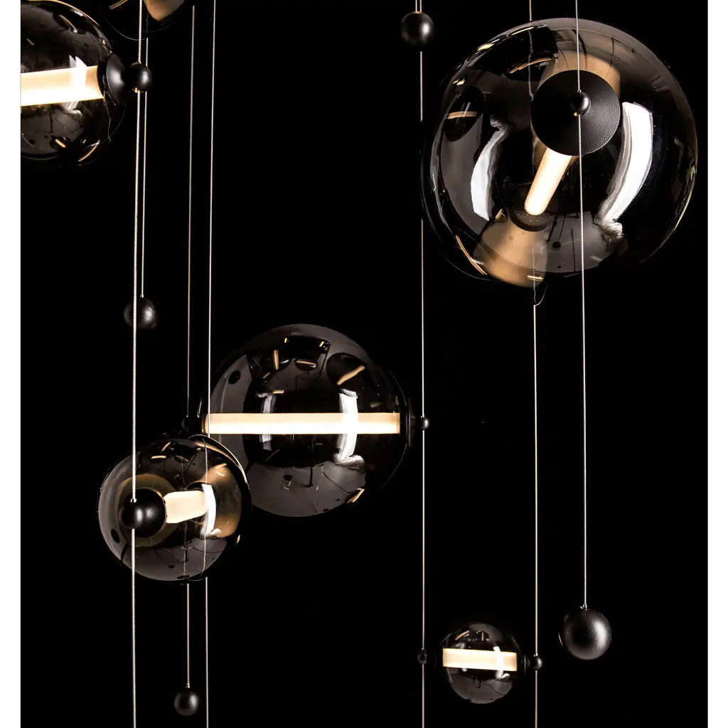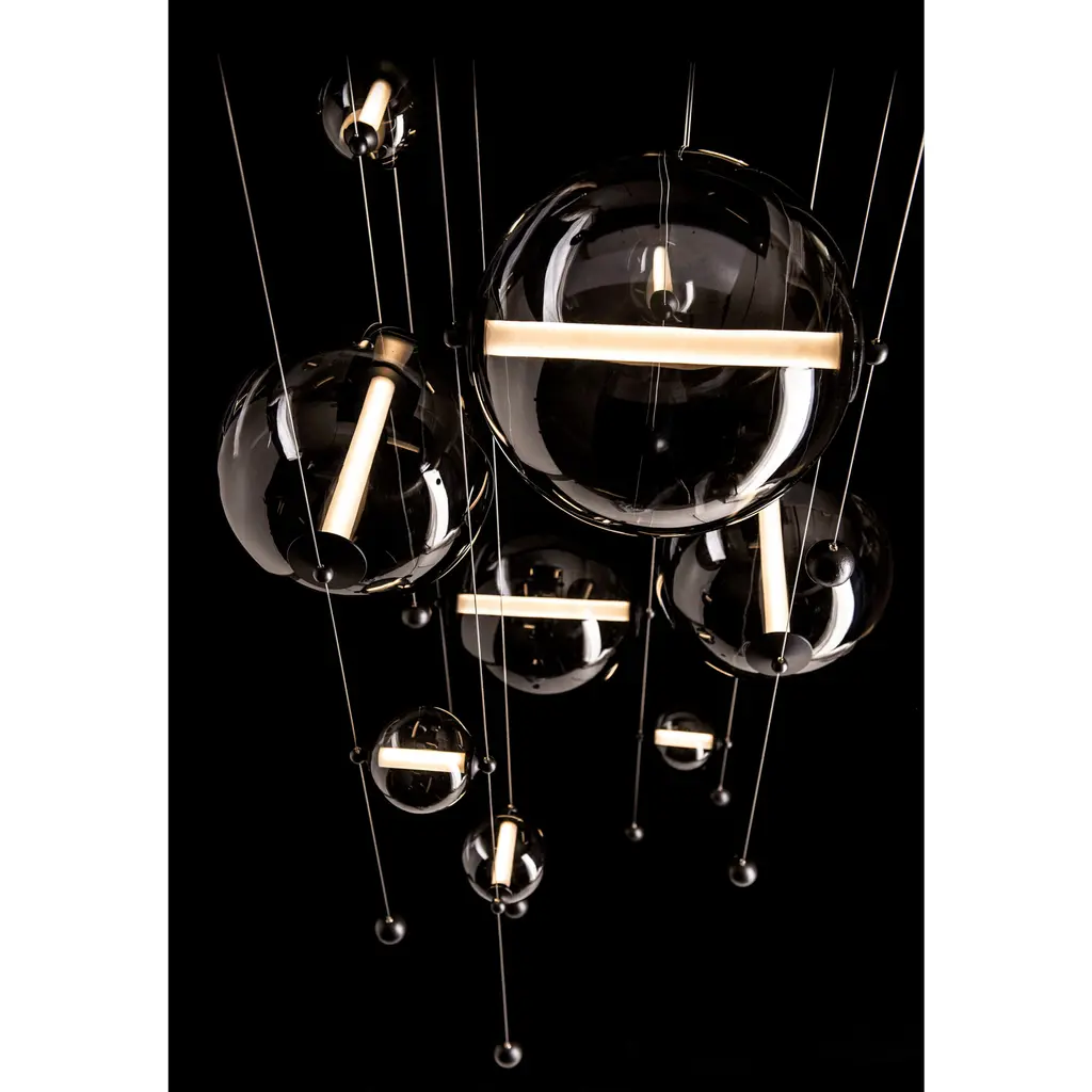 The award-winning Abacus Collection adds a new design to its portfolio with the Abacus Square Pendant. A square canopy and multi-dimensional design allows for low-voltage cables to suspend large and small glass globes at customized heights on each set of cable "rails". Perfect for grand spaces where the cascading globes create a focus, or for stairwells or entryways.