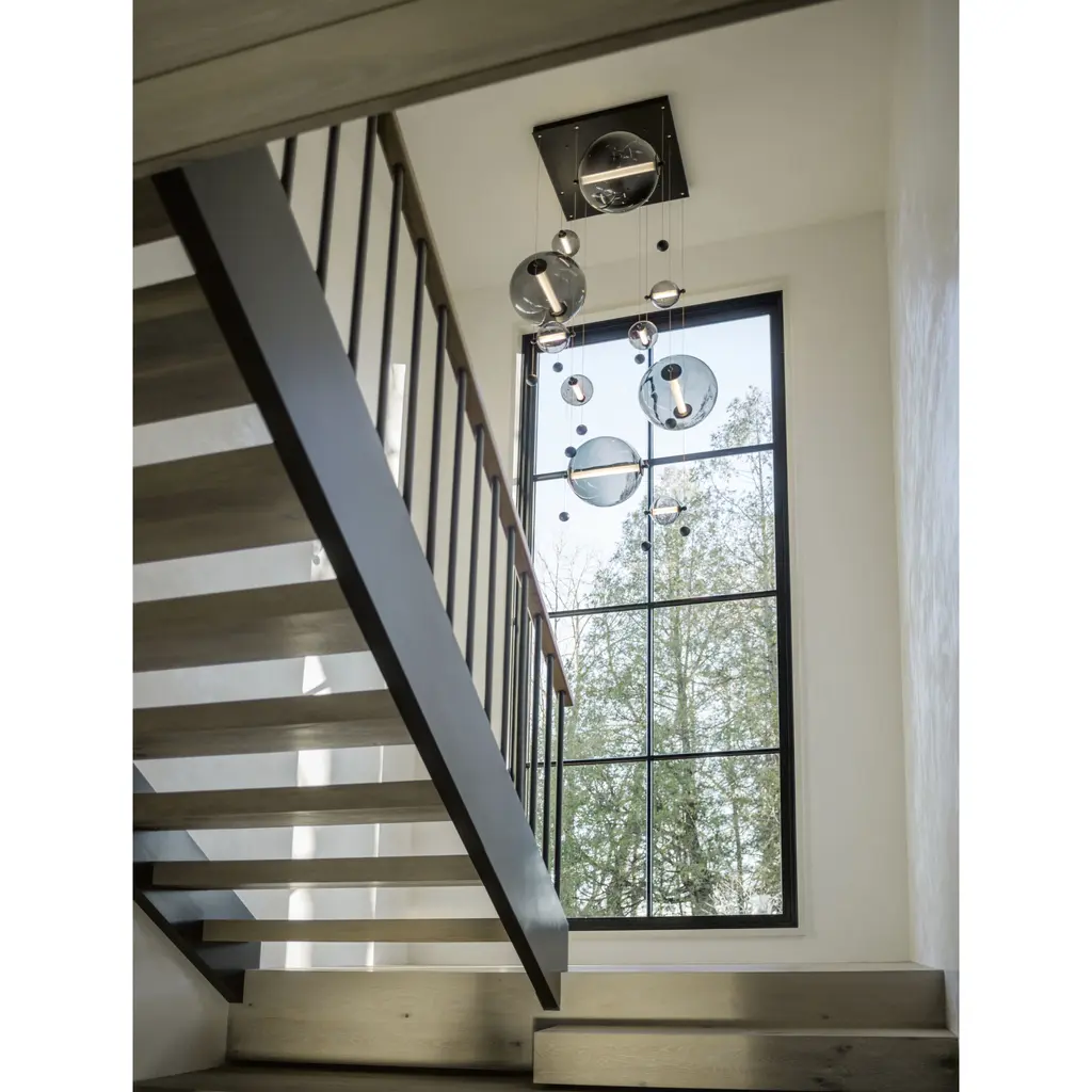 The award-winning Abacus Collection adds a new design to its portfolio with the Abacus Square Pendant. A square canopy and multi-dimensional design allows for low-voltage cables to suspend large and small glass globes at customized heights on each set of cable "rails". Perfect for grand spaces where the cascading globes create a focus, or for stairwells or entryways.