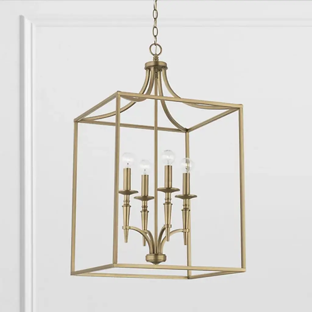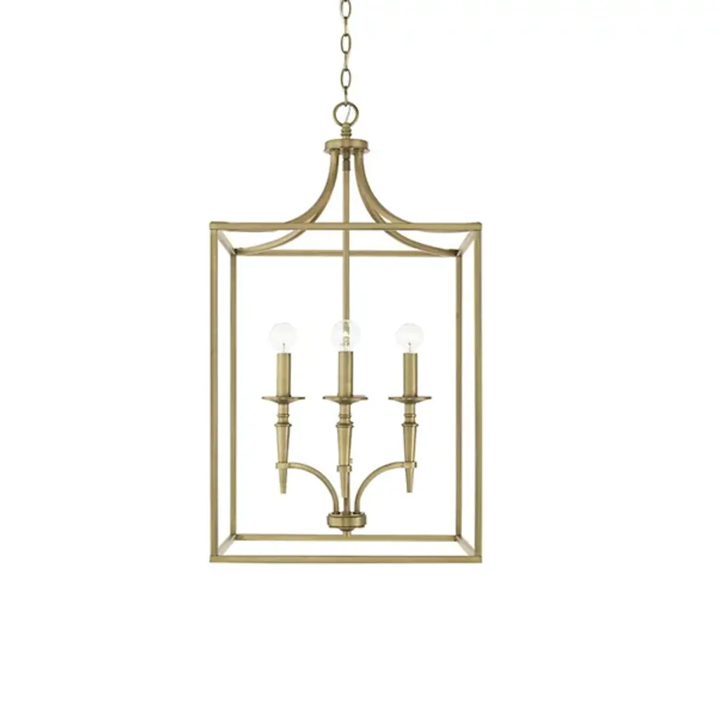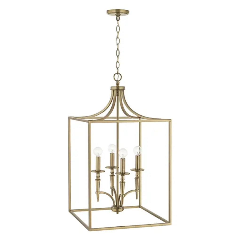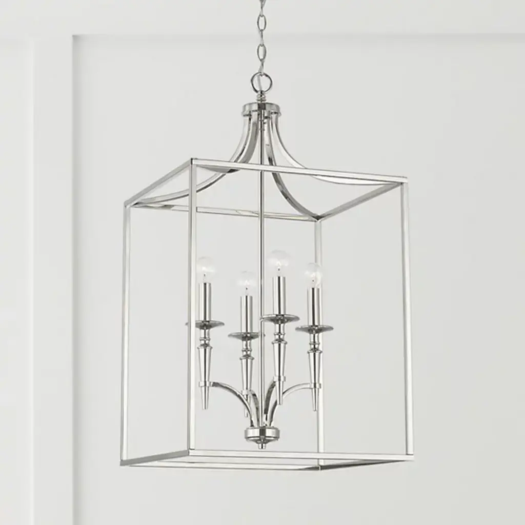 Introduce a clean, modern piece with a geometric appeal to the rooms of your modern home with the Abbie Pendant from Capital Lighting. A simple chainlink lowers from the ceiling, leading to a central disc and a set of arcing arms that lead to a rectangular-shaped frame. The body is open on all sides, showcasing a set of candelabra-style bulbs that hang at the center. The light is bright and even, spreading with ease throughout the room.